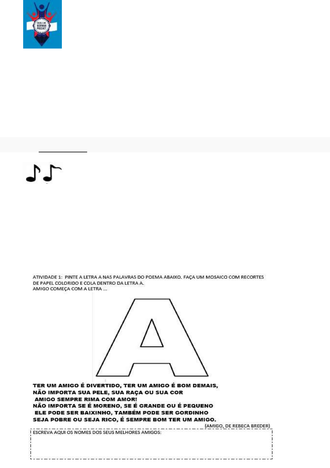 ESCOLA MUNICIPAL NORMAN PROCHET PROFESSORA: LUZIA MEDEIROS RESUMO ENCONTRO VIRTUAL DA TURMA 2º ANO-A DATA: 22/02/2021 HORÁRIO: 9H ACOMPANHAMENTO E PARTICIPAÇÃO ESPECIAL: FAMÍLIA DOS ALUNOS(AS) TEMA: AMIZADE 1. ACOLHIDA: Iniciei o encontro fazendo a chamada, em seguida cantei uma canção de recepção, em que citei os nomes das crianças presentes. MÚSICA DE BOAS-VINDAS Compositor: Marcelo Serralva Hoje, estou aqui... Pra receber vocês, nessa manhã tão linda, eu digo boas vindas e canto outra vez... Hoje, estou aqui... Pra receber vocês, nessa manhã tão linda, eu digo boas vindas e conto 123... Bem vindo, bem vinda... como vai? (2x) 2. RODA DE CANTORIA: vamos ensaiar a música Boas Vindas. 3. HORA DA LEITURA E DA ESCRITA: Li para os alunos o texto: Amigo, DEPOIS deveriam pintar a letra A em cada palavra do texto. A tarefa: decorar a letra A, ficou para ser feita após a aula e deverá ser mostrada amanhã, terça-feira 4. . https://www.youtube.com/channel/UCFnR55TAil_DDxZ6gXrhwtQ 5. RODA DE CONVERSA: Perguntei aos estudantes em qual mês fazem aniversário, cada um terve que escever o mês de seu aniversário na folha do caderno de desenho. “Cantamos Parabéns pra você” para a Alice, ela fez aniversário no dia 17 de fevereiro. Os alunos sugeriram que a folha do caderno com o mês do aniversário fosse decorada com desenhos ou adesivos. 6. Brincadeiras de agilidade de raciocínio: Pedi aos alunos que tentassem adivinhar qual é o mês do ano em que não há nenhum aniversariente na sala. Cada criança teria que falar um mês. Na primeira rodada ninguém acertou, na segunda rodada duas crianças acertaram: Yuri e Maria Eduarda Medina. 7. MOMENTO SURPRESA! Disse aos alunos que quem acertasse o mês do desafio acima ganharia um brinde surpresa que irá junto com o próximo kit. 8. DESPEDIDA: Cantamos a música: BOAS-VINDAS, do Compositor: Marcelo Serralva Resumindo... Muita ALEGRIA, DIVERSÃO E APRENDIZAGEM https://www.youtube.com/channel/UCFnR55TAil_DDxZ6gXrhwtQ