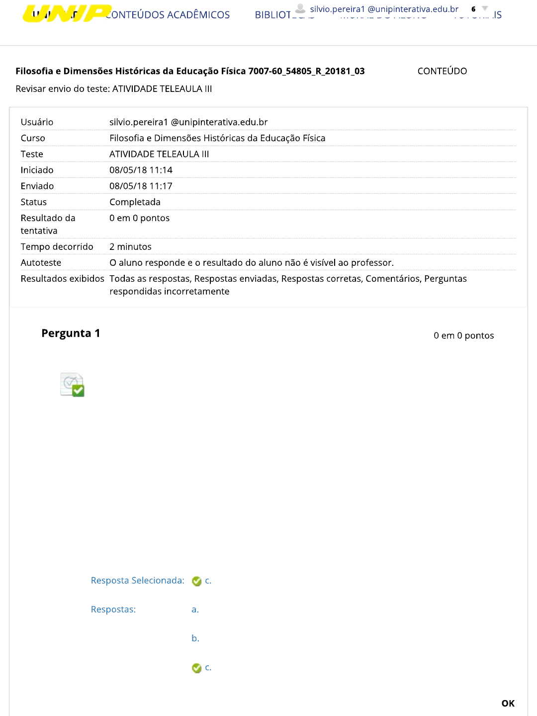 A prática pedagógica acima descrita apresenta sérias limitações, ainda hegemônicas na educação física brasileira, que precisam ser superadas. Para isso, sugere-se direcionar a prática pedagógica: I. Ao ensino das competências técnicas, vinculadas à educação de resultados, conforme o planejamento do professor. II. Em consonância com a aquisição de habilidades relacionadas ao desempenho. III. Ao cotidiano, trabalhando, a partir do conhecido, as possibilidades de aprendizagem da cultura corporal. IV. Ao contexto histórico e social de cada conteúdo e às possibilidades expressivas, críticas e criativas. Estão corretos somente os itens: III e IV. I e II. II e III. III e IV. ← Revisar envio do teste: ATIVIDADE TELEAULA III – 7007-60... https://ava.ead.unip.br/webapps/assessment/review/review.jsp?attempt_i... 1 de 4 08/05/2018 11:17 I, II e III. I, III e IV. c Como foi vista a participação da mulher na educação física brasileira no início do século XX? A mulher tinha restrições quanto a prática, pois era tida como sexo frágil e devia preservar sua função reprodutiva. A mulher era proibida de fazer qualquer atividade física. A mulher tinha restrições quanto a prática, pois era tida como sexo frágil e devia preservar sua função reprodutiva. A mulher podia fazer as mesmas atividades que os homens, pois o mundo moderno já era livre de preconceitos. A mulher podia exercitar-se apenas com séries de força, saltos e lutas. As mulheres podiam praticar o futebol, mas apenas pelas manhãs. Resposta: b Nos últimos 20 anos a educação física passou por transformações significativas no que se refere ao seu planejamento pedagógico. Muitas mudanças foram sugeridas, muitos debates ocorreram e hoje é possível afirmar que existe um conjunto de conhecimentos possível de ser identificado como conteúdo da educação física escolar. Revisar envio do teste: ATIVIDADE TELEAULA III – 7007-60... https://ava.ead.unip.br/webapps/assessment/review/review.jsp?attempt_i... 2 de 4 08/05/2018 11:17 Nesse sentido, levando em consideração a síntese das muitas concepções já publicadas, podemos afirmar que são conteúdos gerais: Ginásticas, esportes, lutas, danças e jogo. Ginásticas, esportes, lutas, danças e jogo. Brincadeiras, recreação, passeios e natação. Passeios, estética, treinamento, dramatização e jogo. Jogo, competição, atividade física, estética e teatro. Futsal, basquete, vôlei, handebol e atletismo. Resposta: a O Futebol no Brasil teve início no final do século XIX, em 1894 com o retorno de Charles Miller da Inglaterra. Miller foi estudante em Southamptom, na Banister Court School, onde destacou-se como um excelente jogador de football. Trouxe na mala duas bolas, uma bomba, uniforme um apito e um livro de regras. Quem foram os primeiros jogadores nos primórdios do futebol no Brasil? Membros da aristocracia e trabalhadores de empresas estrangeiras que se reuniam em clubes da colônia europeia para jogar de forma amadora. Atletas de outras modalidades esportivas tradicionais no país, tais como o remo e o ciclismo, já praticados em Clubes como O Clube de Regatas Flamengo, ou o Sport Club Corinthians Paulista na virada do século. Jogadores amadores da periferia das grandes cidades, atletas mulatos e negros, muito habilidosos devido aos campos irregulares e bolas de meia. Membros da aristocracia e trabalhadores de empresas estrangeiras que se reuniam em clubes da colônia europeia para jogar de forma amadora. Revisar envio do teste: ATIVIDADE TELEAULA III – 7007-60... https://ava.ead.unip.br/webapps/assessment/review/review.jsp?attempt_i... 3 de 4 08/05/2018 11:17 Jogadores profissionais contratados de equipes federadas da Europa, entre eles Oscar Cox da Suíça e Hans Nobiling da Alemanha. Marinheiros de embarcações inglesas que atracavam no porto de Santos e jogavam na praia e nos terrenos baldios da Várzea. Resposta: c Revisar envio do teste: ATIVIDADE TELEAULA III – 7007-60... https://ava.ead.unip.br/webapps/assessment/review/review.jsp?attempt_i... 4 de 4 08/05/2018 11:17
