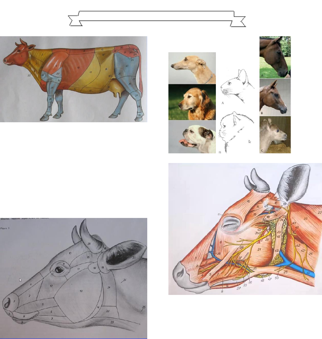 ANATO TOPO Cabeça é separada do corpo por um Plano transversal, passando pela articulação atlantooccipital, bordo caudal da mandíbula: separação que se faz em abates. - Articulação atlantooccipital é do tipo gínglimo que faz movimentos de “sim” – extensão e flexão. A articulação entre o atlas e o áxis (segunda vértebra cervical) faz o movimento “não”, sendo uma trocóide, pois faz movimento circular (gira ao redor). Essas duas agem em conjunto para a movimentação da cabeça. 13- região massetérica, 21-região parotídea, 18- articulação temporomandibular (sinovial, do tipo gínglimo; possui 2 elementos salientes, os côndilos da mandíbula com os côndilos do temporal e entre eles um disco articular), 17- arco zigomático, 1-nasal dorsal, 2- nasal lateral, 5,6 e 7 região bucal dorsal, média e ventral, bucinador não aparece nessa imagem. 21- masseter, 20- parótido auricular (ele pode sair junto com o cutâneo da face), 45- linfonodo parotídeo, 28- ramos do nervo facial, 31- artéria tranversa da face (entra no músculo masseter), 28- ramo bucal dorsal do facial, 31- nervo transverso da face (ramo do 5º par craniano, trigêmeo; esse ramo vem do aurículotemporal ramo motor da parte mandibular do trigêmeo), 25- músculo esternomandibular (cão e ovelha n tem), 5- m. zigomático (do ângulo da boca ao arco zigomático), 7- bucinador, 8- m. depressor do lábio inferior (cão não tem), 1- elevador nasolabial, 2,3,4 origem comum próximo a um forame; elevador do lábio superior, canino e depressor do lábio superior, 38 subindo- veia angular do olho e veia dorsal do nariz se unem formando a veia facial (seguindo caudal), 50- (recebe a lingual e forma a) veia linguofacial, 49- veia maxilar, 44- veia jugular externa, incisura dos vasos faciais: ponto de tomada de pulso em bovino e cavalo, 36- artéria facial que se origina do tronco linguofacial com percurso conjunto a veia facial, 37- (verde) ducto parotídeo que percorre primeiro o espaço intermandibular, contorna a incisura da mandíbula, e se abre na bochecha a nível de 3º molar, 30- ramo bucal ventral do facial que vai até o músculo depressor do lábio inferior e possui uma anastomose com o bucal dorsal. *nervo facial é um nervo par craniano 7, misto (motor e sensitivo, mas o que está na imagem é a parte motora que dá a expressão facial). * nervo trigêmeo tem partes oftálmica, maxilar, mandibular. Ducto parotídeo passa pela lateral do masseter, sem músculo esternomandibular. 29- linfonodo mandibular (região intermandibular), 32- ramo bucal ventral vem e termina no m. depressor do lábio inferior, ramo bucal dorsal do facial vai para a musculatura lateral do nariz, 30- artéria transversa da face (não entra no masseter) junto a veia transversa da face e o nervo transverso da face (trigêmeo), 5- veia facial que sobe e forma a angular do olho e dorsal do nariz, desce pela incisura dos vasos, 28- veia linguofacial, 27- veia maxilar, 26- veia jugular externa, 10- vestígio do músculo cutâneo da face, 34 acima à direita- glândulas bucais ventrais (pequenos grânulos no meio do músculo bucinador), 1-elevador nasolabial, 6 (região)- elevador do lábio superior, canino e depressor do lábio superior, 8- bucinador, 9- depressor do lábio inferior, 6- veia lateral do nariz (nem sempre presente) e veia labial superior (lábio superior), nesse percurso tem a veia labial inferior só que ela fica no meio do bucinador (não visível na imagem). *Sem artéria facial (que passava pela incisura da mandíbula); A artéria transversa da face se expande e irriga essa região, por isso fica sem pulso na incisura. *Face lateral do masseter – com pulsação. Cabra: 16- músculo esternomandibular (alguns chamam de esternozigomático, pois esse tendão vai até o arco zig.), 25- veia facial, 24- veia labial inferior, 23- veia labial superior, 22- veia lateral do nariz, 21- veia dorsal do nariz, 20- veia angular do olho, 28- artéria transversa da face que se divide na artéria labial inferior e labial superior (24-26 ramos da artéria facial), 29- nervo bucal ventral, 28- bucal dorsal, 27- nervo transverso da face, 6- músculo zigomático, 9- músculo depressor do lábio inferior, 25- ducto parotídeo na incisura. *Músculo cutâneo da face dos cães é bem amplo, pois é relacionado ao hábito dos cães de brigarem. *Arco zigomático bem saliente com praticamente só pele cobrindo, sendo um ponto de fraturas em atropelamentos, etc. *Mandíbula do cão tem umas partes sem proteção de musculatura. *Carnívoros possuem a gl. Zigomática. 8- veia facial +32 junção com a veia lingual, 35-veia linguofacial, 34- veia do arco hióideo (arco venoso hióideo), 26- veia maxilar, 41- veia jugular externa, 14- veia labial inferior, 7- veia labial superior, 3- veia lateral do nariz, 2- veia dorsal do nariz, 1- veia angular do olho e músculo elevador nasolabial, 4- m. elevador do lábio superior, 5- ramo bucal dorsal do nervo facial (vai para a lateral do nariz- n. infraorbitário, nervo sensitivo do maxilar do trigêmeo), 12- ramo bucal ventral do nervo facial, 10 e 11- m. bucinador, 6- canino, 15- nervo transverso da face (do aurículotemporal, ramo mandibular do trigêmeo), 22- ducto parotídeo na lateral do masseter, 17- artéria e veia temporal superficial, 18- nervo auriculopalpebral, 20- ramo palpebral ventral do n. auriculopalpebral, auricular rostral que vai para orelha, 39- nervo cervical II, 40- nervo cervical III. *Do ângulo sai a artéria malar. *29- ventre rostral do músculo digástrico, 30- m. milohióideo, 31- veia submentoniana, 33- m. esternohióideo, 36- m. cleidocervical, 37- m. esternooccipital, 38- esternomastóideo. *Marginal da mandíbula (essa curva após nervo bucal ventral - cão) Nervo facial sai do forame estilomastoideo; facial passa por dentro da orelha pelo meato acústico interno, por isso que as otites podem dar lesão de nervo e sai pelo forame estilomastóideo. - Se divide