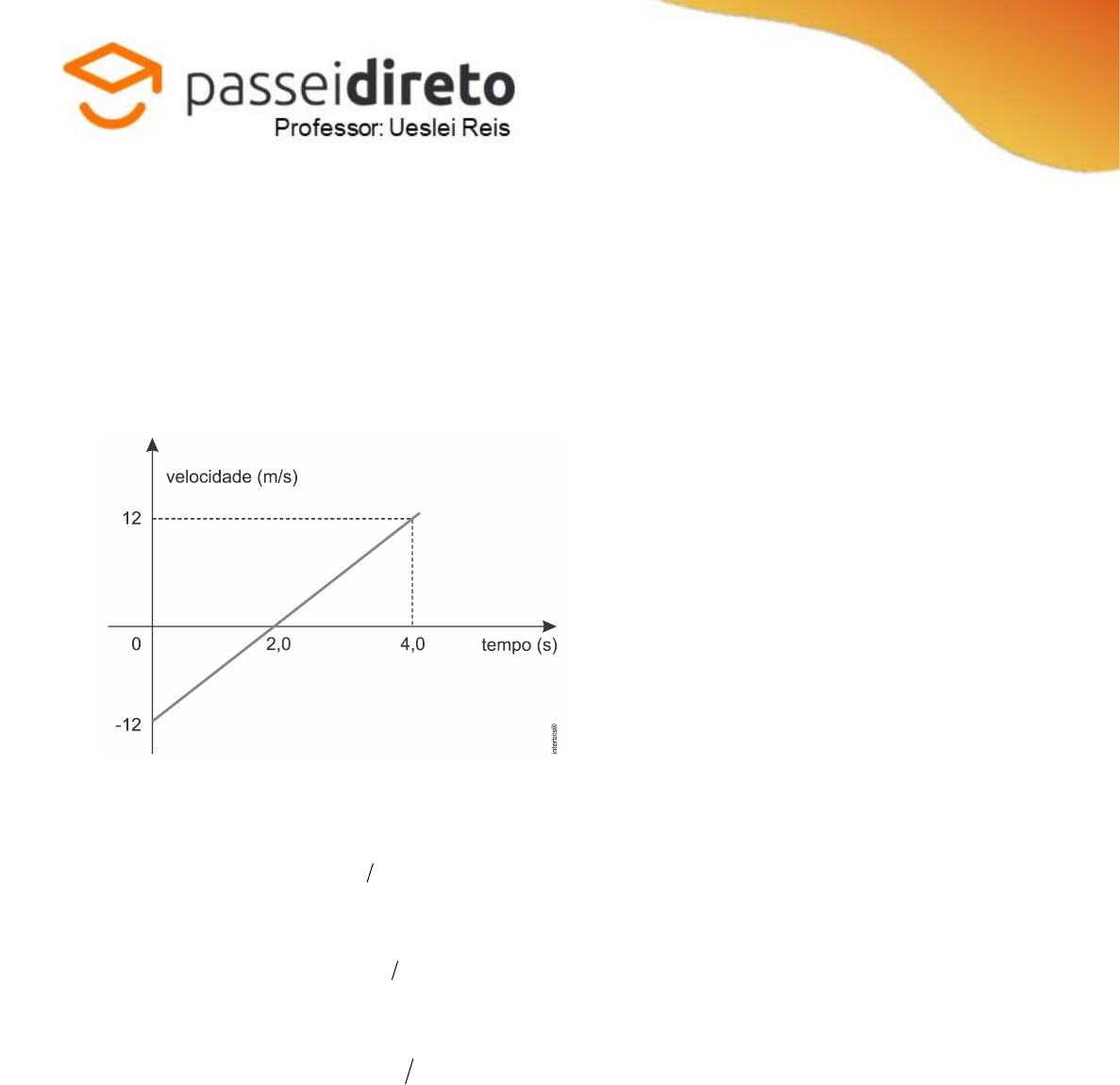 LISTA DE EXERCÍCIOS 08 – GRÁFICOS DO MOVIMENTO UNIFORMENTE VARIADO Questão 01 (Ueg 2016) Leia o gráfico a seguir. As informações obtidas na leitura do gráfico permitem dizer que a) a velocidade inicial é 12 m s. b) A velocidade é nula em 2,0 s. c) A velocidade final é de 12 m s.− d) o espaço percorrido foi de 12 m. e) a aceleração escalar é de 212 m s . Questão 02 (Uerj 2018) Um carro se desloca ao longo de uma reta. Sua velocidade varia de acordo com o tempo, conforme indicado no gráfico. A função que indica o deslocamento do carro em relação ao tempo t é: a) 25 t 0,55 t− b) 25 t 0,625 t+ c) 220 t 1,25 t− d) 220 t 2,5 t+ Questão 03 10. (Ifsul 2015) Um ponto material movimenta-se sobre uma trajetória retilínea. O gráfico da posição em função do tempo do movimento é um arco de parábola, como indicado abaixo. A equação horária que rege este movimento, segundo as informações fornecidas é a) X t= b) X t 2= + c) 2X t= d) 2X t 2t= − Questão 04 (Eear 2018) A posição (x) de um móvel em função do tempo (t) é representado pela parábola no gráfico a seguir. Durante todo o movimento o móvel estava sob uma aceleração constante de módulo igual a 2 m/s². A posição inicial desse móvel, em m era a) 0 b) 2 c) 15 d) -8 RESOLUÇÃO Questão 01 Gabarito [B] [A] Falsa. A velocidade inicial do móvel é 12 m s.− [B] Verdadeira. No tempo de 2,0s, o móvel muda o sentido de movimento, sendo, neste momento, nula a sua velocidade. [C] Falsa. A velocidade final é maior que 12 m s, pois o móvel continua o movimento um pouco mais além de 4,0s. [D] Falsa. O espaço percorrido até 4,0s. é calculado pela área sob a curva. Ida: 2 12 12 m 2 = Volta: 2 12 12 m 2 = Total percorrido: 24 m Deslocamento: 0 m [E] Falsa. A aceleração foi de: ( ) 212 m / s 12 m / sv 24 m / sa a 6 m / s t 4 s 4 s Δ Δ − − = = = = Questão 02 Gabarito [B] Do gráfico, temos que: 0 2 v 5 m s; v 10 5 a a 1,25 m s . t 4 0 Δ Δ = − = = = − Substituindo na função horária da posição (alterada para encontrar o deslocamento), temos: 2 2 2 0 a 1,25 S v t t S 5 t t S 5 t 0,625 t . 2 2 Δ Δ Δ= + = + = + Questão 03 Gabarito [D] Da equação horária das posições no MUV: 2 0 0 a x(t) t v t x 2 = + + Sendo assim, temos uma equação do 2º grau representada pela parábola no gráfico, e impossibilita as alternativas [A] e [B] de serem as respostas, pois se tratam de retas. Por outro lado, a inclinação da curva ao tocar o eixo vertical x, é dada pela tangente neste ponto de encontro, que fisicamente falando, representa a velocidade inicial do móvel, sendo diferente de zero há inclinação para cima ( )0v 0 ou para baixo ( )0v 0 que é o nosso caso. (Elimina-se, com isso, a alternativa [C] e a resposta correta é a da alternativa [D]. Outra forma de pensar é extrair os valores do gráfico e substituir na equação formando um sistema de equações: Em 0t 0 s, x 0 m; t 2 s, x 0 m; t 3 s, x 3 m = = = = = = Substituindo os valores dos pontos, temos: 0 0 0x(2 s) 2a 2v 2(a v ) 0 a v 0= + = + = + = (1) 0 0 0 9 3a 3a x(3 s) a 3v 3( v ) 3 v 1 2 2 2 = + = + = + = (2) Fazendo (2) – (1): 2a 1 a 2 m / s 2 = = e 0v 2 m / s= − Finalmente, substituindo os valores na equação de origem ficamos com: 2x(t) t 2t= − Questão 04 Gabarito [C] [C] Como x é uma parábola, temos que: ( )( ) 2 x k t 3 t 5 x 15k 8kt kt = − − = − + Comparando a equação de x com a equação do espaço do MUV, temos: 2 0 0 at x x v t 2 a 2 k k 1 2 2 = + + = = = Logo: 0 0 x 15k 15 1 x 15 m = = =