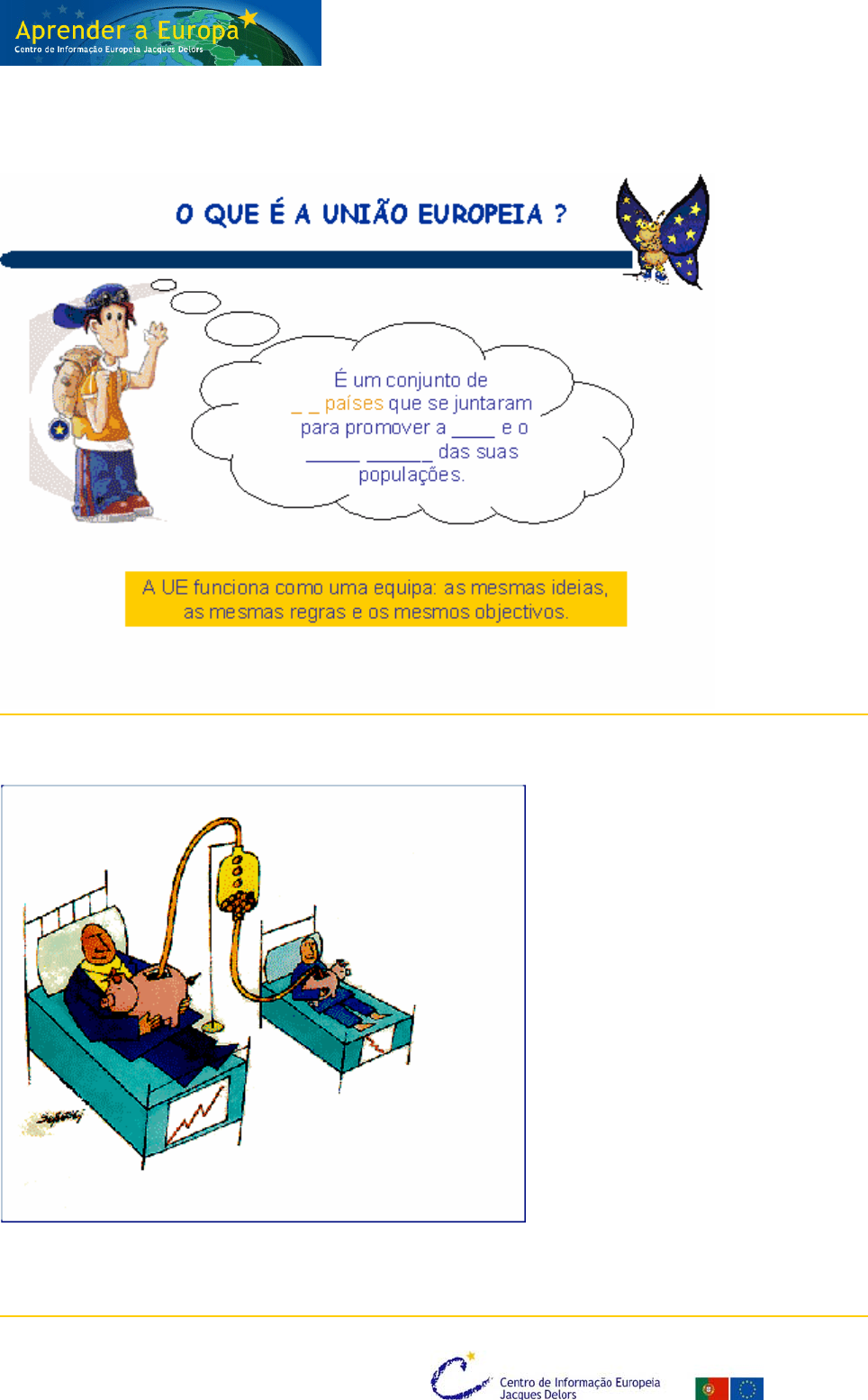 Data de actualização: Janeiro de 2007 www.aprendereuropa.pt www.ciejd.pt 1. A construção Europeia 1.1 Quantos países fazem parte da União Europeia e quais os seus objectivos? 1.2 Completa a frase Este princípio pressupõe que os países economicamente mais __________________ ajudem os países que têm maiores ___________________________. A União Europeia é sinónimo de Solidariedade entre os povos. Data de actualização: Janeiro de 2007 www.aprendereuropa.pt www.ciejd.pt 1. A construção Europeia 1.3. Completa os marcos importantes do processo de construção europeia. a) Em 1951,, nasceu a primeira Comunidade - a Comunidade ____________ do ______________ e do _________ (CECA) - Tratado de Paris. b) Em ________ são criadas duas novas comunidades: A ____________ _____________ ____________ (CEE) – T. Roma; A ____________ _____________ ____________ ___________ (CEEA também conhecida por EURATOM) – T. Roma. c) Com a assinatura do Tratado de Maastricht em _________ a equipa ganha o nome de __________ _____________ (UE). Nesta data novos objectivos são estabelecidos: Melhorar a Educação; Melhorar a Saúde; Criar uma Moeda Única para a equipa. d) Em 1997, os países assinaram o Tratado de _________________ com a finalidade de aproximar os cidadãos da União Europeia e combater o desemprego. e) Para que a União Europeia alterasse o funcionamento das suas instituições, permitindo a entrada de novos países foi assinado o Tratado de _______, em 2001. Data de actualização: Janeiro de 2007 www.aprendereuropa.pt www.ciejd.pt 1. A construção Europeia 1.4 Até ao momento a União assistiu a 6 alargamentos. Identifica os Países com as datas de entrada: 1.5. Quais os países que pediram para entrar na UE? 1981 ____________ 1951 - Membros fundadores Bélgica Holanda França Luxemburgo República Federal da Alemanha Itália 1986 ____________ ____________ 1995 ____________ ____________ ____________ 2004 ____________ ____________ ____________ ____________ ____________ ____________ ____________ ____________ ____________ ____________ 1973 ____________ ____________ ____________ Dos 6 aos 27 Estados – Membros... ______________________ ______________________ ______________________ 2007 ____________ ____________