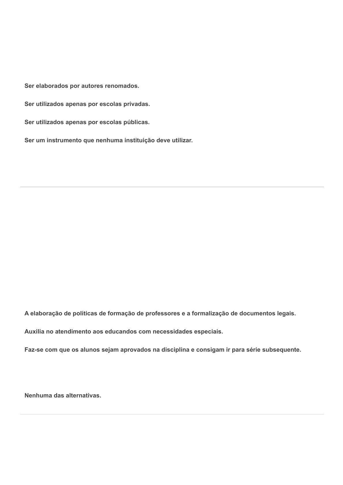 25/02/2021 Comentários https://sereduc.blackboard.com/ultra/courses/_43665_1/outline/assessment/_3160978_1/overview/attempt/_10397941_1/review/inline-feedback?… 1/5 Ocultar opções de resposta Ocultar opções de resposta Pergunta 1 -- /1 Materiais didáticos podem: Ser elaborados por autores renomados. Ser utilizados apenas por escolas privadas. Ser utilizados apenas por escolas públicas. Ser um instrumento que nenhuma instituição deve utilizar. Resposta correta Ser elaborados a partir de materiais de baixo custo, propiciando que qualquer instituição consiga utilizá-lo. Pergunta 2 -- /1 Na escola o papel das atividades científicas é: A elaboração de políticas de formação de professores e a formalização de documentos legais. Auxilia no atendimento aos educandos com necessidades especiais. Faz-se com que os alunos sejam aprovados na disciplina e consigam ir para série subsequente. Resposta correta Ajudar na formação de novas ideias, testar ideias existentes e alterar estas ideias a partir de uma evidência. Nenhuma das alternativas. Pergunta 3 -- /1 25/02/2021 Comentários https://sereduc.blackboard.com/ultra/courses/_43665_1/outline/assessment/_3160978_1/overview/attempt/_10397941_1/review/inline-feedback?… 2/5 Ocultar opções de resposta Ocultar opções de resposta Porque a alfabetização científica é extremamente importante durante os primeiros anos de ensino? Resposta correta A partir dela, a criança pode ter seus primeiros contatos com a ciência, entender a maneira como esta se estrutura e dessa forma despertar o interesse para a aprendizagem desta área tão importante para o desenvolvimento social. Parte superior do formulárioNa verdade este conhecimento não se faz tão importante, visto que pode ser realizado a partir do ensino fundamental II. Nenhuma das alternativas. Alguns objetivos educacionais gerais podem auxiliar os professores na seleção de objetivos específicos e conteúdo de ensino. Neste processo, é de extrema importância pois, a partir dessa idade já é possível a preparação para os vestibulares e provas avaliativas. Pergunta 4 -- /1 Para o processo de aprendizagem, 3 pilares são imprescindíveis, estes são: A escola, os pais e a direção. A sala de aula, o professor e o aluno. O exemplo, os pais e o professor. Resposta corretaO ensino, a experiência e o exemplo. A aula, o livro e o professor. 25/02/2021 Comentários https://sereduc.blackboard.com/ultra/courses/_43665_1/outline/assessment/_3160978_1/overview/attempt/_10397941_1/review/inline-feedback?… 3/5 Ocultar opções de resposta Ocultar opções de resposta Pergunta 5 -- /1 O que é didática? É a área do conhecimento que estuda materiais didáticos. Resposta correta É um ramo da ciência pedagógica e tem como foco o ensino e a prática de métodos. É a área do conhecimento que estuda o professor. É um ramo que estuda o ensino teórico e aplicação de provas. É a área do conhecimento que estuda livros didáticos. Pergunta 6 -- /1 O que é um material didático? Nenhuma das alternativas. Uma forma de livro. É uma metodologia de aula teórica. Uma apostila que deve promover a aprendizagem. Resposta corretaÉ um instrumento e um produto pedagógico utilizado em sala de aula. 25/02/2021 Comentários https://sereduc.blackboard.com/ultra/courses/_43665_1/outline/assessment/_3160978_1/overview/attempt/_10397941_1/review/inline-feedback?… 4/5 Ocultar opções de resposta Ocultar opções de resposta Pergunta 7 -- /1 A elaboração de um material didático requer quatro fases, quais são estas? Ação, Uso, Construção e Memorização. Planejamento, Lecionar, Ensino e Prática. Prática, Produção, Ensino e Memorização. Resposta corretaPlanejamento, Construção, Produção e Uso. Memorização, Ensino, produção e uso. Pergunta 8 -- /1 O papel que o professor exerce no desenvolvimento de uma criança está justamente relacionado a: Ao senso comum e aos conhecimentos carregados pelos discentes. Resposta corretaAssociação dos conceitos cotidianos e a mediação do conhecimento científico. A sala de aula e as provas que este professor aplica. A sua formação e a elaboração de sua aula. A Metodologia Científica e os filósofos associados a esta teoria. Pergunta 9 -- /1 25/02/2021 Comentários https://sereduc.blackboard.com/ultra/courses/_43665_1/outline/assessment/_3160978_1/overview/attempt/_10397941_1/review/inline-feedback?… 5/5 Ocultar opções de resposta Ocultar opções de resposta g A educação infantil é um período em que as crianças tem os primeiros contatos com o ensino e a aprendizagem, nesse período muitos professores reclamam de dificuldades atreladas a aprendizagem, estas se referem: Nenhuma das respostas acima. Resposta corretaPerca de interesse muito fácil pelas aulas. A escola não ter infraestrutura. Ao conteúdo ser muito difícil para os alunos. Aos pais que não ensinam seus filhos em casa. Pergunta 10 -- /1 Ao analisar um material didático estes requisitos devem ser levados em consideração: A forma como o professor aborda o conteúdo. Resposta correta A ludicidade, clareza, no caso de livros da experiência do autor e da maneira como a obra está estruturada. O preço do material didático. A escrita do material. Apenas o livro didático impresso.