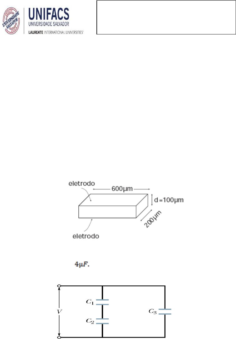 1) Um capacitor de placas paralelas possui placas circulares de 8,2 cm de raio e 1,3 mm de separação. (a) Calcule a capacitância. (b) Que carga aparecerá sobre as placas se for aplicada uma diferença de potencial de 120 V. 2) As placas de um capacitor esférico possuem raios de 38 mm e 40 mm. (a) Calcule a capacitância. (b) Qual deve ser a área da placa de um capacitor de placas paralelas com a mesma separação entre as placas e a mesma capacitância. 3) Numa tela de televisor de plasma, pequenas células contendo uma mistura de gases emitem luz quando submetidas a descargas elétricas. A figura 1 mostra uma célula com dois eletrodos, nos quais uma diferença de potencial é aplicada para produzir a descarga. Considerando que os eletrodos formam um capacitor de placas paralelas, calcule: a) Calcule a capacitância da célula. b) A carga armazenada considerando uma diferença de potencial igual a 100V for aplicada nos eletrodos da célula. figura 1 4) Na figura 2, determine a capacitância equivalente da combinação. Suponha que C1 = 10 µF, C2 = 5µF e C3 = figura 2 5) Quantos capacitores de 1 µF devem ser ligados em paralelo para armazenar uma carga de 1 C com uma diferença de potencial de 110 V entre as extremidades dos capacitores? 6) Na figura 3, a bateria possui uma diferença de potencial de 10 V e os cinco capacitores possuem, cada um, uma capacitância de 10 µF. Qual é a carga (a) sobre o capacitor 1 e (b) sobre o capacitor 2? Disciplina: Física Eletricidade Professora: Rejane Cristina Dorn 4ª Lista de exercícios – Capacitores figura 3 7) Na figura 4, a bateria possui uma diferença de potencial de 20 V. Determine (a) a capacitância equivalente; (b) a carga armazenada sobre o capacitor equivalente. Determine o potencial entre as placas e a carga sobre (c) o capacitor 1, (d) o capacitor 2 e (e) o capacitor 3. figura 4 8) Na figura 5, a bateria B fornece 12 V. Determine a carga sobre cada capacitor (a) primeiramente quando apenas a chave S1 for fechada e (b) mais tarde, quando a chave S2 também for fechada. Adote C1 = 1µF, C2 = 2 µF, C3 = 3 µF e C4 = 4 µF. figura 5 9) Um capacitor de placas paralelas, com o espaço entre as placas preenchido por ar, tendo uma área de 40 cm2 e um espaçamento entre as placas de 1 mm é carregado com uma diferença de potencial de 600 V. Determine: (a) a capacitância, (b) a intensidade da carga sobre cada placa e (c) a energia armazenada. 10) Dois capacitores de 2 µF e 4 µF de capacitância, estão ligados em paralelo atravessando uma diferença de potencial de 300 V. Calcule a energia total armazenada nos capacitores. 11) Um capacitor de placas paralelas, com ar entre as placas, possui uma capacitância de 1,3 pF. A separação entre as placas é duplicada e introduz-se cera entre elas. A nova capacitância é igual a 2,6 pF. Determine a constante dielétrica da cera. 12) Um capacitor de placas paralelas, preenchido com ar entre elas, possui uma capacitância de 50 pF. (a) Se cada uma de suas placas possui uma área de 0,35 m2, qual a separação? (b) Se a região entre as placas for agora preenchida com um material tendo k=5,6, qual a capacitância? 13) Para a segurança dos clientes, o supermercado utiliza lâmpadas de emergência e rádios transmissores que trabalham com corrente contínua. Para carregar suas baterias, no entando, esses dispositivos utilizam corrente alternada. Isso é possível graças a seus retificadores que possuem, cada um, dois capacitores de 1400 µF, associados em paralelo. Os capacitores descarregados e ligados a uma rede de tensão máxima igual a 170 V, estarão com um carga plena após um intervalo de tempo t. Determine: (a) a carga elétrica total acumulada; (b) a energia potencial elétrica total armazenada. 14) A figura 6 mostra um capacitor de placas paralelas com uma área das placas A = 7,89 cm2 e uma distância entre as placas d = 4,62 mm. A parte superior do espaço entre as placas é preenchida por um material de constante dielétrica k1 = 11,0; a parte inferior é preenchida por um material de constante dielétrica k2 = 12,0. Qual é a capacitância? figura 6 15) Explosões provocadas por descargas elétricas constituem um sério perigo nas indústrias que lidam com pós muito finos. Uma dessas explosões aconteceu em uma fábrica de biscoitos na década de 70. Os operários costumavam esvaziar os sacos de chocolate em pós que chegavam à fábrica em uma bandeja, da qual o material era transportado através de canos de plástico até o silo onde era armazenado. No meio dessa percurso, duas condições para que uma explosão ocorresse foram satisfeitas: (1) o módulo do campo elétrico ultrapassou 3 x 106 N/C, produzido uma ruptura dielétrica do ar; (2) a energia da centelha resultante ultrapassou 150 mJ, fazendo com que o pó explodisse. Cada operário possuía um potencial elétrico de cerca de 7 kV em relação ao potencial da Terra, que foi considerado potencial zero. Supondo que o operário pode ser modelado como um capacitor com uma capacitância de 200 pF, determine a energia armazenada no capacitor. Respostas: (1) (a) 144 pF; (b) 17 nC; (2) (a) 84.5 pF; (b) 191 cm2; (3) (a) 1,1 x 10-14 F; (b) 1,1x 10-12 C. (4) 7,33 pF; (5) 9090; (6) (a) 1 x 10-4 C; (b) 2 x 10-5 C; (7) (a) 3 µF; (b) 6 x 10-5 C; (c) 10 V e 3 x 10- 5 C; (d) 10 V e 2 x 10-5 C; (e) 5 V e 2 x 10-5 C; (8) (a) q1=q3= 9 µC e q2 = q4 = 16 µC; (b) q1 = 8,4 µC, q2 = 17 µF, q3 = 11 µC, q4 = 14 µC; (9) (a) 35 pF; (b) 21 nC; (c) 6,3 µJ; (10) 0,27 J; (11) 4; (12) (a) 6,2 x 10-2 m; (b) 280 pF. (13) (a) 0,476 C; (b) 40,5 J. (14) 17,3 pF; (15) 4,9 mJ.