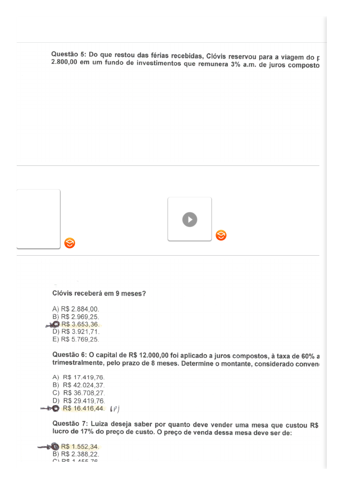 09/12/2019 Matemática Financeira - Prova 1 | Passei Direto https://www.passeidireto.com/arquivo/47683447/matematica-financeira-prova-1 1/1 Sobre • Central de ajuda • Gamification • Trabalhe conosco • Blog • Política de privacidade • Termos de uso © 2019 Passei Direto Materiais de estudo Perguntas e respostas Minhas disciplinas Interpretação e Produ… Comportamento Orga… Interpretação e Produ… Administração do Rel… Instituição de Direito Economia e Negocio Meu Perfil Listas Histórico Enviados PREMIUM Buscar material de estudo e e… 6 CONTEÚDO RELACIONADO ) Questão 5: Do que restou das férias recebidas, Clóvis reservou para a viagem do pr 2.800,00 em um fundo de investimentos que remunera 3% am. de juros compostos Matemática Financeira, 8ª edição José dutra Vieira sobrinho Passei Direto Juros simples - Teoria Passei Direto Clóvis receberá em 9 meses? A) R$ 2.884,00. B) R$ 2.969,25. ”0% 3.653,36. D) R$ 3.921,71. E) R$ 5.769,25. Questão 6: 0 capital de R$ 12.000,00 foi aplicado a juros compostos, à taxa de 60% a trimestralmente, pelo prazo de 8 meses. Determine o montante, considerado convenç A) R$ 17.419,76. B) R$ 42.024,37. C) R$ 36.708,27. D) R$ 29.419,76. % R$ 16.416,44. w) Questão 7: Luiza deseja saber por quanto deve vender uma mesa que custou R$ 1 lucro de 17% do preço de custo. O preço de venda dessa mesa deve ser de: ...ª R$ 1.552,34. ) R$ 2.388,22. ) R$ 1 455 76 B C Salvar https://saibamais.passeidireto.com/sobre-nos https://centraldeajuda.passeidireto.com/ https://www.passeidireto.com/gamificacao https://saibamais.passeidireto.com/carreiras https://www.passeidireto.com/blog https://www.passeidireto.com/privacidade https://www.passeidireto.com/termos-de-uso https://www.passeidireto.com/ https://www.passeidireto.com/perguntas-respostas https://www.passeidireto.com/disciplina/seguindo https://www.passeidireto.com/disciplina/interpretacao-e-producao-de-texto/ https://www.passeidireto.com/disciplina/comportamento-organizacional/ https://www.passeidireto.com/disciplina/interpretacao-e-producao-de-textos/ https://www.passeidireto.com/disciplina/administracao-do-relacionamento-com-o-cliente/ https://www.passeidireto.com/disciplina/instituicao-de-direito/ https://www.passeidireto.com/disciplina/economia-e-negocio/ https://www.passeidireto.com/perfil/6509129/materiais https://www.passeidireto.com/perfil/6509129/listas https://www.passeidireto.com/perfil/6509129/historico https://www.passeidireto.com/perfil/6509129/enviados https://www.passeidireto.com/ https://www.passeidireto.com/livro/9788597015461 https://www.passeidireto.com/video/25413220/juros-simples-teoria https://www.passeidireto.com/perfil/passei-direto https://www.passeidireto.com/perfil/passei-direto
