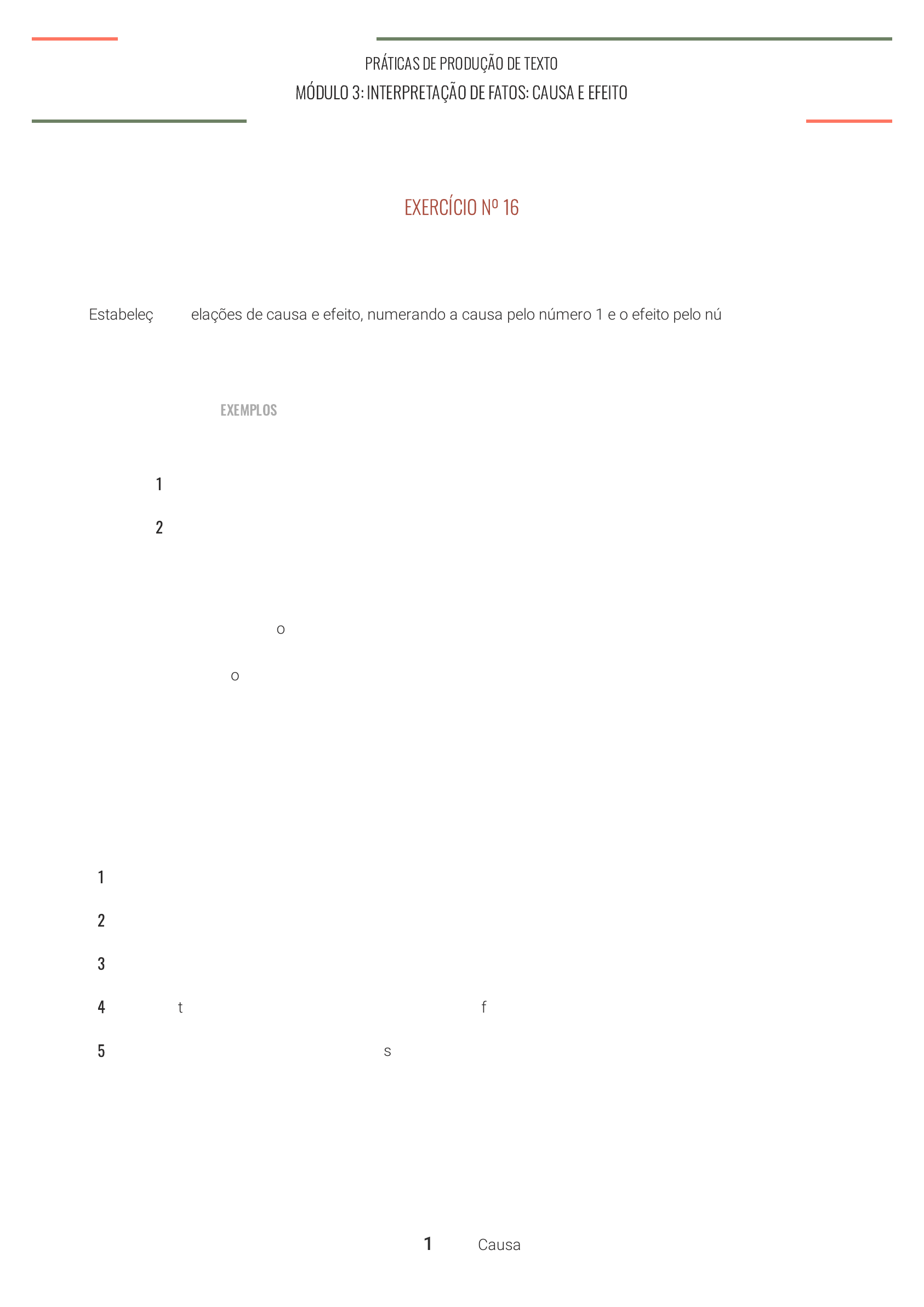27/02/2021 Interpretação de fatos: causa e efeito https://avamec.mec.gov.br/#/instituicao/sealf/curso/11961/unidade/7761/acessar?continue=true 1/8 EXERCÍCIO Nº 16 1 Causa PRÁTICAS DE PRODUÇÃO DE TEXTO MÓDULO 3: INTERPRETAÇÃO DE FATOS: CAUSA E EFEITO Estabeleça as relações de causa e efeito, numerando a causa pelo número 1 e o efeito pelo número 2. Por ter estudado muito, João conseguiu a aprovação no exame.1 João conseguiu a aprovação, uma vez que estudou muito.2 (1) Causa (2) Efeito ( 1 )1. João estudou muito. ( 2 ) Conseguiu a aprovação. ( 2 ) 2. João conseguiu a aprovação. ( 1 ) Ele estudou muito. Vamos ao exercício: Estourando a represa, o rio subiu muito.1 A lâmpada não acende, porque está queimada.2 O mendigo pediu comida, por sentir muita fome.3 Como tivesse furtado alguns objetos, o empregado foi despedido.4 Um homem estranho berrou, por conseguinte, eu �quei com medo.5 Solução: EXEMPLOS 27/02/2021 Interpretação de fatos: causa e efeito https://avamec.mec.gov.br/#/instituicao/sealf/curso/11961/unidade/7761/acessar?continue=true 2/8 2 Efeito GABARITO 1 1. A represa estourou. 2 O rio subiu muito. 2 2. A lâmpada não acende. 1 Ela está queimada. 2 3. O mendigo pediu comida. 1 Ele sentia muita fome. 1 4. O furto de alguns objetos pelo empregado. 2 O empregado foi despedido. 1 5. O berro do homem estranho. 2 O meu medo. 2 1. A represa estourou. 1 O rio subiu muito. 1 2. A lâmpada não acende. 2 Ela está queimada. 2 3. O mendigo pediu comida. 1 Ele sentia muita fome. 1 4. O furto de alguns objetos pelo empregado. 2 O empregado foi despedido. 1 5. O berro do homem estranho. 2 O meu medo. 27/02/2021 Interpretação de fatos: causa e efeito https://avamec.mec.gov.br/#/instituicao/sealf/curso/11961/unidade/7761/acessar?continue=true 3/8 Respondida 1 de 1 questão EXERCÍCIO Nº 17 1 Como o tesoureiro contasse o dinheiro, notou a falta, assustando o gerente. 1 Causa 2 Efeito Atividade concluída Estabeleça as relações de causa e efeito entre os fatos seguintes: Estourando a represa, houve grande inundação, �cando destruídas muitas casas. Estourando a represa, Causa houve uma grande inundação. Efeito 1 Houve uma grande inundação, Causa �cando destruídas muitas casas. Efeito 2 1 a) Como o tesoureiro contasse o dinheiro, 2 notou a falta. 2 b) Notou a falta, 2 assustando o gerente. EXEMPLOS 27/02/2021 Interpretação de fatos: causa e efeito https://avamec.mec.gov.br/#/instituicao/sealf/curso/11961/unidade/7761/acessar?continue=true 4/8 GABARITO 1 a) Como o tesoureiro contasse o dinheiro, 2 notou a falta. 1 b) Notou a falta, 2 assustando o gerente. 2 Uma vez que cantou durante todo o verão, a cigarra passou fome; por conseguinte, morreu no inverno. 1 Causa 2 Efeito GABARITO 1 a) Uma vez que cantou durante todo o verão, 2 a cigarra passou fome. 1 b) A cigarra passou fome; 2 por conseguinte, morreu no inverno. 2 a) Uma vez que cantou durante todo o verão, 1 a cigarra passou fome. 1 b) A cigarra passou fome; 2 por conseguinte, morreu no inverno. 27/02/2021 Interpretação de fatos: causa e efeito https://avamec.mec.gov.br/#/instituicao/sealf/curso/11961/unidade/7761/acessar?continue=true 5/8 3 Por ter D. Rosinha cuidado bem de seu jardim, desabrocharam muitas �ores; o jardim, pois, �cou um encanto. 1 Causa 2 Efeito GABARITO 1 a) Por ter D. Rosinha cuidado bem de seu jardim, 2 desabrocharam muitas �ores. 1 b) Desabrocharam muitas �ores; 2 o jardim, pois, �cou um encanto. Respondidas 3 de 3 questões EXERCÍCIO Nº 18 2 a) Por ter D. Rosinha cuidado bem de seu jardim, 2 desabrocharam muitas �ores. 1 b) Desabrocharam muitas �ores; 1 o jardim, pois, �cou um encanto. Atividade concluída Indique as relações de causa e efeito, conforme o exemplo: 27/02/2021 Interpretação de fatos: causa e efeito https://avamec.mec.gov.br/#/instituicao/sealf/curso/11961/unidade/7761/acessar?continue=true 6/8 1 Sorrindo sempre, ela alegra os colegas, deixando todos felizes. 1 Causa 2 Efeito GABARITO 1 a) Sorrindo sempre, 2 ela alegra os colegas, 1 b) ela alegra os colegas, 2 deixando todos felizes. 2 Estudando, o rapaz foi aprovado, obtendo o emprego. 1 Causa Chovendo muito, o rio encheu muito, assustando os lavradores. 2 a) Sorrindo sempre, 2 ela alegra os colegas, 1 b) ela alegra os colegas, 1 deixando todos felizes. 27/02/2021 Interpretação de fatos: causa e efeito https://avamec.mec.gov.br/#/instituicao/sealf/curso/11961/unidade/7761/acessar?continue=true 7/8 2 Efeito GABARITO 1 a) Estudando, 2 o rapaz foi aprovado, 1 b) o rapaz foi aprovado, 2 obtendo o emprego. 3 Falando meigamente, a professora acalma os alunos, ensinando melhor. 1 Causa 2 Efeito 1 a) Estudando, 2 o rapaz foi aprovado, 2 b) o rapaz foi aprovado, 1 obtendo o emprego. 1 a) Falando meigamente, 2 a professora acalma os alunos, 1 b) a professora acalma os alunos, 2 ensinando melhor. 27/02/2021 Interpretação de fatos: causa e efeito https://avamec.mec.gov.br/#/instituicao/sealf/curso/11961/unidade/7761/acessar?continue=true 8/8 GABARITO 1 a) Falando meigamente, 2 a professora acalma os alunos, 1 b) a professora acalma os alunos, 2 ensinando melhor. Respondidas 3 de 3 questões 2020. CAPES - PROGRAMA DE ACOLHIMENTO DA UNIVERSIDADE ABERTA DO BRASIL. Atividade concluída 10 de 17 1 2 3 4 5 6 7 8 9 10 11 12 13 14 15 16 17 Progresso do Módulo https://avamec.mec.gov.br/ava-mec-ws/instituicao/sealf/conteudo/modulo/4041/uni3/slide9.html https://avamec.mec.gov.br/ava-mec-ws/instituicao/sealf/conteudo/modulo/4041/uni3/slide11.html https://avamec.mec.gov.br/ava-mec-ws/instituicao/sealf/conteudo/modulo/4041/uni3/slide1.html https://avamec.mec.gov.br/ava-mec-ws/instituicao/sealf/conteudo/modulo/4041/uni3/slide2.html https://avamec.mec.gov.br/ava-mec-ws/instituicao/sealf/conteudo/modulo/4041/uni3/slide3.html https://avamec.mec.gov.br/ava-mec-ws/instituicao/sealf/conteudo/modulo/4041/uni3/slide4.html https://avamec.mec.gov.br/ava-mec-ws/instituicao/sealf/conteudo/modulo/4041/uni3/slide5