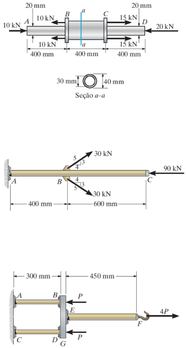Resistência dos Materiais I – Cargas axiais Exercício 1: Os seguimentos AB e CD do conjunto são hastes circulares sólidas, e o segmento BC é um tubo. Se o conjunto for feito de alumínio 6061-T6 (Eal = 68,9 GPa), determine o deslocamento da extremidade D em relação à extremidade A. Resposta: δD/A = - 0,449 mm Exercício 2: A haste de aço A992 (E = 200 GPa) de 30 mm de diâmetro está sujeita ao carregamento mostrado. Determine o deslocamento da extremidade C. Resposta: δC = - 0,501 mm Exercício 3: O conjunto consiste em duas hastes, AB e CD, de cobre por brasagem C83400 (E = 101 GPa) de 10 mm de diâmetro, uma haste de aço inoxidável 304 (E = 193 GPa) de 15 mm de diâmetro EF e uma barra rígida G. Se P = 5 kN, determine o deslocamento horizontal da extremidade F da haste EF. Resposta: δF = 0,453 mm Exercício 4: A carga é suportada pelos quatro cabos de aço inoxidável 304 (E = 193 GPa) que estão conectados aos elementos rígidos AB e DC. Determine o deslocamento vertical da carga de 2,5 kN se os elementos estiverem originalmente horizontais quando a carga for aplicada. Cada cabo tem uma área de seção transversal de 16 mm² . Resposta: δI = 0,736 mm Exercício 5: O sistema articulado é feito de dois elementos de aço A-36 (E = 200 GPa) conectados por pinos, cada um com uma área de seção transversal de 1.000 mm². Se uma força vertical P = 250 kN for aplicada ao ponto A, determine o seu deslocamento vertical em A. Resposta: (δA)v = 0,732 mm REFERÊNCIA HIBBELER, R. C. Resistência dos materiais. 10 Ed. São Paulo: Pearson Education do Brasil, 2018.