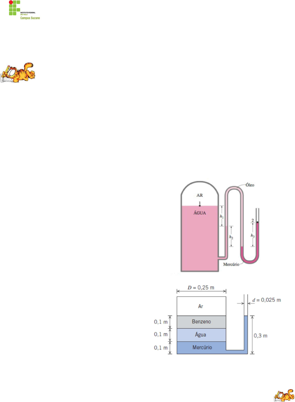 Mecânica dos Fluidos (MFLP4) – Bacharelado em Química Industrial Profs. Renata – novembro/2020 Módulo 3: Estática dos fluidos Exercícios Propostos 1. A leitura de um medidor de vácuo conectado a uma câmara é 24 kPa em um local onde a pressão atmosférica é de 92 kPa. Determine a pressão absoluta da câmara. R:68 kPa. 2. A água de um tanque é pressurizada a ar, e a pressão é medida por um manômetro de vários fluidos, conforme Figura. Determine a pressão manométrica do ar no tanque se h1 = 0,2 m, h2 = 0,3 m e h3 = 0,46 m. Considere as massas específicas da água, do óleo e do mercúrio como 1000 kg/m³, 850 kg/m³ e 13600 kg/m³, respectivamente. R: 56,9 kPa. 3. Considere um tanque contendo mercúrio, água, benzeno e ar conforme mostrado. Determine a pressão do ar (manométrica). Dado: ρbenzeno = 879 kg/m³. ρmercúrio = 13600 kg/m³. ρágua = 1000 kg/m³. g = 9,81 m/s². R:(24,8 kPa) Mecânica dos Fluidos (MFLP4) – Bacharelado em Química Industrial Profs. Renata – novembro/2020 4. Determinar a deflexão h do manômetro da figura abaixo, quando a variação de pressão p1 - p2 = 870Pa. Considere as densidades dos fluidos dA=0,88 e dB=2,95. R: (42,84mm) 5. Determine a pressão na tubulação com água (A) considerando que o manômetro em U está aberto para a atmosfera. O fluido manométrico apresenta um peso especifico igual a 30 KN/m³. Considere que h1=30cm e h2=10cm. R: (8,0 kPa g/m3) 6. Um pequeno bloco de alumínio foi erguido por um fio fino e mergulhado completamente num reservatório com água, como ilustra a figura. Através de uma balança, a massa medida para o bloco de alumínio antes de mergulhá-lo na água foi de 800 g. Determine o valor da tensão no fio de sustentação do bloco de alumínio antes e após o mesmo ser Mecânica dos Fluidos (MFLP4) – Bacharelado em Química Industrial Profs. Renata – novembro/2020 mergulhado. A massa específica do alumínio é 2,7x103 kg/m³. R: (7,848 N; 4,94 N) 7. Considere um grande bloco de gelo cúbico flutuando na água do mar. As densidades do gelo e da água do mar são 0,92 e 1,025, respectivamente. Se uma parte com 10 cm de altura do bloco de gelo ficar acima da superfície da água, determine a altura do bloco de gelo abaixo da superfície. R: (87,6 cm)