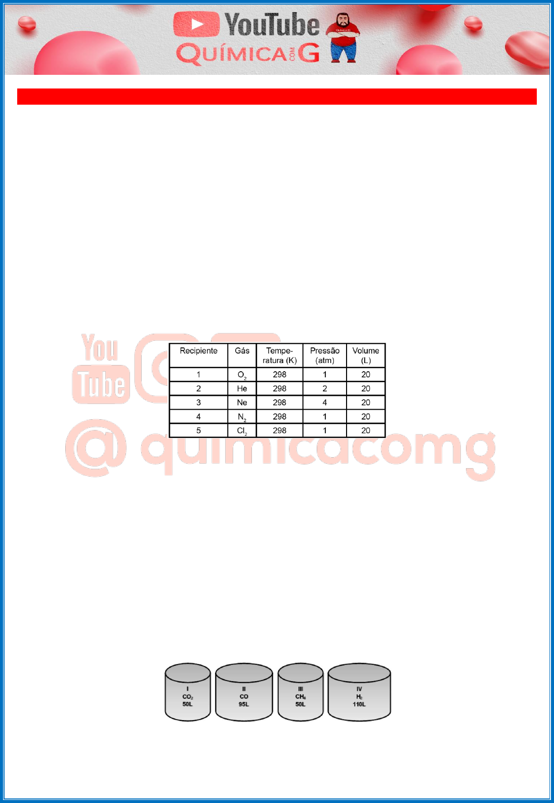 HIPOTESE DE AVOGADRO Questão 01 - (UECE) Em alguns casos, há necessidade de coletar-se o produto de uma reação sob a água para evitar que ele escape e misture-se com o ar atmosférico. Uma amostra de 500 mL de oxigênio foi coletada sob a água a 23 ºC e pressão de 1 atm. Sabendo-se que a pressão de vapor da água a 23 ºC é 0,028 atm, o volume que o O2 seco ocupará naquelas condições de temperatura e pressão será a) 243,0 mL. b) 486,0 mL. c) 364,5 mL. d) 729,0 mL. Questão 02 - (UNIFOR CE) A Tabela abaixo apresenta informações sobre cinco gases contidos em recipientes separados e selados O recipiente que contém o maior número de moléculas é de número a) 1 b) 2 c) 3 d) 4 e) 5 Questão 03 - (Unievangélica GO) Segundo Avogadro, “Gases quaisquer, ocupando o mesmo volume, nas mesmas condições de temperatura e pressão, contêm o mesmo número de moléculas”. Considere os seguintes sistemas fechados contendo gases, todos com a mesma temperatura e pressão: Há maior número de átomos de oxigênio e hidrogênio, respectivamente, nos sistemas a) I e IV b) II e III c) II e IV d) I e III Questão 04 - (ACAFE SC) Os gases ideais podem ser estudados pela equação P.V = n.R.T. Porém, nos gases reais usase a equação abaixo, de Van de Waals, onde P: pressão, n: número de moles, V: volume, R: 0,082 atm.L.mol–1.K–1, T: temperatura, a e b são constantes empíricas que variam para cada tipo de gás. TRn)bnV( V an( P 2 2 =− + Dado: para resolução dessa questão considere a: 1,21 atm.L2.mol–2 e b: 0,10 L.mol–1. Utilizando-se da equação de Van de Waals, qual a pressão exercida em um recipiente hermético de 2L por 1 mol de um gás real sob uma temperatura de 27ºC? a) 12,34 atm b) 12,30 atm c) 12,64 atm d) 0,86 atm Questão 05 - (Mackenzie SP) Considerando dois gases com comportamento ideal, CH4 e C2H6, contidos em compartimentos separados e fechados, ambos com volumes iguais a 10 L, sob mesmas condições de temperatura e pressão, de acordo com a hipótese de Avogadro, pode-se afirmar que ambos os gases a) contêm a mesma quantidade de moléculas. b) possuem a mesma massa. c) possuem a mesma massa molar. d) contêm, respectivamente, 2 e 5 mols. e) possuem iguais velocidades de difusão. Questão 06 - (UESPI) Na química alguns conceitos são de grande importância para a compreensão de certos fenômenos. Relacione os conceitos citados abaixo com os seus respectivos significados. 1) Transformação Química 2) Substância Pura 3) Alótropos 4) Hipótese de Avogadro ( ) Apresenta, em uma curva de aquecimento, temperatura de ebulição e de fusão constantes. ( ) Muda a natureza íntima da matéria. ( ) Volumes iguais de gases, nas mesmas condições de temperatura e pressão, têm o mesmo número de moléculas. ( ) São formas alternativas de um elemento que diferem na maneira como os átomos estão ligados. A sequência correta é: a) 1, 2, 3, 4 b) 2, 1, 4, 3 c) 2, 1, 3, 4 d) 3, 4, 1, 2. e) 4, 3, 2, 1 Questão 07 - (UFLA MG) Segundo Avogadro, volumes iguais de gases quaisquer, na mesma pressão e temperatura, contêm igual número de moléculas. Considerando a seguinte reação: 4NH3 (g) + 5O2 (g) → 4NO (g) + 6H2O (g) Assinale a alternativa que indica CORRETAMENTE o volume (em mL) de NH3, NO e H2O, respectivamente, sabendo‐se que o volume de O2 consumido foi de 100 mL. a) 80, 80, 120 b) 100, 100, 100 c) 160, 80, 180 d) 40, 40, 120 Gabarito 1. Gab: B 2. Gab: C 3. Gab: A 4. Gab: C 5. Gab: A 6. Gab: B 7. Gab: A