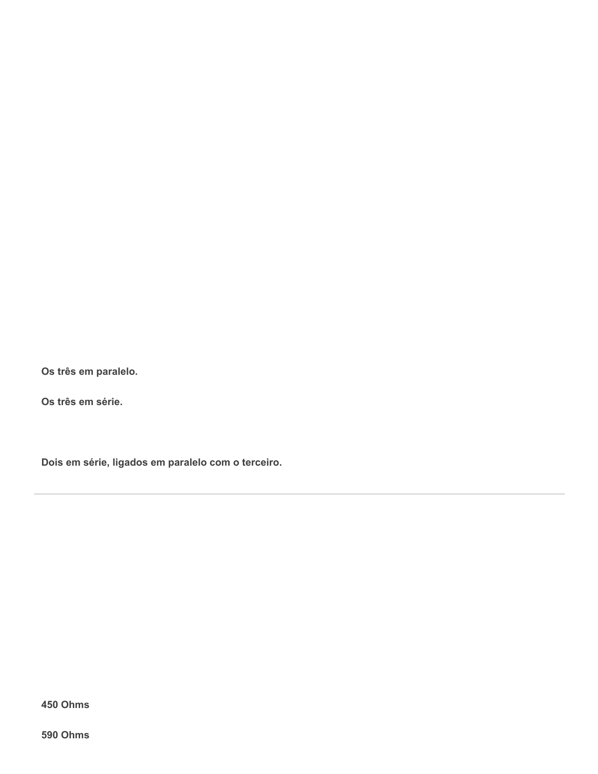 04/02/2021 Ultra https://sereduc.blackboard.com/ultra/courses/_43612_1/grades/assessment/_3159108_1/overview/attempt/_10313117_1/review?courseId=_43612_1 1/6 Ocultar opções de resposta Ocultar opções de resposta Pergunta 1 -- /1 Dispõe-se de três resistores de resistência 300 Ohms cada um. Para obter uma resistência de 450 Ohms, utilizando os três resistores, como devemos associá-los? Os três em paralelo. Os três em série. Resposta corretaDois em paralelo, ligados em série com o terceiro. Dois em série, ligados em paralelo com o terceiro. Pergunta 2 -- /1 Temos três resistores ligados em série com as resistências de 120, 330 e 470 Ohms. Qual a resistência total? 450 Ohms 590 Ohms 9/10 Nota final Enviado: 04/02/21 21:44 (BRT) 04/02/2021 Ultra https://sereduc.blackboard.com/ultra/courses/_43612_1/grades/assessment/_3159108_1/overview/attempt/_10313117_1/review?courseId=_43612_1 2/6 Ocultar opções de resposta Ocultar opções de resposta 800 Ohms Resposta correta920 Ohms 120 Ohms Pergunta 3 -- /1 A unidade da corrente elétrica é: Watt. Joule. Volts. Ohm. Resposta corretaAmpére. Pergunta 4 -- /1 Qual a unidade de resistência elétrica? Volts. 04/02/2021 Ultra https://sereduc.blackboard.com/ultra/courses/_43612_1/grades/assessment/_3159108_1/overview/attempt/_10313117_1/review?courseId=_43612_1 3/6 Ocultar opções de resposta Ocultar opções de resposta Watt. Resposta corretaOhm. Ampére. Coulomb. Pergunta 5 -- /1 Para que exista uma corrente elétrica em um condutor, é necessário que: Exista potência elétrica. A corrente elétrica não circula em condutores. Exista reatância elétrica. Exista resistência elétrica. Resposta corretaExista uma diferença de potencial (tensão). Pergunta 6 -- /1 A transmissão de energia elétrica da estação geradora para o consumidor geralmente ocorre em: Média tensão CC e médias correntes CA. 04/02/2021 Ultra https://sereduc.blackboard.com/ultra/courses/_43612_1/grades/assessment/_3159108_1/overview/attempt/_10313117_1/review?courseId=_43612_1 4/6 Ocultar opções de resposta Baixa tensão CA e altos níveis de corrente CA. Baixa tensão CA e baixas correntes CC. Resposta corretaAlta tensão CA e baixos níveis de corrente CA. Alta tensão CA e correntes médias CC. Pergunta 7 -- /1 Qual dos seguintes componentes de um sistema de transmissão e distribuição de energia é usado para levantar e abaixar os níveis de tensão? Disjuntor. Inversor. Resposta corretaTransformador. Incorreta: Isolador. Interruptor. Pergunta 8 -- /1 A instalação elétrica da figura anexada é: 04/02/2021 Ultra https://sereduc.blackboard.com/ultra/courses/_43612_1/grades/assessment/_3159108_1/overview/attempt/_10313117_1/review?courseId=_43612_1 5/6 Ocultar opções de resposta Ocultar opções de resposta img_Unidade 1_Questão 5_Eletrotécnica.PNG img_Unidade 1_Questão 5_Eletrotécnica.PNG Uma unidade elevadora de tensão. Resposta corretaUma substação abaixadora, que recebe energia em alta tensão. Uma unidade que recebe a energia em baixa tensão. Uma unidade inversora. Pergunta 9 -- /1 Temos quatro alto-falantes de 8 Ohms e 50 Watts de potência. Para termos uma associação total dos quatro alto- falantes também de 8 Ohms, como devemos ligar e qual a potência resultante? Resposta corretaSérie/paralelo, 200 Watts. Série, 100 Watts. Paralelo, 200 Watts. Paralelo, 150 Watts. Paralelo, 100 Watts. Pergunta 10 -- /1 04/02/2021 Ultra https://sereduc.blackboard.com/ultra/courses/_43612_1/grades/assessment/_3159108_1/overview/attempt/_10313117_1/review?courseId=_43612_1 6/6 Ocultar opções de resposta De Acordo com o conteúdo estudado qual dos seguintes meios de produção de energia converte a energia do sol diretamente em energia elétrica? Turbina hidráulica. Termelétrica. Turbina a vapor. Resposta corretaPainel fotovoltaico. Turbina eólica.