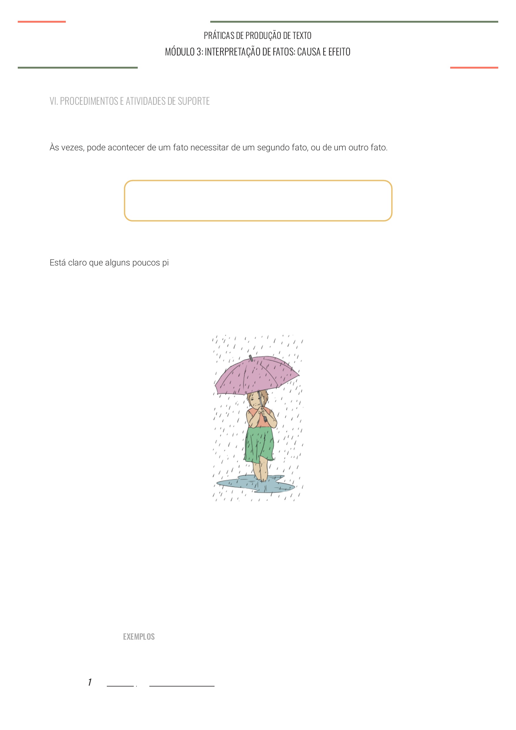 27/02/2021 Interpretação de fatos: causa e efeito https://avamec.mec.gov.br/#/instituicao/sealf/curso/11961/unidade/7761/acessar?continue=true 1/9 Por exemplo: Cada vez que chove, a terra �ca molhada. PRÁTICAS DE PRODUÇÃO DE TEXTO MÓDULO 3: INTERPRETAÇÃO DE FATOS: CAUSA E EFEITO VI. PROCEDIMENTOS E ATIVIDADES DE SUPORTE Às vezes, pode acontecer de um fato necessitar de um segundo fato, ou de um outro fato. Está claro que alguns poucos pingos não bastam para a terra �car molhada; quando chove pouquinho, malmente abafa o pó. Mas quanto mais chove, mais molhada, ou até encharcada, �ca a terra. Ou seja, são dois fatos que, infalivelmente, estão em relação um com outro. O fato que começa primeiro é a causa do segundo fato; não signi�ca que primeiro para de chover, para depois começar a molhar. Pode continuar a chover e a terra já estar molhada; mas continuando a chuva, mais encharcado �ca o chão. A causa apenas começa antes; o segundo fato começa depois. O segundo fato, que é causado pelo primeiro, é a consequência dele (ou o efeito): o fato do chão estar molhado é efeito (consequência) da chuva. Assim, é o nosso raciocínio que compara os dois fatos e tira a conclusão de qual é a causa e de qual é o efeito. A linguagem pode apresentar de diversas maneiras a mesma causa e o mesmo efeito. Choveu, Causa molhando a terra. Efeito 1 EXEMPLOS 27/02/2021 Interpretação de fatos: causa e efeito https://avamec.mec.gov.br/#/instituicao/sealf/curso/11961/unidade/7761/acessar?continue=true 2/9 Chovendo, Causa a terra �cou molhada. Efeito 2 O nosso raciocínio não muda com a mudança da linguagem: a chuva será sempre a causa do molhamento; o molhamento será sempre o efeito da chuva. Entretanto na linguagem, quando pensamos no primeiro exemplo, o fato principal (pleno) é Choveu. Já no segundo exemplo, o fato principal é o outro: a terra �cou molhada. Veja: Choveu, Fato principal molhando a terra. Fato posterior 1 Chovendo, Fato anterior a terra �cou molhada. Fato principal 2 EXEMPLOS 27/02/2021 Interpretação de fatos: causa e efeito https://avamec.mec.gov.br/#/instituicao/sealf/curso/11961/unidade/7761/acessar?continue=true 3/9 Resultado: a linguagem muda, mas o raciocínio continua o mesmo. Interpretar um texto é agir de acordo com o raciocínio. Redigir é saber colocar o seu raciocínio nas mais diversas formas de linguagem. EXERCÍCIO Nº 19 1 Brilhando o Sol, as árvores lançavam sombras sobre a relva. 1 Causa 2 Efeito GABARITO 1 Brilhando o Sol, 2 as árvores lançavam sombras sobre a relva. 2 O Sol brilhava, lançando as árvores sombras Estabeleça a causa e o efeito (consequência) entre os dois fatos de cada notícia: 1 Brilhando o Sol, 2 as árvores lançavam sombras sobre a relva. 27/02/2021 Interpretação de fatos: causa e efeito https://avamec.mec.gov.br/#/instituicao/sealf/curso/11961/unidade/7761/acessar?continue=true 4/9 sobre a relva. 1 Causa 2 Efeito GABARITO 1 O Sol brilhava, 2 lançando as árvores sombras sobre a relva. 3 Começando a brilhar o Sol, as estrelas se apagam. 1 Causa 2 Efeito GABARITO 1 Começando a brilhar o Sol, 2 as estrelas se apagam. 1 O Sol brilhava, 2 lançando as árvores sombras sobre a relva. 1 Começando a brilhar o Sol, 2 as estrelas se apagam. 27/02/2021 Interpretação de fatos: causa e efeito https://avamec.mec.gov.br/#/instituicao/sealf/curso/11961/unidade/7761/acessar?continue=true 5/9 4 O avião caiu, morrendo todos os ocupantes. 1 Causa 2 Efeito GABARITO 1 O avião caiu, 2 morrendo todos os ocupantes. 5 O governo represou o rio, evitando as enchentes. 1 Causa 2 Efeito GABARITO 1 O governo represou o rio, 1 O avião caiu, 2 morrendo todos os ocupantes. 1 O governo represou o rio, 2 evitando as enchentes. 27/02/2021 Interpretação de fatos: causa e efeito https://avamec.mec.gov.br/#/instituicao/sealf/curso/11961/unidade/7761/acessar?continue=true 6/9 2 evitando as enchentes. 6 Entrando o vento pela janela, a cortina �ca esvoaçando. 1 Causa 2 Efeito GABARITO 1 Entrando o vento pela janela, 2 a cortina �ca esvoaçando. 7 Poluindo as indústrias o rio, morreram todos os peixes. 1 Causa 2 Efeito 1 Entrando o vento pela janela, 2 a cortina �ca esvoaçando. 1 Poluindo as indústrias o rio, 2 morreram todos os peixes. 27/02/2021 Interpretação de fatos: causa e efeito https://avamec.mec.gov.br/#/instituicao/sealf/curso/11961/unidade/7761/acessar?continue=true 7/9 GABARITO 1 Poluindo as indústrias o rio, 2 morreram todos os peixes. 8 Caindo fortes chuvas, o caçador procurou um abrigo. 1 Causa 2 Efeito GABARITO 1 Caindo fortes chuvas, 2 o caçador procurou um abrigo. 9 Nosso vizinho cometeu um grave crime, sendo condenado pela justiça. 1 Causa 2 Efeito 2 Caindo fortes chuvas, 1 o caçador procurou um abrigo. 2 27/02/2021 Interpretação de fatos: causa e efeito https://avamec.mec.gov.br/#/instituicao/sealf/curso/11961/unidade/7761/acessar?continue=true 8/9 GABARITO 1 Nosso vizinho cometeu um grave crime, 2 sendo condenado pela justiça. 10 Tendo o lavrador trabalhado duramente a manhã toda, sentiu grande fome ao meio-dia. 1 Causa 2 Efeito GABARITO 1 Tendo o lavrador trabalhado duramente a manhã toda, 2 sentiu grande fome ao meio-dia. Respondidas 10 de 10 questões 2 Nosso vizinho cometeu um grave crime, 1 sendo condenado pela justiça. 1 Tendo o lavrador trabalhado duramente a manhã toda, 2 sentiu grande fome ao meio-dia. Atividade concluída 27/02/2021 Interpretação de fatos: causa e efeito https://avamec.mec.gov.br/#/instituicao/sealf/curso/11961/unidade/7761/acessar?continue=true 9/9 2020. CAPES - PROGRAMA DE ACOLHIMENTO DA UNIVERSIDADE ABERTA DO BRASIL. 12 de 17 1 2 3 4 5 6 7 8 9 10 11 12 13 14 15 16 17 Progresso do Módulo https://avamec.mec.gov.br/ava-mec-ws/instituicao/sealf/conteudo/modulo/4041/uni3/slide11.html https://avamec.mec.gov.br/ava-mec-ws/instituicao/sealf/conteudo/modulo/4041/uni3/slide13.html https://avamec.mec.gov.br/ava-mec-ws/instituicao/sealf/conteudo/modulo/404
