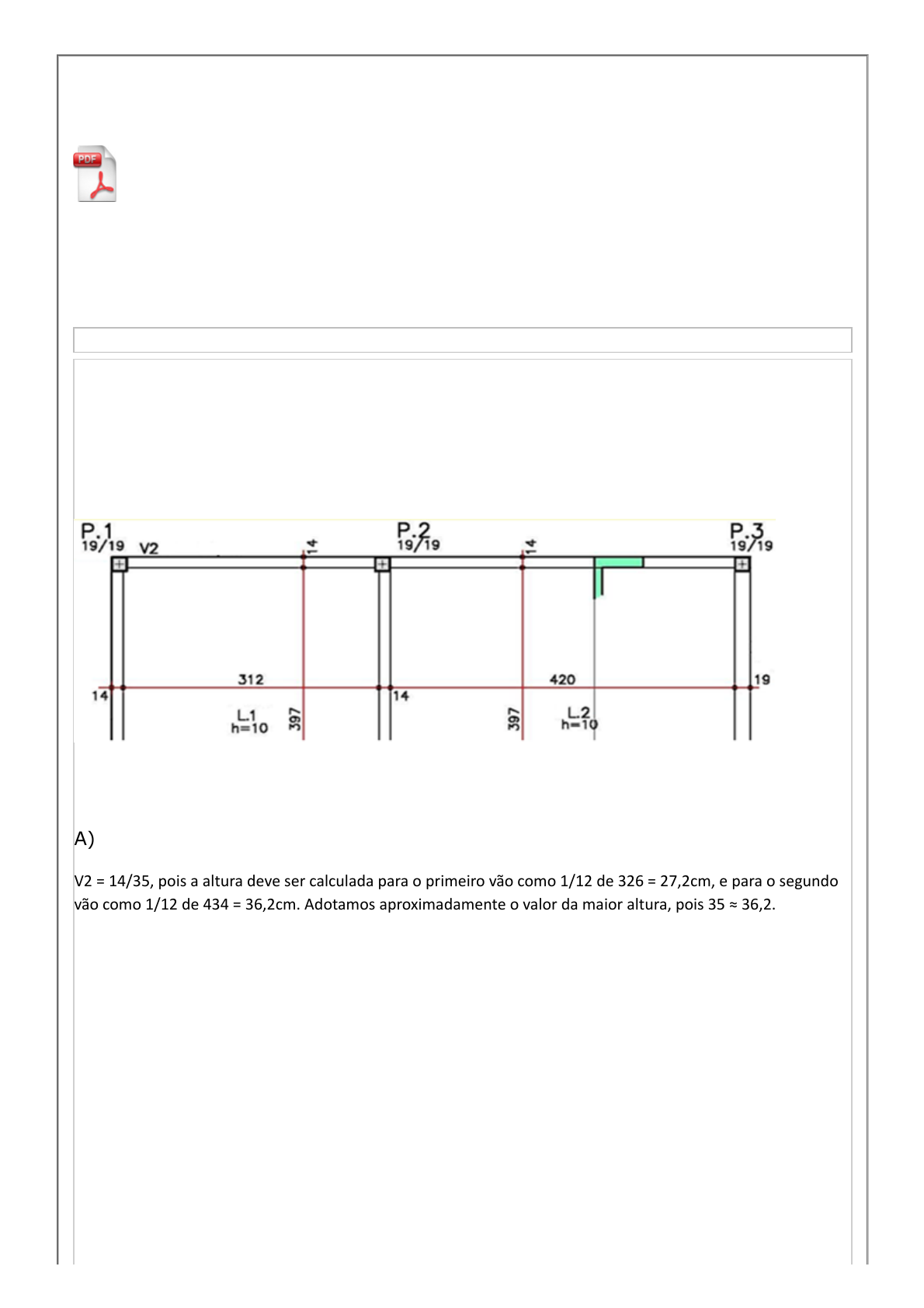 01/03/2021 UNIP - Universidade Paulista : DisciplinaOnline - Sistemas de conteúdo online para Alunos. https://online.unip.br/imprimir/imprimirconteudo 1/4 Aula 01 Para o periodo de 30/3 a 04/04/2020: realize os exercícios destre conteúdo. Exercício 1: Abaixo está apresentado um trecho da planta de formas de uma residência. A largura da viga V2 é de 14cm. De acordo com o critério simplificado, qual a seção mais apropriada para a viga V2, e como ela deve ser calculada? A) V2 = 14/35, pois a altura deve ser calculada para o primeiro vão como 1/12 de 326 = 27,2cm, e para o segundo vão como 1/12 de 434 = 36,2cm. Adotamos aproximadamente o valor da maior altura, pois 35 ≈ 36,2. B) V2 = 14/40, pois a altura deve ser calculada para o primeiro vão como 1/10 de 326 = 32,6cm, e para o segundo vão como 1/10 de 434 = 43,4cm. Adotamos aproximadamente o valor da maior altura, pois 40 ≈ 43,4. C) V2 = 14/65, pois a altura deve ser calculada como 1/12 de (326+434) = 1/12 . 760 = 63,3cm ≈ 65cm. D) V2 = 14/75, pois a altura deve ser calculada como 1/10 de (326+434) = 76cm, e 75 ≈ 76. https://online.unip.br/Arquivo?id=83100.pdf aaonascimento Realce 01/03/2021 UNIP - Universidade Paulista : DisciplinaOnline - Sistemas de conteúdo online para Alunos. https://online.unip.br/imprimir/imprimirconteudo 2/4 E) V2 = 14/30, pois a altura deve ser calculada para o primeiro vão como 1/12 de 326 = 27,2cm, e para o segundo vão como 1/12 de 434 = 36,2cm. Adotamos aproximadamente o valor da menor altura, pois 30 ≈ 27,2. Comentários: Essa disciplina não é ED ou você não o fez comentários Exercício 2: A seguir está um trecho da planta de formas de uma residência. Ao observarmos o desenho, é possível notar que, na região do cruzamento das vigas V3 e V5, as duas linhas que representam as arestas da V5 chegam até a linha superior da V3, e a linha de cima da aresta da V3 está interrompida, enquanto a linha de baixo não está interrompida. Isso significa que: A) A altura da V3 é maior que a da V5. B) A altura da V3 é menor que da V5. C) A altura da V3 é igual à da V5. D) A largura da V3 é maior que da V5. aaonascimento Realce 01/03/2021 UNIP - Universidade Paulista : DisciplinaOnline - Sistemas de conteúdo online para Alunos. https://online.unip.br/imprimir/imprimirconteudo 3/4 E) A largura da V3 é menor que da V5. Comentários: Essa disciplina não é ED ou você não o fez comentários Exercício 3: A seguir está um trecho da planta de formas de uma edificação. Nota-se que o pilar P5 nasce nesse pavimento. De posse desses dados, é possível definir a altura da V5: A) A V5 deve ter uma altura da ordem de 70cm, ou seja 665/10. B) A V5 deve ter uma altura da ordem de 55cm, ou seja 665/12. C) aaonascimento Realce 01/03/2021 UNIP - Universidade Paulista : DisciplinaOnline - Sistemas de conteúdo online para Alunos. https://online.unip.br/imprimir/imprimirconteudo 4/4 A altura da V5 deve ser definida em função da carga do P5 e não pode ser determinada pelo critério simplificado. D) A V5 deve ter uma altura da ordem de 30 cm, pois o primeiro vão é de 3,00m e o segundo de 3,65m. Cada um deles dividido por 12 resulta em 25cm para o primeiro vão e 30,4cm para o segundo vão. E) A V5 deve ter uma altura da ordem de 35 cm, pois o primeiro vão é de 3,00m e o segundo de 3,65m. Cada um deles dividido por 10 resulta em 30cm para o primeiro vão e 36,5cm para o segundo vão. Comentários: Essa disciplina não é ED ou você não o fez comentários aaonascimento Realce