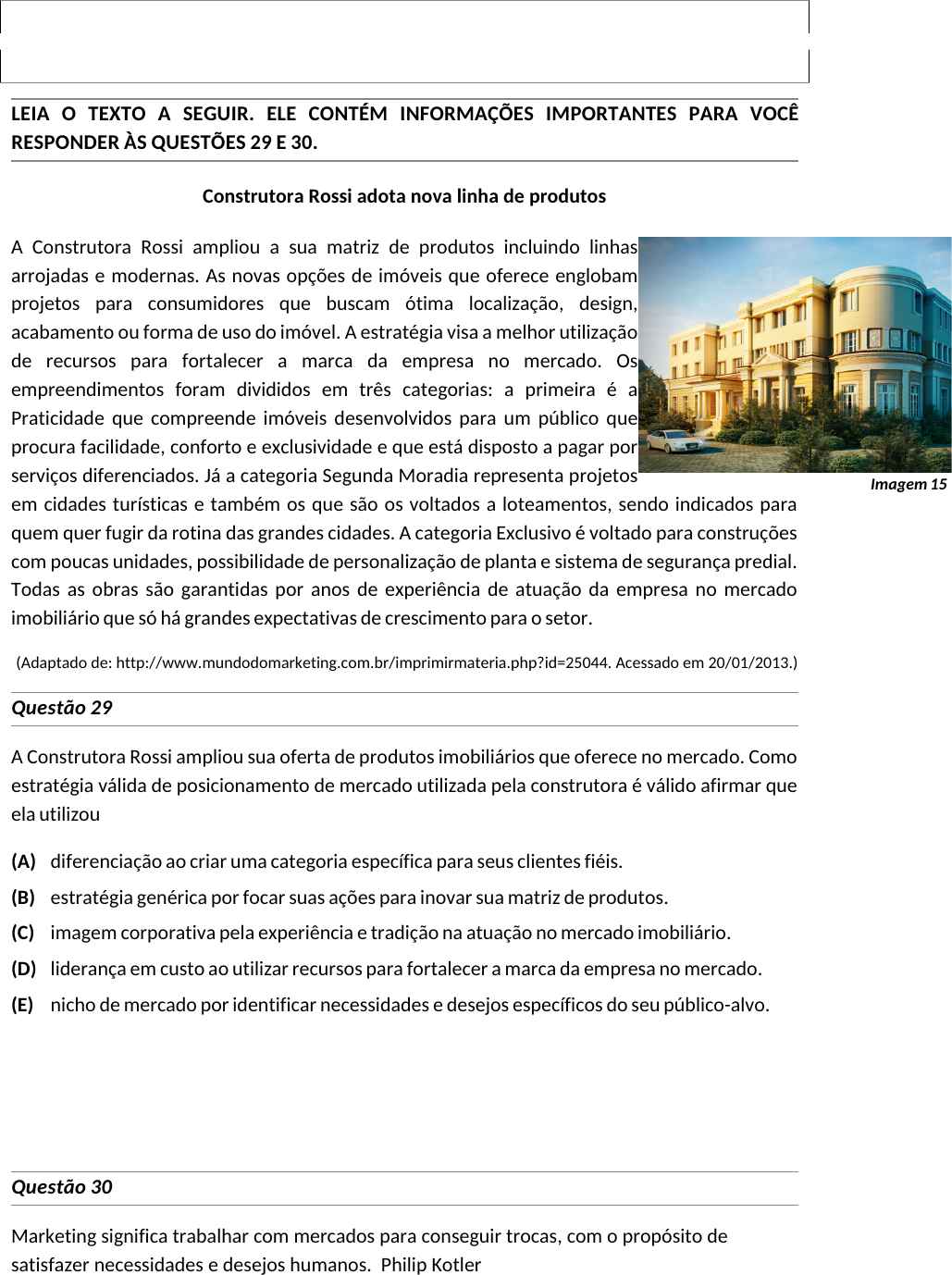 Básico módulo1 Capítulo 15 LEIA O TEXTO A SEGUIR. ELE CONTÉM INFORMAÇÕES IMPORTANTES PARA VOCÊ RESPONDER ÀS QUESTÕES 29 E 30. Construtora Rossi adota nova linha de produtos A Construtora Rossi ampliou a sua matriz de produtos incluindo linhas arrojadas e modernas. As novas opções de imóveis que oferece englobam projetos para consumidores que buscam ótima localização, design, acabamento ou forma de uso do imóvel. A estratégia visa a melhor utilização de recursos para fortalecer a marca da empresa no mercado. Os empreendimentos foram divididos em três categorias: a primeira é a Praticidade que compreende imóveis desenvolvidos para um público que procura facilidade, conforto e exclusividade e que está disposto a pagar por serviços diferenciados. Já a categoria Segunda Moradia representa projetos em cidades turísticas e também os que são os voltados a loteamentos, sendo indicados para quem quer fugir da rotina das grandes cidades. A categoria Exclusivo é voltado para construções com poucas unidades, possibilidade de personalização de planta e sistema de segurança predial. Todas as obras são garantidas por anos de experiência de atuação da empresa no mercado imobiliário que só há grandes expectativas de crescimento para o setor. (Adaptado de: http://www.mundodomarketing.com.br/imprimirmateria.php?id=25044. Acessado em 20/01/2013.) Questão 29 A Construtora Rossi ampliou sua oferta de produtos imobiliários que oferece no mercado. Como estratégia válida de posicionamento de mercado utilizada pela construtora é válido afirmar que ela utilizou (A) diferenciação ao criar uma categoria específica para seus clientes fiéis. (B) estratégia genérica por focar suas ações para inovar sua matriz de produtos. (C) imagem corporativa pela experiência e tradição na atuação no mercado imobiliário. (D) liderança em custo ao utilizar recursos para fortalecer a marca da empresa no mercado. (E) nicho de mercado por identificar necessidades e desejos específicos do seu público-alvo. Questão 30 Marketing significa trabalhar com mercados para conseguir trocas, com o propósito de satisfazer necessidades e desejos humanos. Philip Kotler Imagem 15 bsiilva.3012@gmail.com Tendo a definição de Marketing como referência, é válido afirmar que a Construtora Rossi aplicou marketing em suas ações quando: (A) utilizou adequadamente recursos próprios para fortalecer sua imagem no mercado imobiliário, possibilitando a personalização das construções. (B) atendeu as necessidades da empresa ao criar produtos imobiliários com características arrojadas e modernas frente aos concorrentes. (C) estudou o mercado onde atua para entender o que os consumidores desejam e criaram imóveis de acordo com suas expectativas. (D) investiu no aperfeiçoamento de sua matriz de produtos ao dividir os tipos de construções em categorias diferentes e disponíveis no mercado imobiliário. (E) estruturou categorias de produtos imobiliários para atender a demanda existente de consumidores que buscam diferenciar-se no mercado. bsiilva.3012@gmail.com