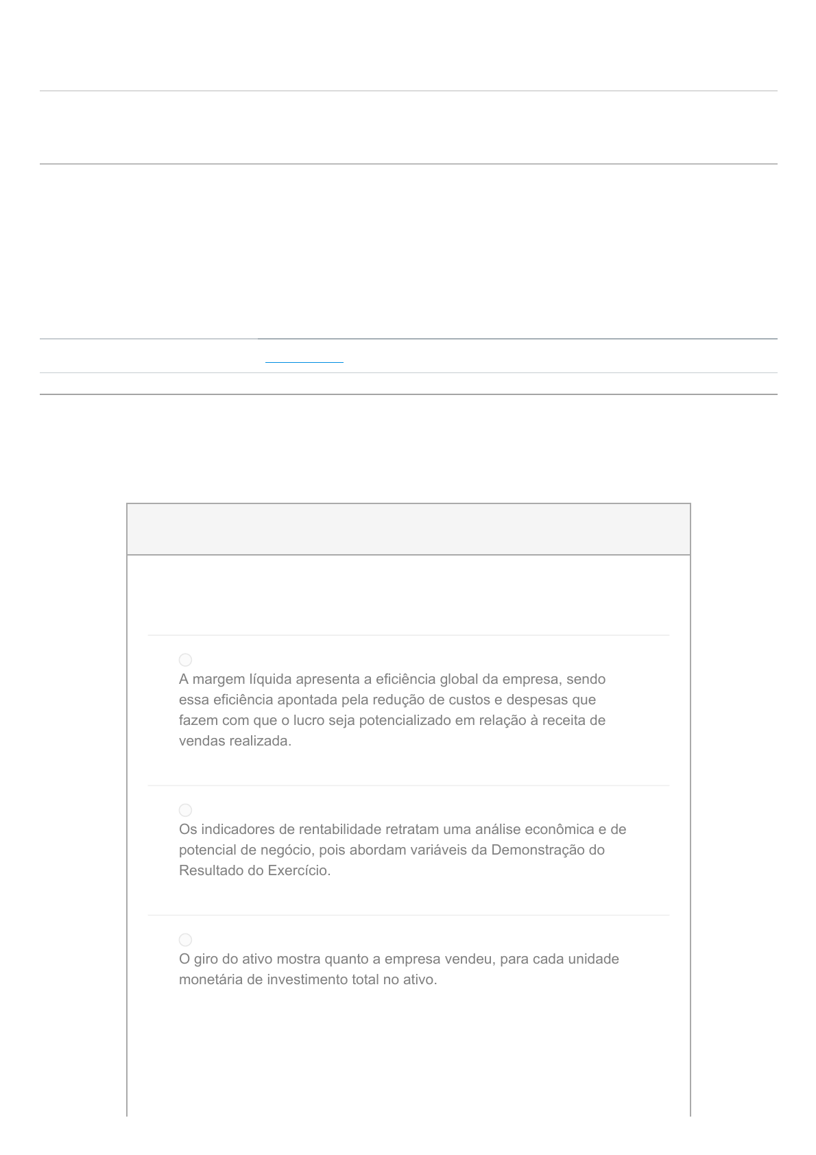 29/09/2020 Objetiva 03: Análise das Demonstrações Contábeis - 2020/2 https://pucminas.instructure.com/courses/31640/quizzes/71337?module_item_id=573450 1/15 Obje�va 03 Entrega 17 set em 23:59 Pontos 4 Perguntas 10 Disponível 9 set em 0:00 - 17 set em 23:59 9 dias Limite de tempo Nenhum Este teste foi travado 17 set em 23:59. Histórico de tenta�vas Tentativa Tempo Pontuação MAIS RECENTE Tentativa 1 4.911 minutos 3,2 de 4 Pontuação deste teste: 3,2 de 4 Enviado 17 set em 22:17 Esta tentativa levou 4.911 minutos. 0,4 / 0,4 ptsPergunta 1 Sobre os indicadores de rentabilidade, só não é correto afirmar que: A margem líquida apresenta a eficiência global da empresa, sendo essa eficiência apontada pela redução de custos e despesas que fazem com que o lucro seja potencializado em relação à receita de vendas realizada. Os indicadores de rentabilidade retratam uma análise econômica e de potencial de negócio, pois abordam variáveis da Demonstração do Resultado do Exercício. O giro do ativo mostra quanto a empresa vendeu, para cada unidade monetária de investimento total no ativo. https://pucminas.instructure.com/courses/31640/quizzes/71337/history?version=1 29/09/2020 Objetiva 03: Análise das Demonstrações Contábeis - 2020/2 https://pucminas.instructure.com/courses/31640/quizzes/71337?module_item_id=573450 2/15 No indicador de retorno sobre o patrimônio líquido, caso a empresa tenha prejuízo, não é possível interpretar o resultado para avaliar o desempenho da empresa. Correto!Correto! Está incorreto o item que diz: “No indicador de retorno sobre o patrimônio líquido, caso a empresa tenha prejuízo, não é possível interpretar o resultado para avaliar o desempenho da empresa”, pois é possível calcular mesmo que não tenha lucro, podendo o ROE ser negativo também. 0 / 0,4 ptsPergunta 2 Os indicadores de liquidez indicam a capacidade que a empresa tem em liquidar suas dívidas, evidenciando, inclusive, a relação entre o volume de recursos, aplicações e obrigações. Os dados a seguir apresentam a posição patrimonial da entidade Sweetness S/A em 31 de dezembro de 2015 e 2014 (comparativo). 29/09/2020 Objetiva 03: Análise das Demonstrações Contábeis - 2020/2 https://pucminas.instructure.com/courses/31640/quizzes/71337?module_item_id=573450 3/15 Indique o item que retrata a realidade financeira na ótica da análise de liquidez da empresa Sweetness em 2014 e 2015: Com base nos indicadores de liquidez, observa-se que a empresa Sweetness não consegue liquidar todo seu passivo com recursos do ativo, todavia, ela tem apresentado sinais de recuperação em 2015, principalmente em relação a liquidez imediata, pois apresenta em 33,5% só de recursos imediatos para liquidar suas dívidas com terceiros no curto prazo. 29/09/2020 Objetiva 03: Análise das Demonstrações Contábeis - 2020/2 https://pucminas.instructure.com/courses/31640/quizzes/71337?module_item_id=573450 4/15 Os indicadores de liquidez pioraram em 2015, com exceção da liquidez geral que apresentou pequena melhora. ocê respondeuocê respondeu A liquidez geral é sempre maior que os demais indicadores de liquidez, pois considera ativos tanto do circulante como também do não circulante. A liquidez se apresentou deficitária em todos os indicadores de liquidez em ambos os períodos, indicando que os capitais de terceiros superam os ativos considerados nos cálculos. esposta corretaesposta correta 29/09/2020 Objetiva 03: Análise das Demonstrações Contábeis - 2020/2 https://pucminas.instructure.com/courses/31640/quizzes/71337?module_item_id=573450 5/15 2015 2014 LG 41,5% 54,9% LC 51,4% 87,3% LS 48,0% 83,1% LI 33,5% 62,5% -De acordo com os cálculos, a liquidez se apresentou deficitária em todos os indicadores de liquidez em ambos os períodos, indicando que os capitais de terceiros superam os ativos considerados nos cálculos. Liquidez deficitária ocorre quando é menor que 1 ou 100%. -A liquidez geral é NEM sempre maior que os demais indicadores de liquidez, pois considera ativos tanto do circulante como também do não circulante. -TODOS OS INDICADORES PIORARAM EM 2015 E NÃO APRESENTOU SINAIS DE RECUPERAÇÃO. 0,4 / 0,4 ptsPergunta 3 Analise as informações a seguir, referentes ao Balanço Patrimonial da 29/09/2020 Objetiva 03: Análise das Demonstrações Contábeis - 2020/2 https://pucminas.instructure.com/courses/31640/quizzes/71337?module_item_id=573450 6/15 Cia. MMS, relativo ao exercício financeiro de X8: Considere que a Liquidez Corrente representa o quanto a empresa tem no ativo circulante para cada R$1,00 de passivo circulante. Considere que a Composição do Endividamento representa qual é o percentual de obrigações em relação ao passivo total. Com base nessas informações, quais são, respectivamente, o índice de liquidez corrente e a participação do capital de terceiros? 0,75 e 52%. esposta corretaesposta correta 0,75 e 63%. ocê respondeuocê respondeu 1,93 e 40%. 1,12 e 114%. 29/09/2020 Objetiva 03: Análise das Demonstrações Contábeis - 2020/2 https://pucminas.instructure.com/courses/31640/quizzes/71337?module_item_id=573450 7/15 O ativo circulante contempla as contas Caixa, Clientes, Aplicações Financeiras (Curto Prazo), e ICMS a Recuperar, totalizando R$ 3.300. O passivo circulante contempla as contas: Empréstimo (Curto Prazo), Fornecedores, Títulos a Pagar (Curto Prazo), e Provisão para Férias e 13º Salário, totalizando R$ 4.400. Portanto, o índice de liquidez corrente consiste em 3.300/4.400=0,75. E a participação do capital de terceiros considerou os R$ 7.500 do passivo circulante sobre o passivo total – R$ 14.500, que resulta em 52% das obrigações com ocorrência no curto prazo. 0,4 / 0,4 ptsPergunta 4 A empresa Comércio Operacional S/A apresenta os seguintes valores, em 31/12/2013: Bancos conta Movimento R$100.000,00 Fornecedores R$170.000,00 Mercadorias em Estoque R$180.000,00 Impostos a Recolher R$ 30.000,00 Duplicatas