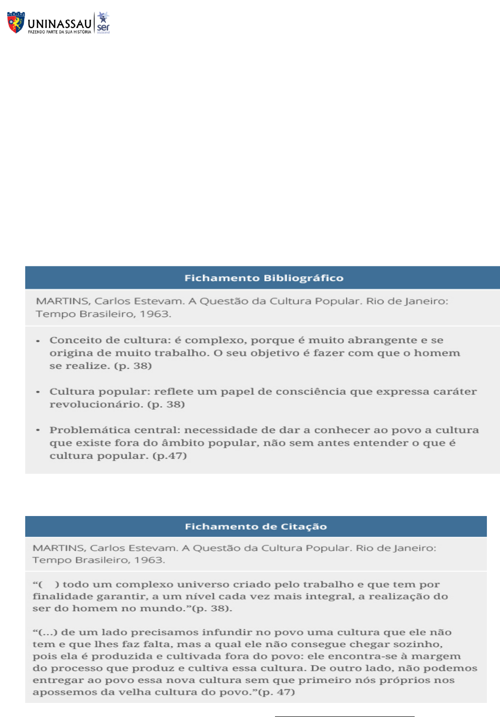 DISCIPLINA: ESTÁGIO SUPERVISIONADO III SEMESTRE: 2021.1 DOCENTE: FRANCÉLIA SALES 1 Texto Complementar: DICAS PARA FAZER FICHAMENTO1 ➢ Conceito: Registro dos estudos de um livro ou de um texto. O fichamento pode ser feito manualmente em fichas, em blocos de anotações ou em suporte informático. ➢ Objetivo: Facilitar ▪ a execução dos trabalhos acadêmicos ▪ a assimilação dos conteúdos estudados ➢ Tipos: ▪ Bibliográfico: É a descrição, com comentários dos tópicos abordados em uma obra inteira ou parte dela. ▪ Citações: Transcrição textual: reprodução fiel das frases que se pretende usar na redação do trabalho 1 Elaborado por Francélia Sales – Pedagoga. Mestra em Educação Profissional e Saúde. Colaboradora da UNINASAU Fortaleza. DISCIPLINA: ESTÁGIO SUPERVISIONADO III SEMESTRE: 2021.1 DOCENTE: FRANCÉLIA SALES 2 ▪ Textual/Conteúdo: É uma síntese das principais ideias contidas na obra. O autor elabora com suas próprias palavras a interpretação do que foi dito. ➢ Estrutura: cabeçalho, referência bibliográfica e texto, onde você deve escrever o conteúdo principal
