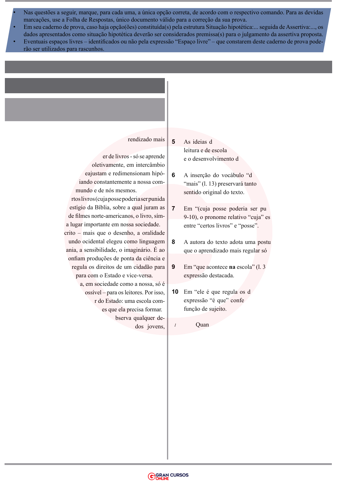 SIMULADO POLÍCIA FEDERAL – AGENTE POLÍCIA FEDERAL – AGENTE • Nas questões a seguir, marque, para cada uma, a única opção correta, de acordo com o respectivo comando. Para as devidas marcações, use a Folha de Respostas, único documento válido para a correção da sua prova. • Em seu caderno de prova, caso haja opção(ões) constituída(s) pela estrutura Situação hipotética:... seguida de Assertiva:..., os dados apresentados como situação hipotética deverão ser considerados premissa(s) para o julgamento da assertiva proposta. • Eventuais espaços livres – identificados ou não pela expressão “Espaço livre” – que constarem deste caderno de prova pode- rão ser utilizados para rascunhos. � Baseado no formato de prova � aplicado pela banca Cebraspe LÍNGUA PORTUGUESA GRAMÁTICA E TEXTO (LUCAS LEMOS) 1 Se a chamada leitura do mundo se aprende por aí, na tal escola da vida, a leitura de livros carece de aprendizado mais regular, que acontece na escola. � Mas leitura - quer do mundo quer de livros - só se aprende 5 e se vivencia de forma plena coletivamente, em intercâmbio de leituras que se refinam, reajustam e redimensionam hipó- teses de significado, ampliando constantemente a nossa com- preensão dos outros, do mundo e de nós mesmos. � Da proibição de certos livros (cuja posse poderia ser punida 10 com a fogueira) ao prestígio da Bíblia, sobre a qual juram as testemunhas em júris de filmes norte-americanos, o livro, sím- bolo da leitura, ocupa lugar importante em nossa sociedade. � Foi o texto escrito – mais que o desenho, a oralidade ou o gesto – que o mundo ocidental elegeu como linguagem 15 que cimenta a cidadania, a sensibilidade, o imaginário. É ao texto escrito que se confiam produções de ponta da ciência e da filosofia; ele é que regula os direitos de um cidadão para com os outros, de todos para com o Estado e vice-versa. � Pois a cidadania plena, em sociedade como a nossa, só é 20 possível – se e quando ela é possível – para os leitores. Por isso, a escola é direito de todos e dever do Estado: uma escola com- petente, como precisam ser os leitores que ela precisa formar. � Daí, Talvez, o susto com que se observa qualquer de- clínio na prática de leitura, principalmente dos jovens, 25 observação imediatamente transformada em diagnóstico de uma crise da leitura, geralmente encarada como anúncio do apocalipse, da derrocada da cultura e da civilização. Marisa Lajolo (Com adaptações) Considerando os aspectos sintáticos e semânticos, julgue os itens seguintes. 1 Infere-se que a “leitura do mundo” substitui com êxito a lei- tura regular exigida na escola. 2 É possível depreender que a linguagem escrita torna outras formas de comunicação inúteis. 3 Pode-se afirmar que a Bíblia é o livro que “ocupa lugar im- portante em nossa sociedade”. 4 Fica claro que a falta de leitura preocupa pela sua relação de causa e efeito com a cidadania, visto que aquele que lê, neces- sariamente, alcança a plena cidadania. 5 As ideias do texto permitem depreender que a ausência de leitura e de escola competente agrava os valores da juventude e o desenvolvimento de uma nação. 6 A inserção do vocábulo “do” imediatamente após o termo “mais” (l. 13) preservará tanto a correção gramatical quanto o sentido original do texto. 7 Em “(cuja posse poderia ser punida com a fogueira)” (l. 9-10), o pronome relativo “cuja” estabelece relação de posse entre “certos livros” e “posse”. 8 A autora do texto adota uma postura generalista ao afirmar que o aprendizado mais regular só acontece na escola. 9 Em “que acontece na escola” (l. 3), há clara ideia de posse na expressão destacada. 10 Em “ele é que regula os direitos de um cidadão” (l. 17), a expressão “é que” confere ênfase ao elemento que exerce a função de sujeito. 1 Quando indaguei a alguns escritores de sucesso que manual de estilo tinha consultado durante seu aprendizado, a resposta mais comum foi “nenhum”. Disseram que escrever, para eles, aconteceu naturalmente. 5 Eu seria o último dos mortais a duvidar que os bons escritores foram abençoados com uma dose inata de fluência mais sintaxe e memória para as palavras. Ninguém nasceu com competência para redigir. Essa competência pode não se ter originado nos manuais de estilo, mas deve ter vindo de 10 algum lugar. � Esse algum lugar é a escrita de outros escritores. Bons escritores são leitores ávidos. Assimilaram um grande in- ventário de palavras, expressões idiomáticas, construções, tropos e truques retóricos e, com eles, a sensibilidade para 15 o modo como se combinam ou se repelem. Essa é a ardilosa “sensibilidade” de um escritor hábil — o tácito sentido de SIMULADO POLÍCIA FEDERAL – AGENTE estilo que os manuais de estilo honestos admitem ser impos- sível ensinar explicitamente. Os biógrafos dos grandes auto- res sempre tentam rastrear os livros que seus personagens 20 leram na juventude, porque sabem que essas fontes escondem o segredo de seu aperfeiçoamento como escritores. � O ponto de partida para alguém tornar-se um bom escritor é ser um bom leitor. Os escritores adqui- rem sua técnica identificando, saboreando e aplicando 25 engenharia reversa em exemplos de boa prosa. Steven Pinker. Guia de escrita: como conceber um texto com clareza, precisão e elegância. Trad. Rodolfo Ilari. São Paulo: Contexto, 2016, p. 23-4 (com adaptações) Quanto aos aspectos gramaticais e semânticos do texto, julgue os itens a seguir. 11 Infere-se, a partir da leitura do texto, que, para se tornar um bom escritor, é preciso antes de tudo ser um bom leitor. 12 O sujeito da oração iniciada pela forma verbal “Disseram” (l. 3) é elíptico e retoma, por coesão, “alguns escritores de sucesso” (l. 1). 13 Em “Disseram que escrever, para eles, aconteceu naturalmen- te” (l. 3 e 4), a supressão das vírgulas preserv