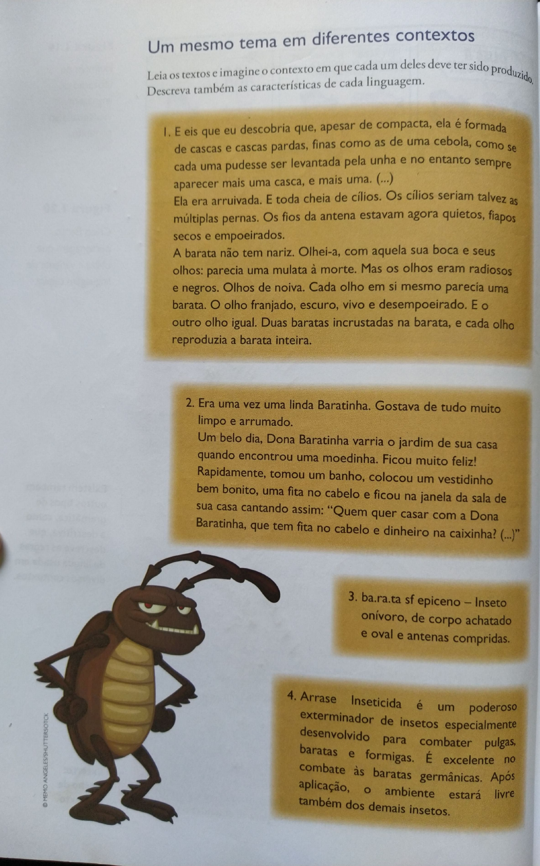 Um mesmo tema em diferentes contextos • .· • . • - 11 • 0 rnnrcxto cm <JUC cada um deles deve ter sido prod . Lc1,1 0,.,1cx1<>st 1111,1g1 L . Uz1d0 Dc~t rcv;1 t,1111hé111 a.\ c.,.11 ·" tctÍst jc;l', de c,1da linguagem. . 1. E eis que eu descobria que, apesar de compacta, ela é formada de cascas e cascas pardas, finas como as de uma cebola, como se cada uma pudesse ser levantada pela unha e no entanto sempre aparecer mais uma casca, e mais uma. ( ... ) Ela era arruivada. E toda cheia de cílios. Os cílios seriam talvez as múltiplas pernas. Os fios da antena estavam agora quietos, fiapos secos e empoeirados. A barata não tem nariz. Olhei-a, com aquela sua boca e seus olhos: parecia uma mulata à morte. Mas os olhos eram radiosos e negros. Olhos de noiva. Cada olho em si mesmo parecia uma barata. O olho franjado, escuro, vivo e desempoeirado. E o outro olho igual. Duas baratas incrustadas na barata, e cada olho reproduzia a barata inteira. 2. Era uma vez uma linda Baratinha. Gostava de tudo muito limpo e arrumado. Um belo dia, Dona Baratinha varria o jardim de sua casa quando encontrou uma moedinha. Ficou muito feliz! Rapidamente, tomou um banho, colocou um vestidinho bem bonito, uma fita no cabelo e ficou na janela da sala de sua c~sa cantando assim: "Quem quer casar com a Dona Baratinha, que tem fita no cabelo e dinheiro na caixinhal ( ... r 3· ba.ra.ta sf epiceno - Inseto onívoro, de corpo achatado e oval e antenas compridas. 4. Arrase 1 nsetlcida é um poderoso.i ~rmlnador de insetos especialmente ~•envolvido para combater pulgas, ratas e formigas. É excelente no. combate às ba , 11 ratas germânicas. Apos ap ca~o, 0 ambiente estará livre tambem dos demais insetos. 5. ( ... ) Cientistas ( ... ) encontraram o maior fóssil completo de uma barata. O fóssil de 300 mi lhões de anos é tão completo que a equipe da Universidade do Estado de Ohio pôde perceber as nervuras de suas asas e as protuberâncias de seu corpo. O inseto. Arthropleura pustulatus, com cerca de 8,9 centímetros, viveu durante o período Carbonífero, quando Ohio era um grande pântano tropical, disse Cary Easterday, uma estudante de graduação que ajudou no estudo ( .. . ) 6. Vou fazer um PS básico sobre ontem. Eu estava linda e maravilhosa indo dormir, quando fui tirar o acolchoado de cima da cama adivinhe quem estava me esperandom Sim!!! Uma barata horrível!!! Ai que nooojooo!!! Ela já estava morta (fizemos dedetização na minha casa há pouco tempo ... ), mas mesmo assim é terrível... em vez de um cara gato tá me esperando na cama me aparece uma barata ... ninguém merece ... como eu odeio barata, morro de MEDO!!! Meu lindo vovô foi tirar ela da minha caminha linda e eu, lógico, troquei a roupa de cama, afinal não ia dormir no leito de morte de uma barata nojenta ... Eu sei que isso pode parecer ridículo, mas eu assumo: morro de medo delas ... Valeu! Precisava contar isso ... 7. Encontrei uma barata na cozinha Eu olhei pra ela, ela olhou pra mim Ofereci a ela um pedaço de pudim O curioso foi que ela Ela disse sim, vem cá ficar comigo Sim! Gosta de tudo que eu gosto Sim! Vem cá ficar comigo Sim! Vem, Kafka ... 31