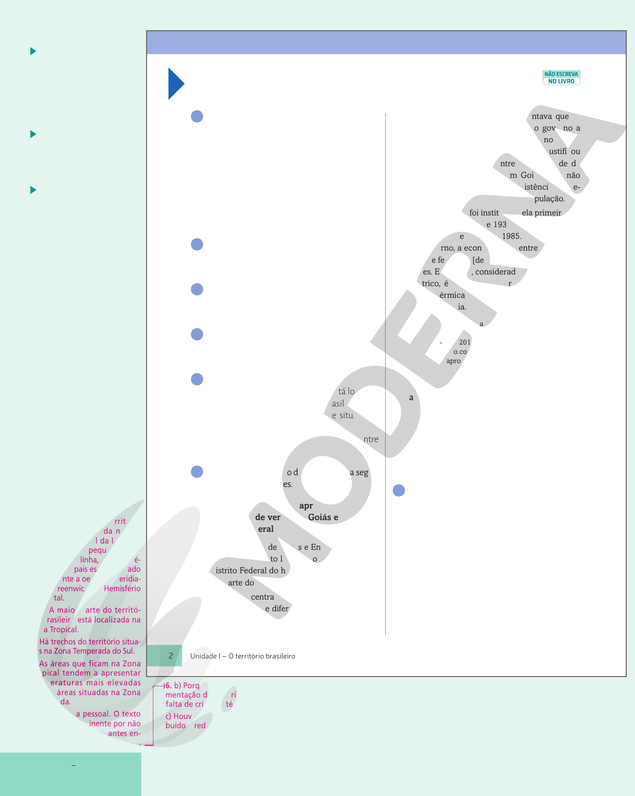 atividades 1 Observe novamente as ilustrações e os mapas deste Capítulo para responder às questões a seguir. a) A maior parte do território brasileiro está lo- calizado em qual hemisfério? b) Quais são as principais linhas imaginárias que passam pelo Brasil? c) Identifique as zonas térmicas em que o Bra- sil possui terras e os paralelos que as delimi- tam. 2 Explique como a extensão do país no sentido norte-sul (latitudinal) pode resultar em uma grande diversidade das paisagens naturais. 3 Cite uma característica decorrente da extensão leste-oeste (longitudinal) do território brasi- leiro. 4 Qual é a posição geográfica do Brasil em re- lação aos hemisférios da Terra? Justifique sua resposta. 5 Indique: a) Em qual zona térmica da Terra está localiza- da a maior parte do território brasileiro. b) Em qual outra zona térmica se situam al- guns trechos do território. c) Qual é a principal diferença climática entre essas duas zonas. 6 Faça a leitura do trecho da reportagem a seguir e responda às questões. Comissão da Câmara aprova fim do horário de verão em Goiás e Distrito Federal A Comissão de Minas e Energia aprovou o projeto de decreto legislativo que tira Goiás e Distrito Federal do horário de verão instituído em parte do país. [...] A ideia central [...] é de que o estado não possui relevante diferença entre o dia e a noi- te, o que traria efeitos negativos para a popula- ção e não ajudaria a poupar energia. [...] No texto, Waldir [...] argumentava que “a falta de critérios técnicos levou o governo a equívocos em sua política de economia de energia elétrica desde o início”. Ele justificou que não há diferença entre a quantidade de horas do dia e da noite em Goiás, logo não haveria justa causa para a subsistência da me- dida, que causaria ônus para a população. [...] O programa foi instituído pela primeira vez no Brasil no verão de 1931/1932 e é adotado continuadamente desde 1985. Segundo dados do governo, a economia [...] (entre outubro de 2016 e fevereiro [de 2017]) foi de R$ 159,5 mi- lhões. Esse valor, considerado baixo pelo setor elétrico, é decorrente da redução do uso de usinas térmicas para complementar a deman- da por energia. COMISSÃO da Câmara aprova fim do horário de verão em Goiás e Distrito Federal. O Globo, 1o nov. 2017. Disponível em: <https://oglobo. globo.com/economia/comissao-da-camara- aprova-fim-do-horario-de-verao-em-goias- distrito-federal-22018015>. Acesso em: 14 nov. 2017. a) De acordo com o texto, você considera per- tinente que o horário de verão passe a não vigorar mais em Goiás e no Distrito Federal? b) Por que, depois de ter sido adotado, o horá- rio de verão foi revisto e retirado nessa área? c) Há economia nos gastos de energia com a adoção do horário de verão? 7 Analise as afirmações apresentadas e escre- va, em seu caderno, a alternativa correta. a) Os horários em todo o Brasil seguem a hora da capital, Brasília, o chamado limite prático. b) O limite prático divide o Brasil em quatro zonas de fusos horários. c) O Brasil está localizado em apenas uma zona de fuso horário, sem a necessidade do chamado limite prático. d) O Brasil apresenta diferença de até duas horas entre fusos divididos por um limite prático. R ep ro du çã o pr oi bi da . A rt. 1 84 d o C ód ig o P en al e L ei 9 .6 10 d e 19 d e fe ve re iro d e 19 98 . Unidade I – O território brasileiro20 Seção Atividades Objetos de conhecimento • Ideias e concepções sobre a formação territorial do Brasil. • Mapas temáticos do Brasil. • Biodiversidade brasileira. Habilidades EF07GE01 EF07GE09 EF07GE11 Respostas 1. a) A maior parte do território brasileiro está situada nos he- misférios Sul (ou Meridional) e Oeste (ou Ocidental). b) O Brasil é cortado pela linha do Equador e pelo trópico de Capricórnio. c) O Brasil localiza-se na Zona Tro- pical, delimitada pelos trópicos de Câncer e de Capricórnio; uma pe- quena área territorial situa-se na Zona Temperada do Sul, delimita- da pelo trópico de Capricórnio e pelo círculo polar Antártico. 2. Devido à grande extensão ter- ritorial no sentido norte-sul, o Brasil apresenta paisagens com predominância de elementos naturais muito diversificados, re- sultado da influência climática. Enquanto no norte do território são encontradas paisagens do- minadas por vegetações adapta- das a climas mais quentes, no sul há paisagens caracterizadas por vegetações adaptadas a tempe- raturas mais baixas. 3. A grande extensão terri- torial brasileira no sentido leste-oeste faz com que o país apresente, atualmente, quatro fusos horários. 4. A maior parte do território brasileiro está situada no He- misfério Sul, ao sul da linha do Equador, e uma pequena parte ao norte dessa linha, no Hemisfé- rio Norte. O país está localizado inteiramente a oeste do meridia- no de Greenwich, no Hemisfério Ocidental. 5. a) A maior parte do territó- rio brasileiro está localizada na Zona Tropical. b) Há trechos do território situa- dos na Zona Temperada do Sul. c) As áreas que ficam na Zona Tropical tendem a apresentar temperaturas mais elevadas que as áreas situadas na Zona Temperada. 6. a) Resposta pessoal. O texto indica que é pertinente por não haver diferenças relevantes en- tre os dias e as noites nessa área. X 6. b) Porque foi observado que não existe diferença de horas de dia e noite em Goiás e no Distrito Federal, e a imple- mentação do horário de verão não resultou em economia significativa de energia elétrica. Sua adoção é atribuída à falta de critérios técnicos. c) Houve uma economia de R$ 159,5 milhões entre outubro de 2016 e fevereiro de 2017, valor considerado baixo e atri- buído à redução do uso de usinas térmicas e não diretamente à adoção do horário de verão. 20 – 1o BIMESTRE https://oglobo.globo.com/economia/comissao-da-camara-aprova-fim-do-horario-de-verao-em-goias-distrito-fed