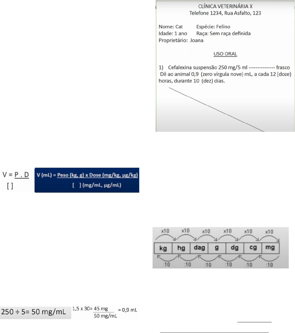 Se o medicamento for comprimido, lembre-se – que você pode partir ao meio. Usa-se regra de três. Se o medicamento for líquido, divide-se pela – concentração. A concentração é dada pela fórmula farmacêutica (apresentação do medicamento). Toda vez que for fazer a divisão pela concentração, a unidade deve estar em mg/mL (1 mL). Quando as apresentações não derem o valor exato do comprimido (mesmo quando partidos ao meio), utilizar a suspensão oral. Caso esteja com um valor maior passando pouco, pode usar o comprimido. Sempre prestar atenção na unidade em que está sendo utilizada! EXEMPLO 1: Gato 1,5 kg– Cefalexina 30 mg/kg– Apresentações:– 1) Comprimido: 75mg, 150 mg, 200 mg, 300 mg, 600 mg. 2) Suspensão oral: 250mg/ 5mL ➔ Modelo de receita desse medicamento: Colocar como a indústria vende → (250mg/ 5mL), não o valor que usamos para realizar o cálculo (50 mg/mL). EXEMPLO 2: – Cão 2 kg Acepromazina 0,02 mg/kg– Apresentações: 0,2% e 1%– Sempre que um medicamento se → apresentar em porcentagem como nesse caso, condiz que 0,2% equivale a 0,2 g em 100 mL -> convertendo seria 200 mg em 100 ml -> 2mg/mL. Ou seja, sempre que for porcentagem multiplique por 10 essa Aula 6 Cálculo– porcentagem para conseguir obter a concentração do medicamento em mg/mL. EXEMPLO 3: Quando diluir para concentração; Cavalo, 350 kg– Tiopental: 12,5 mg/kg (diluir para concentração – 5%) Obs.: tiopental é sólido (1g) Ou seja, precisaria de 5 frascos, já que cada → frasco só pode ser diluído a um volume de 20 mL, para alcançar o volume desejado de 87,5 mL é preciso dessa quantidade. EXEMPLO 4: Cão, 400g– Drontral puppy 1 mL/kg, frasco 20 mL– EXEMPLO 5: Obs.: É “veículo q.s.p.” porque se refere a um shampoo.