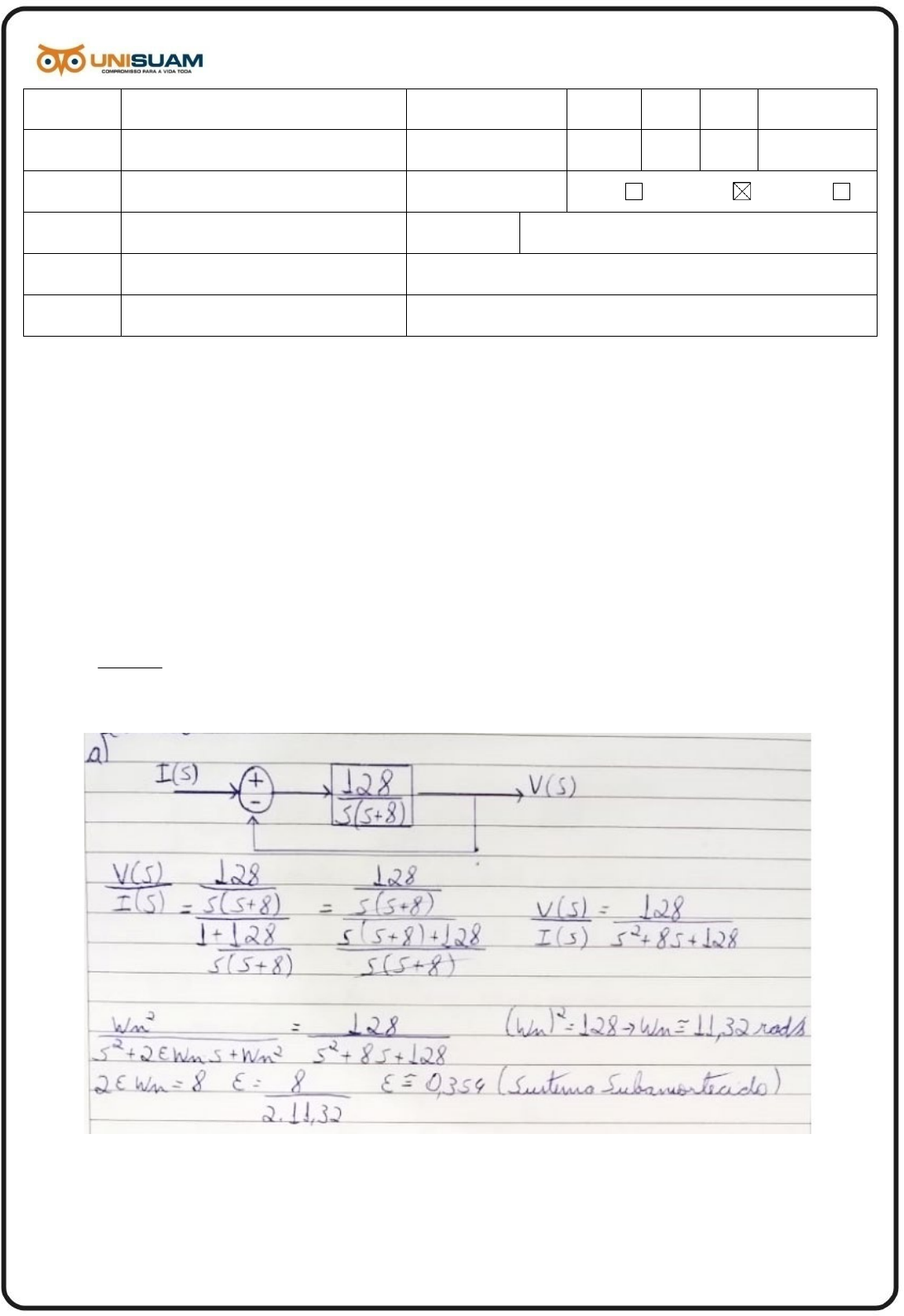 CENTRO UNIVERSITÁRIO AUGUSTO MOTTA CURSO: ENG. ELÉTRICA / MECÂNICA TURMA: ENG0001M VISTO DO COORDENADOR PROVA TRAB. GRAU RUBRICA DO PROFESSOR DISCIPLINA: CONTROLE E SERVOMECAN. AVALIAÇÃO REFERENTE: A1 A2 A3 PROFESSOR: GERALDO MOTTA MATRÍCULA: Nº NA ATA: DATA: 13 DE JUNHO DE 2020 NOME DO ALUNO: UNIDADE: BONSUCESSO – BS TRABALHO – AVALIAÇÃO A2 Instruções: 1. O trabalho é individual e poderá ser feito com consulta; 2. Indique CLARAMENTE sua resposta; 3. É necessário apresentar os cálculos em todas as questões. 4. A interpretação das questões faz parte da avaliação; 5. O valor total da avaliação é de 10,0 pontos, onde as questões aqui formuladas totalizam 8,0 pontos e os trabalhos entregues semanalmente ao longo das aulas valem 2,0 pontos. Questão 1: (2.0 pontos) Um sistema de controle de velocidade de um motor CC controlado pela corrente de armadura pode utilizar a tensão de força contra eletromotriz do motor como sinal de realimentação. Considere que este sistema pode ser modelado através de um sistema de retroação unitária onde a entrada é a corrente da bobina I (s), a saída é a tensão V (s) e a dinâmica da planta é dada pela função de transferência de malha aberta 𝐺𝐺(𝑠𝑠) = 128 𝑠𝑠 ∙ (𝑠𝑠+8) . Admitindo-se uma entrada degrau unitário, responda aos seguintes itens: (a) Determine o coeficiente de amortecimento e a frequência natural não amortecida. (0.6 pontos) (b) Determine o valor máximo de ultrapassagem e o tempo de acomodação. (0.6 pontos) 12200785 DAVID PIMENTEL SIMÕES (c) Para cada afirmação, indique se é verdadeira (V) ou falsa (F) e justifique as suas respostas indicando os cálculos quando necessário. (0.8 pontos) ( ) O sistema em malha fechada é subamortecido. ( ) A saída do sistema em malha fechada apresentará oscilações. ( ) Os dois pólos do sistema em malha fechada são reais e distintos. ( ) O sistema em malha fechada apresenta pólos complexos conjugados situados no eixo imaginário. Questão 2: (1.5 pontos) Um sistema de captação de energia em uma estação espacial orbital tem como objetivo manter os seus painéis solares apontados na direção do Sol. O sistema monitora continuamente a posição do Sol por meio de um controle de rastreamento solar que será utilizado para girar o painel através de juntas rotativas chamadas de juntas rotativas solares alfa. Um modelo simplificado para este tipo de dispositivo pode ser obtido a partir das equações abaixo, onde 𝑅𝑅(𝑠𝑠) é a entrada do sistema, 𝐸𝐸(𝑠𝑠) é o erro atuante de posicionamento, 𝐴𝐴(𝑠𝑠) e 𝐵𝐵(𝑠𝑠) são variáveis auxiliares, 𝐶𝐶(𝑠𝑠) é a saída do sistema (posição das placas solares): 𝐵𝐵(𝑠𝑠) = 1 𝑠𝑠 + 10 1 · 𝐴𝐴(𝑠𝑠) 𝐶𝐶(𝑠𝑠) = 𝑠𝑠2 ∙ 𝐵𝐵(𝑠𝑠) 𝐴𝐴(𝑠𝑠) = 𝐸𝐸(𝑠𝑠) − 𝐵𝐵(𝑠𝑠) 𝐸𝐸(𝑠𝑠) = 𝑅𝑅(𝑠𝑠) − 𝐶𝐶(𝑠𝑠) (a) Represente este sistema através de um diagrama de blocos. (0.5 pontos) (b) Classifique o sistema e determine o erro estacionário em regime permanente para a seguinte entrada aplicada ao sistema: 𝑟𝑟(𝑡𝑡) = 3 + 7𝑡𝑡, 𝑡𝑡 ≥ 0. (1.0 ponto) Questão 3: (1.5 pontos) Atualmente, o controle de soldagem em fábricas de automóveis é inteiramente mecanizado. Grandes robôs soldadores são utilizados para a execução desta tarefa, onde a ponta de solda precisa ser deslocada para diferentes posições no chassi do automóvel e frequentemente uma resposta rápida e exata é requerida. Este tipo de robô pode ser modelado por um sistema com realimentação unitária e função de transferência de malha aberta de quarta ordem: 𝐺𝐺(𝑠𝑠) = 30 𝑠𝑠4 + 8𝑠𝑠3 + 17𝑠𝑠2 + 16𝑠𝑠 Utilizando apenas o critério de Routh, responda aos seguintes itens referentes ao sistema em malha fechada: (a) O sistema será estável? (0.5 pontos) (b) Qual é o número de pólos sobre o eixo imaginário deste sistema? (0.5 pontos) (c) Qual é o número de pólos deste sistema localizados à direita da reta vertical 𝑠𝑠 = −4? (0.5 pontos) Questão 4: (3.0 pontos) O método do Lugar das Raízes (Root Locus) é uma importante ferramenta que permite determinar o posicionamento dos pólos da função de transferência de malha fechada de um sistema a partir do estudo dos pólos e zeros do sistema em malha aberta. As técnicas do lugar das raízes permitem o cálculo apurado da resposta no domínio do tempo, além de proporcionar prontamente informações relevantes sobre a resposta em frequência disponível. O diagrama do lugar das raízes pode ser traçado à medida que o ganho de malha aberta K varia de zero ao infinito. Trace o diagrama de lugar das raízes e indique claramente a região de estabilidade para os sistemas representados pelas seguintes equações características: (a) Equação Característica: 1 + 𝐾𝐾 (𝑠𝑠+14) ( 𝑠𝑠+2) ∙ (𝑠𝑠+4) ∙ (𝑠𝑠+6) ∙ (𝑠𝑠+8) = 0 (1.5 pontos) (b) Equação Característica: 1 + 𝐾𝐾 (𝑠𝑠+10) ∙ (𝑠𝑠−1) ( 𝑠𝑠+1) ∙ (𝑠𝑠+3) ∙ (𝑠𝑠+5) ∙ (𝑠𝑠+7) = 0 (1.5 pontos) GRAFICO DA QUESTÃO 4, LETRA A. GRAFICO QUESTÃO 4, LETRA B.