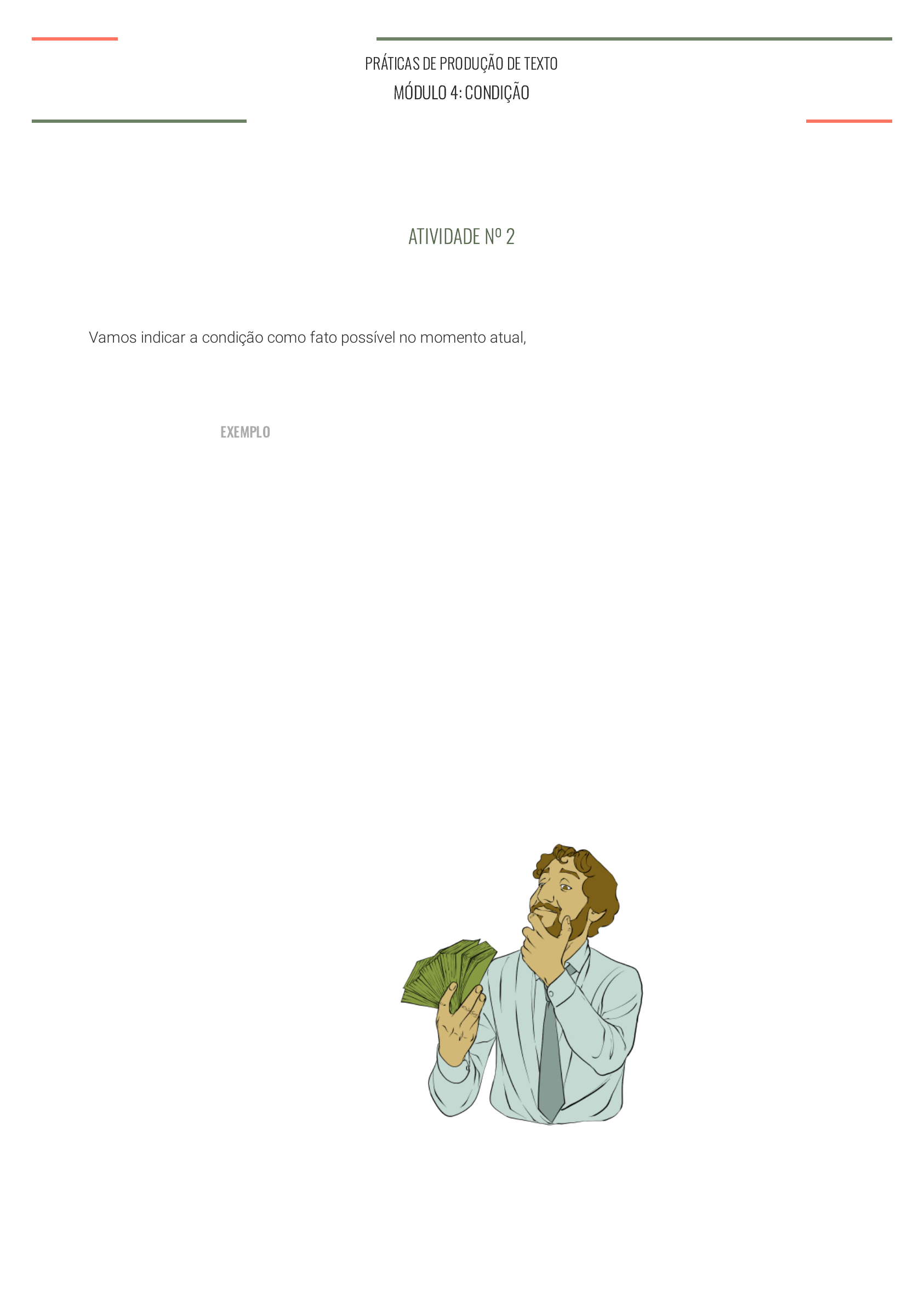 06/03/2021 CONDIÇÃO https://avamec.mec.gov.br/#/instituicao/sealf/curso/11961/unidade/7762/acessar?continue=false 1/9 ATIVIDADE Nº 2 PRÁTICAS DE PRODUÇÃO DE TEXTO MÓDULO 4: CONDIÇÃO Vamos indicar a condição como fato possível no momento atual, no presente, no agora. Economizando, o homem enriquece. Como �ca a mudança? Resposta: Se economiza, o homem enriquece. Ou: Se o homem economiza, enriquece. Como se faz a mudança? EXEMPLO 06/03/2021 CONDIÇÃO https://avamec.mec.gov.br/#/instituicao/sealf/curso/11961/unidade/7762/acessar?continue=false 2/9 EXERCÍCIO Nº 4 Apresente o primeiro fato como pleno. Inicie pelo vocábulo se. Coloque vírgula no �nal do primeiro fato. Você não vai querer que lembremos que, no �nal da notícia, aparece o ponto, não é mesmo? Mude as notícias, apresentando o primeiro fato como condição possível no momento atual. Levando eu o livro, mamãe se zanga. SE EU LEVO O LIVRO mamãe se a Trazendo eu o livro, mamãe se alegra. SE EU TRAGO o livro, mamãe se l b Dizendo você a verdade, papai se conforma. se você disser a verdade, papai se f c Andando devagar, vovô não se cansa. se andar devagar, vovô não se d Dançando a noite inteira, Joana não pode trabalhar no dia seguinte. se dançar a noite inteira, Joana ã d t b lh di e 06/03/2021 CONDIÇÃO https://avamec.mec.gov.br/#/instituicao/sealf/curso/11961/unidade/7762/acessar?continue=false 3/9 GABARITO a Se eu levo o livro, mamãe se zanga. b Se eu trago o livro, mamãe se alegra. c Se você diz a verdade, papai se conforma. d Se vovô anda devagar, não se cansa. e Se Joana dança a noite inteira, não pode trabalhar no dia seguinte. Respondida 1 de 1 questão EXERCÍCIO Nº 5 Observação: Também estão corretas as respostas em ordem inversa: Mamãe se zanga, se eu levo o livro. Atividade concluída Transforme as notícias, apresentando o fato anterior como condição possível, no passado; uma vez que possivelmente já aconteceu, mas você não sabe. EXEMPLO 06/03/2021 CONDIÇÃO https://avamec.mec.gov.br/#/instituicao/sealf/curso/11961/unidade/7762/acessar?continue=false 4/9 Economizando, José enriqueceu. Resposta: Se economizou, José enriqueceu. Ou: Se José economizou, enriqueceu. Dizendo João a verdade, papai se conformou. se disse a a verdade, papai se f a Trazendo Márcia algumas �ores, mamãe se alegrou. se trouxe algumas �ores, mamãe l b Ventando muito, caíram algumas árvores. c 06/03/2021 CONDIÇÃO https://avamec.mec.gov.br/#/instituicao/sealf/curso/11961/unidade/7762/acessar?continue=false 5/9 GABARITO a Se João disse a verdade, papai se conformou. b Se Márcia trouxe algumas �ores, mamãe se alegrou. c Se ventou muito, caíram algumas árvores. d Se Manuel disse algumas palavras delicadas, acalmou o vizinho. e Se a ponte ruiu, o tráfego �cou interrompido. Respondida 1 de 1 questão EXERCÍCIO Nº 6 se ventou muito caíram algumas á Dizendo Manuel algumas palavras delicadas, acalmou o vizinho. se disse algumas palavras d li d l i i h d Ruindo a ponte, o tráfego �cou interrompido. se ruiu a ponte, o tráfego �cou i t id e Observação: É correta também a ordem inversa. Atividade concluída Transforme a notícia, indicando o primeiro fato como condição possível no futuro, como algo que ainda poderá acontecer. (Evidentemente, os fatos futuros não são sempre reais, verdadeiros; mas podem ser possíveis etc.) 06/03/2021 CONDIÇÃO https://avamec.mec.gov.br/#/instituicao/sealf/curso/11961/unidade/7762/acessar?continue=false 6/9 Observação: Utilize a palavra você ou no primeiro fato, ou no segundo. A regra é a seguinte: Se o centro do interesse for o mesmo, apresente apenas uma única vez, em qualquer dos fatos...ou onde lhe soar melhor. Dizendo sempre a verdade, você será reconhecido como honesto. Resposta: Se (você) disser sempre a verdade, (você) será reconhecido como honesto. Ou: Você será reconhecido como honesto, se disser sempre a verdade. Trazendo a mana �ores, a mãe se alegrará. se você trouxer �ores a mãe se l á a Cantando, você espantará os seus males. você espantará os seus males se ê t b Desabafando com uma pessoa amiga, você há de tranquilizar-se. se desabafar com uma pessoa i ê há d t ili c EXEMPLO 06/03/2021 CONDIÇÃO https://avamec.mec.gov.br/#/instituicao/sealf/curso/11961/unidade/7762/acessar?continue=false 7/9 GABARITO Preparando bem as lições, venceremos na prova. se você preparar bem as lições, d Estando bem preparados, seremos felizes nos exames. se você estiver bem preparados, seremos felizes nos exames. e Selando Manuel a carta, eu a colocarei no correio. se Manuel selar a carta, eu a l i i f Não bebendo o rapaz em excesso, o vinho não fará mal. o vinho não fará mal a você se não b b g Ninguém desperdiçando cerveja, vão sobrar garrafas. se você desperdiçar cerveja, vão b f h Fazendo o menino sempre as lições, há de progredir. se você �zer sempre as lições, há de progredir. i Podendo, eles virão amanhã. se você puder , eles virão amanhã. j Observação: 06/03/2021 CONDIÇÃO https://avamec.mec.gov.br/#/instituicao/sealf/curso/11961/unidade/7762/acessar?continue=false 8/9 a Se a mana trouxer �ores, a mãe se alegrará. b Se você cantar, espantará os seus males. c Se você desabafar com uma pessoa amiga, há de tranquilizar-se. d Se prepararmos bem as lições, venceremos na prova. e Se estivermos bem preparados, seremos felizes nos exames. f Se Manuel selar a carta, eu colocarei no correio. g Se o rapaz não beber em excesso, o vinho não fará mal. h Se ninguém desperdiçar cerveja, vão sobrar garrafas. i Se o menino �zer sempre as lições, há de progredir. j Se eles puderem, virão amanhã. Respondida 1 de 1 questão Está correta também a ordem inversa. Atividade concluída 5 de 18 1 2 3 4 5 6 7 8 9 10 11 12 13 14 15 16 17 18 Progresso do Módulo https://avamec.mec.gov.br/ava-mec-ws/instituicao/sealf/conteudo/modulo/4041/uni4/slide4.html https://ava