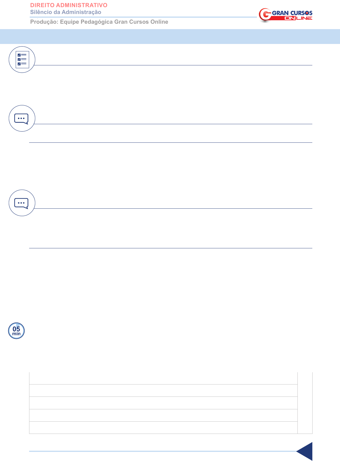 1 Silêncio da Administração DIREITO ADMINISTRATIVO www.grancursosonline.com.br AN O TAÇ Õ ES Produção: Equipe Pedagógica Gran Cursos Online SILÊNCIO DA ADMINISTRAÇÃO Direto do concurso 1. (CESPE/TRT 10ª REGIÃO/ANALISTA JUDICIÁRIO/ÁREA: JUDICIÁRIA/ 2013) Os fatos administrativos não produzem efeitos jurídicos, motivo pelo qual não são enquadrados no conceito de ato administrativo. Comentário O fato administrativo, a alteração material, produz efeito jurídico. 2. (CESPE/TJDFT/ANALISTA JUDICIÁRIO/OFICIAL DE JUSTIÇA/2013) A de- signação de ato administrativo abrange toda atividade desempenhada pela administração. Comentário Toda a atividade desempenhada pela administração se constitui em um ato da administração (ato administrativo, contrato de direito público ou privado e ato de governo). O SILÊNCIO DA ADMINISTRAÇÃO Para Bandeira de Mello (2009, p. 409), “o silêncio é um fato, e não um ato”. O silêncio da Administração é uma omissão. Consequências do silêncio da Administração: a) em relação ao sujeito administrativo que se omitiu: o agente que foi negligente tem de ser responsabilizado por sua conduta funcional; b) em relação ao administrado que peticionou e não obteve resposta, a lei pode prever algum efeito do silêncio: • o silêncio pode configurar a concessão do pedido, ou 2 Silêncio da Administração DIREITO ADMINISTRATIVO www.grancursosonline.com.br AN O TA Ç Õ ES Produção: Equipe Pedagógica Gran Cursos Online • o silêncio pode configurar a negação do pedido: nessa situação, o inte- ressado poderá demandar judicialmente, pleiteando a manifestação da Administração. “Na verdade, o silêncio não é ato jurídico. Por isso, evidentemente, não pode ser ato administrativo. Este é uma declaração jurídica. Quem se absteve de declarar, pois, silenciou, não declarou nada e por isso não praticou ato algum. Tal omissão é ‘fato jurídico’ e, in casu, um ‘fato jurídico administrativo’. […]” Direto do concurso 3. (CESPE/ANATEL/ANALISTA/2014) Os atos administrativos são praticados por servidores e empregados públicos, bem como por determinados parti- culares, a exemplo dos concessionários e permissionários de serviços públi- cos e oficiais de cartórios. Comentário Os atos administrativos são praticados por servidores e empregados públicos, bem como por determinados particulares, a exemplo dos concessionários e permissionários de serviços públicos e oficiais de cartórios. 4. (CESPE/ANATEL/ANALISTA/2014) Os atos administrativos devem ser pra- ticados, necessariamente, por escrito, em atendimento ao princípio do for- malismo. Comentário Há outras formas para a prática dos atos administrativos, as formas verbal, gestual e sonora, para além da escrita. 3 Silêncio da Administração DIREITO ADMINISTRATIVO www.grancursosonline.com.br AN O TAÇ Õ ES Produção: Equipe Pedagógica Gran Cursos Online No que concerne à Administração Pública, julgue o item a seguir. 5. (CESPE/TCE-PA/ANALISTA/2016) Situação hipotética: O TCE/PA alugou várias salas de aula de uma escola privada para a realização do curso de formação de seus novos servidores. Nessa situação, o ato de locação, ainda que seja regido pelo direito privado, é considerado um ato administrativo. Comentário Nessa situação, ocorre o ato da Administração como gênero e ato administrativo; contrato de direito privado, contrato de direito público e ato de governo como espécies. 6. (CESPE/DPE-PE/DEFENSOR PÚBLICO/2015) Em obediência ao princípio da solenidade das formas, o ato administrativo deve ser escrito, registrado e publicado, não se admitindo no direito público o silêncio como forma de ma- nifestação de vontade da administração. Comentário Nem todos os atos administrativos são publicados. Pode ser que o silêncio, que não se constitui em ato administrativo, atribua algum direito ao particular. 7. (CESPE/CÂMARA DOS DEPUTADOS/ANALISTA LEGISLATIVO/2014) Os atos administrativos podem ser exarados por órgãos públicos ou por particu- lares mediante delegação. Comentário Os atos administrativos podem ser exarados (praticados) por órgãos públicos ou por particulares mediante delegação. 4 Silêncio da Administração DIREITO ADMINISTRATIVO www.grancursosonline.com.br AN O TA Ç Õ ES Produção: Equipe Pedagógica Gran Cursos Online 8. (CESPE/MPOG/ANALISTA/2016) O fato administrativo trata de ações que não representam uma vontade, mas puramente a necessidade executória, ao passo que um ato administrativo pode ser considerado uma manifestação de vontade e uma declaração do Estado com produção imediata de efeitos. Comentário O fato administrativo trata de ações que não representam uma vontade, mas puramente a necessidade executória, ao passo que um ato administrativo pode ser considerado uma manifestação de vontade e uma declaração do Estado com produção imediata de efeitos. 9. (CESPE/SUFRAMA/ADMINISTRADOR/2014) Caso a administração seja suscitada a se manifestar acerca da construção de um condomínio em área supostamente irregular, mas se tenha mantida inerte, essa ausência de ma- nifestação da administração será considerada ato administrativo e produzirá efeitos jurídicos, independentemente de lei ou decisão judicial. Comentário O silêncio pode produzir efeito jurídico, mas, mesmo produzindo efeito, o silêncio não é ato administrativo. Para o silêncio produzir efeito jurídico, há a necessidade de uma lei ou de uma decisão judicial. 5 Silêncio da Administração DIREITO ADMINISTRATIVO www.grancursosonline.com.br AN O TAÇ Õ ES Produção: Equipe Pedagógica Gran Cursos Online GABARITO 1. E 2. E 3. C 4. E 5. E 6. E 7. C 8. C 9. E �������Este material foi elaborado pela equipe pedagógica do Gran Cursos Online, de acordo com a aula preparada e ministrada pelo professor Rodrigo Cardoso.