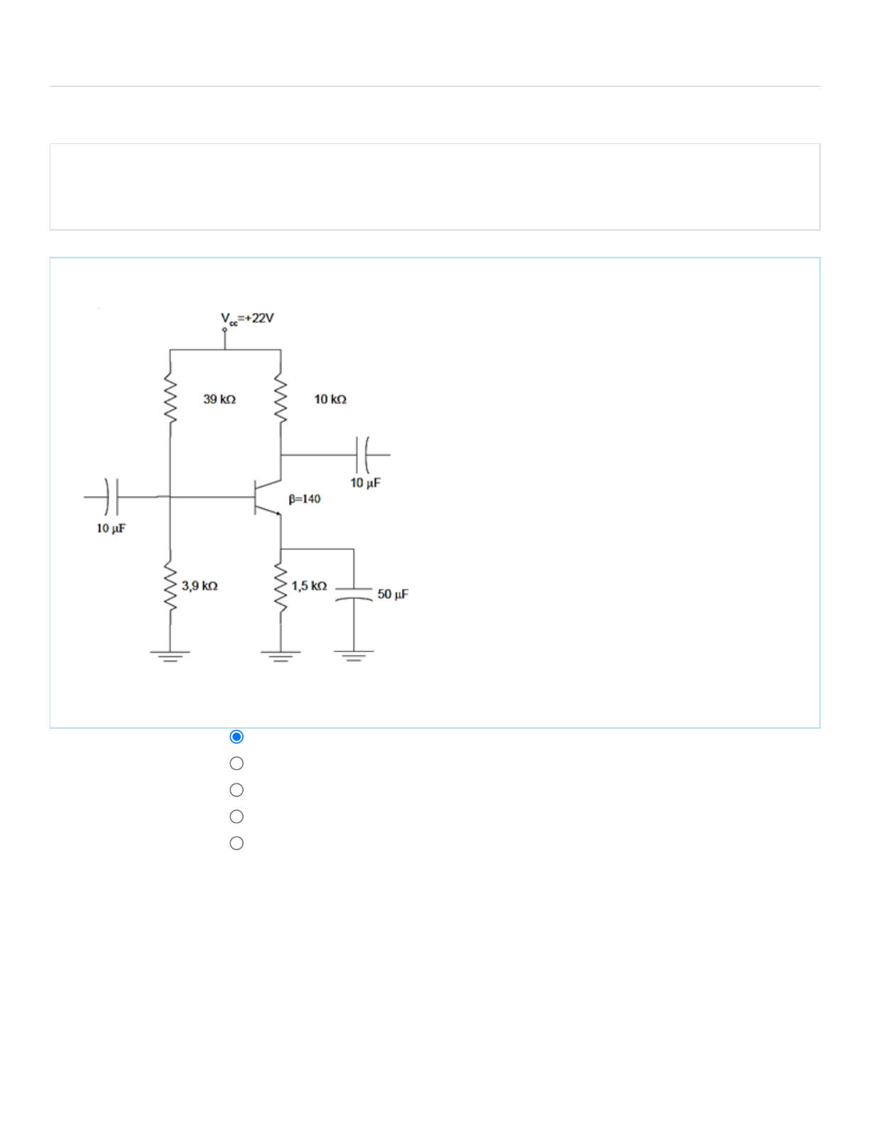09/03/2021 Questionário unidade 1 https://www.avaeduc.com.br/mod/quiz/attempt.php?attempt=938106&page=1 1/1 a. Ic=0,87mA Vce=12V b. Ic=87mA Vce=8V c. Ic=8,7mA Vce=9V d. Ic=7,8mA Vce=12V e. Ic=5mA Vce=12V Dica: Para navegar entre as questões utilize a tecla tab e para navegar entre as opções da questão utilize as setas. Questão 2 Resposta salva Vale 1,43 ponto(s). Determine Ic e Vce para o circuito com a configuração abaixo, aplicando o cálculo do circuito equivalente de Thévenin no cálculo da tensão e corrente na base (ignorar os capacitores no cálculo). Escolha uma: Questionário unidade 1