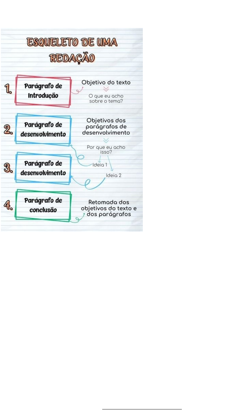 Estrutura de Redação. Na imagem abaixo você encontra o esqueleto de uma redação. Em seguida, você aprenderá como planejar e escrever cada um dos elementos do texto. A Introdução da Redação Não é sem razão que o primeiro parágrafo da estrutura de uma redação é chamado de introdução, pois é nessa parte do texto que você vai expor (apresentar) as principais questões a serem abordadas no restante do texto. No primeiro parágrafo, o leitor terá uma dimensão geral do assunto e vai entender as razões pelas quais a discussão do problema é relevante. E nessa hora que você deve envolver o leitor e ser criativo o bastante para instigá-lo a continuar a leitura. Assim, uma boa forma de fazer isso é relacionar o tema a aspectos pessoais e/ou sociais. Mostre como essa questão pode afetar a vida do leitor ou como ele está relacionado a ela. · Para que você consiga fazer isso, você pode dividir a sua introdução em 3 partes: · a) contextualização, · b) tema, e, · c) tese. 1- Contextualização A contextualização ou assunto é algo mais abrangente do que o tema, mas que está conectado a ele. Por exemplo: o tema da redação de 2018 foi “a manipulação do usuário pelo controle de dados na internet”. Nesse caso, o contexto poderia ser sobre meios de comunicação, redes sociais, internet em geral, privacidade, entre outras possibilidades. Além disso, o contexto é um bom lugar para você citar algum repertório sociocultural, como um livro, um filme, uma música, um dado histórico ou estatístico. 2- Tema Depois de fazer a contextualização, você deve demonstrar como o contexto está ligado ao tema. Tente não copiar o tema de forma literal. Em vez disso, tente escrever com suas palavras. Mas não esqueça de que todos os elementos do tema precisam estar presentes. Utilizando o exemplo anterior, você deve lembrar de mencionar a “manipulação”, o “controle de dados” e a “internet”. 3- Tese Em seguida, você não pode esquecer de escrever a sua tese. A tese ou objetivo do texto é aquilo que você pretende defender ao longo da redação. Essa é uma das partes mais importantes de toda a sua redação. A fim de definir qual será a sua tese, você pode se perguntar: “o que eu acho sobre o tema?”. Partindo da sua resposta, você vai conseguir formular o objetivo do seu seu texto, ou seja, sua tese. Perguntas na Introdução Outras perguntas que podem auxiliar na criação da sua tese e, mais à frente, podem fornecer ideias para os parágrafos de desenvolvimento e para a conclusão: 1. Qual o problema? 2. Por que se trata de um problema? 3. Quais as causas para tal problema? 4. Há alguma solução? 5. Como e por que colocar tal solução em prática? 6. Como essa proposta pode, de fato, resolver o problema? Dica: Uma boa maneira de treinar a introdução dentro do modelo da estrutura da redação do Enem nos seus textos de treinamento é ler. Ler sempre, pelo menos uma vez por semana passar os olhos em artigos de jornais e revistas. Exemplo de Introdução “Segundo as ideias do sociólogo Habermas, os meios de comunicação são fundamentais para a razão comunicativa. Visto isso, é possível mencionar que a internet é essencial para o desenvolvimento da sociedade. Entretanto, o meio virtual tem sido utilizado, muitas vezes, para a manipulação do comportamento do usuário, pelo controle de dados, podendo induzir o indivíduo a compartilhar determinados assuntos ou a consumir certos produtos. Isso ocorre devido `falha de políticas públicas efetivas que auxiliem o indivíduo a “navegar”, de forma correta, na internet, e à ausência de consciência, da grande parte da população, sobre a importância de saber utilizar adequadamente o meio virtual. Essa realidade constituiu um desafio a ser resolvido não somente pelos poderes públicos, mas também por toda a sociedade”. O que você não deve fazer na Introdução O principal cuidado que você deve ter ao escrever a introdução do seu texto é não misturar os assuntos. A pluralidade de ideias deixa o texto poluído e o leitor confuso. E ainda: não mencione nenhum fato na introdução que não será explorado ao longo do texto. Foque na sua tese principal. É recomendável evitar períodos longos no primeiro parágrafo. O espaço para produzir orações mais longas é o desenvolvimento. E mesmo assim, esse recurso deve ser usado com bastante critério. Como fazer o desenvolvimento Essa parte da estrutura de uma redação pode ser resumida em duas palavras: argumentação e exemplificação. É aqui que as informações mais polêmicas devem aparecer. Nesse espaço, você também pode dar voz a visões opostas sobre o assunto. Tudo o que foi levantado na introdução deve ser discutido aqui e lembre-se de desenvolver uma ideia diferente para cada parágrafo. Mas, como conseguir fazer isso na prática? O primeiro passo é relembrar a tese ou objetivo que você criou na introdução. Por exemplo: numa redação sobre agrotóxicos, você pode estabelecer como objetivo mostrar que os agrotóxicos são um retrocesso para a saúde e para a agricultura. Então, você deve desmembrar esse objetivo em dois: um para o primeiro parágrafo de desenvolvimento e outro para o segundo. No caso do exemplo anterior, você poderia escrever um parágrafo sobre o impacto dos agrotóxicos na saúde e outro na agricultura. Se você tiver dificuldades para estabelecer os objetivos dos parágrafos, pode olhar para sua tese e se perguntar “por que eu acho isso?”. A partir da resposta, você deve formular duas ideias diferentes e explicar melhor cada uma delas em um parágrafo do desenvolvimento da redação. Depois de estabelecidos os objetivos dos parágrafos, você vai precisar de 4 elementos para construir cada um dos seus parágrafos de desenvolvimento: afirmação, explicação, exemplificação e conclusão. Afirmação ou tópico frasal O primeiro elemento do parágrafo deve ser uma afirma