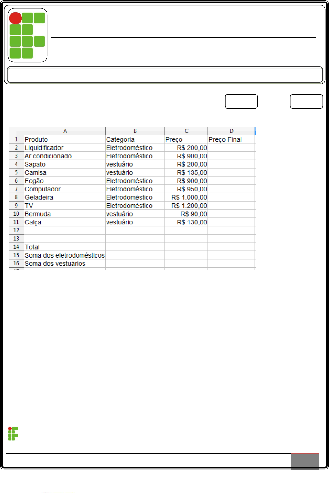 ( Aluno (a) : ___ _ _______________________________________________ Matrícula:______ ____ INSTITUTO FEDERAL DE EDUCAÇÃO, CIÊNCIA E TECNOLOGIA RIO GRANDE DO NORTE Campus João Câmara CURSO: T écnico Integrado em Informática DATA: 22/09/2014 P rofessor : Igor Alves AVALIAÇÃO DE INFORMÁTICA ) ( Valor => 3 ,0 Nota => ) 01 ) Copie a tabela abaixo e realize o calculo e a formatação a seguir: a) Calcule o desconto na coluna D dando 25 % de desconto para os produtos da categoria eletrodoméstico e 30% para a categoria vestuário. b) Calcule o total gasto apenas com os eletrodomésticos e depois apenas com vestuário c) Coloque um filtro para as diferentes categorias de produto d) Insira uma formatação condicional para onde os produtos da linha vestuário realçados em vermelho e os demais fiquem em verde. AVALIAÇÃO DE INFORMÀTICA Prof. IGOR ALVES 1