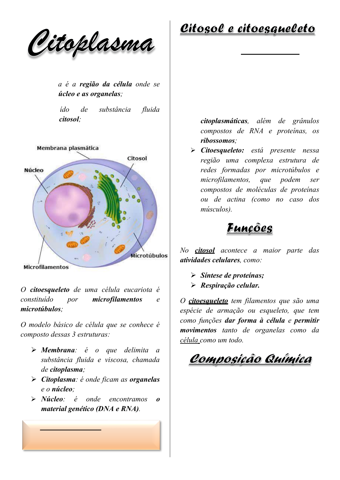 O citoplasma é a região da célula onde se encontra o núcleo e as organelas; É constituído de substância fluida denominada citosol; O citoesqueleto de uma célula eucariota é constituído por microfilamentos e microtúbulos; O modelo básico de célula que se conhece é composto dessas 3 estruturas: ➢ Membrana: é o que delimita a substância fluida e viscosa, chamada de citoplasma; ➢ Citoplasma: é onde ficam as organelas e o núcleo; ➢ Núcleo: é onde encontramos o material genético (DNA e RNA). O citoplasma de células eucariotas pode conter diversas estruturas com funções especificas. Há duas regiões no citoplasma: ➢ Citosol: é onde ficam muitas estruturas membranosas chamadas de orgalenas citoplasmáticas, além de grânulos compostos de RNA e proteínas, os ribossomos; ➢ Citoesqueleto: está presente nessa região uma complexa estrutura de redes formadas por microtúbulos e microfilamentos, que podem ser compostos de moléculas de proteínas ou de actina (como no caso dos músculos). No citosol acontece a maior parte das atividades celulares, como: ➢ Síntese de proteínas; ➢ Respiração celular. O citoesqueleto tem filamentos que são uma espécie de armação ou esqueleto, que tem como funções dar forma à célula e permitir movimentos tanto de organelas como da célula como um todo. O citoplasma é composto em grande parte por água, mas também por moléculas orgânicas e macromoléculas como proteínas e enzimas (as enzimas têm papel essencial catalisando diversas reações que acontecem no citosol). Também estão presentes lipídios e polissacarídeos. Nas células procariontes, típicas de bactérias e arqueas, não há núcleo e o material genético fica espalhado pelo citoplasma.