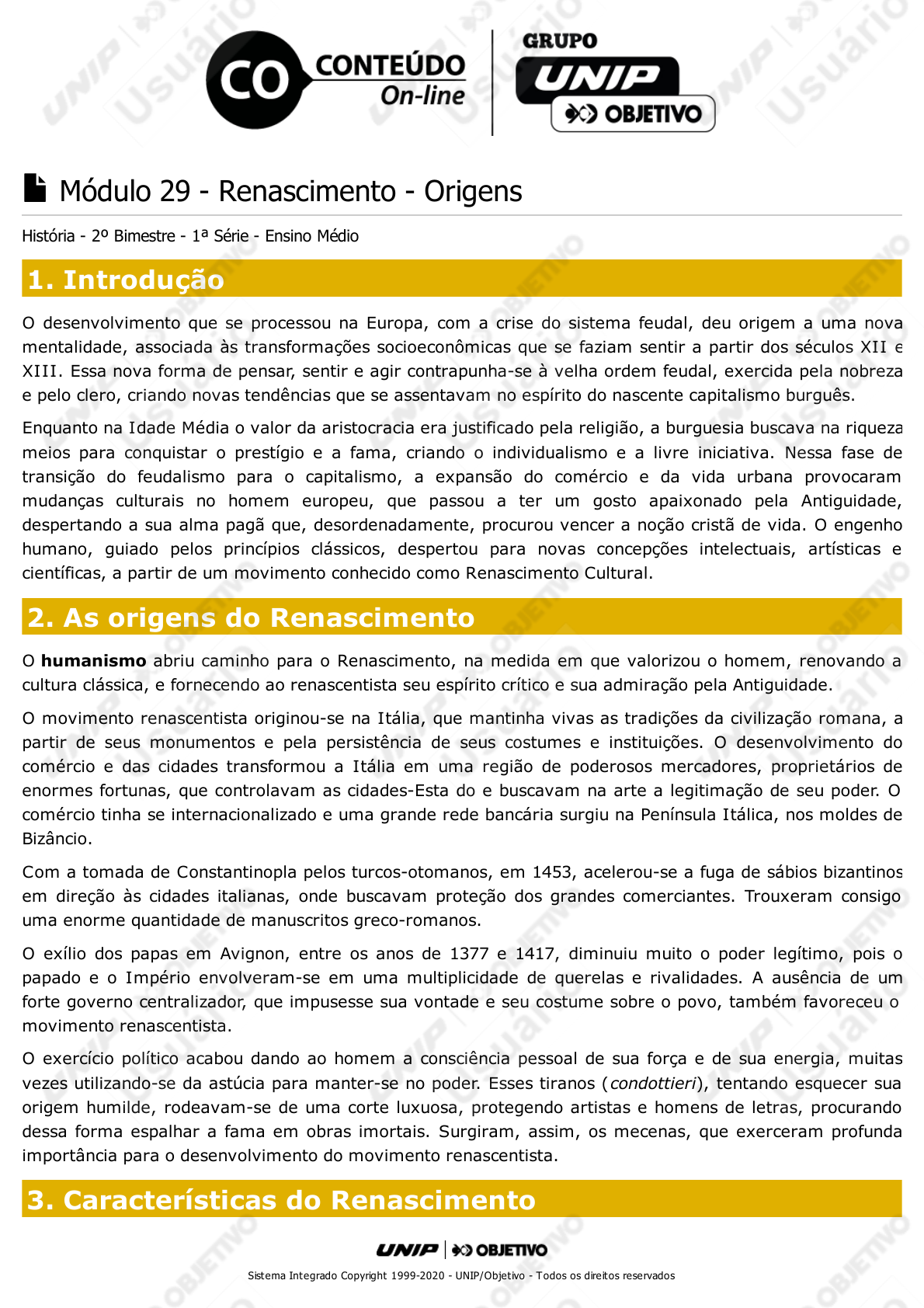Módulo 29 - Renascimento - Origens História - 2º Bimestre - 1ª Série - Ensino Médio 1. Introdução O desenvolvimento que se processou na Europa, com a crise do sistema feudal, deu origem a uma nova mentalidade, associada às transformações socioeconômicas que se faziam sentir a partir dos séculos XII e XIII. Essa nova forma de pensar, sentir e agir contrapunha-se à velha ordem feudal, exercida pela nobreza e pelo clero, criando novas tendências que se assentavam no espírito do nascente capitalismo burguês. Enquanto na Idade Média o valor da aristocracia era justificado pela religião, a burguesia buscava na riqueza meios para conquistar o prestígio e a fama, criando o individualismo e a livre iniciativa. Nessa fase de transição do feudalismo para o capitalismo, a expansão do comércio e da vida urbana provocaram mudanças culturais no homem europeu, que passou a ter um gosto apaixonado pela Antiguidade, despertando a sua alma pagã que, desordenadamente, procurou vencer a noção cristã de vida. O engenho humano, guiado pelos princípios clássicos, despertou para novas concepções intelectuais, artísticas e científicas, a partir de um movimento conhecido como Renascimento Cultural. 2. As origens do Renascimento O humanismo abriu caminho para o Renascimento, na medida em que valorizou o homem, renovando a cultura clássica, e fornecendo ao renascentista seu espírito crítico e sua admiração pela Antiguidade. O movimento renascentista originou-se na Itália, que mantinha vivas as tradições da civilização romana, a partir de seus monumentos e pela persistência de seus costumes e instituições. O desenvolvimento do comércio e das cidades transformou a Itália em uma região de poderosos mercadores, proprietários de enormes fortunas, que controlavam as cidades-Esta do e buscavam na arte a legitimação de seu poder. O comércio tinha se internacionalizado e uma grande rede bancária surgiu na Península Itálica, nos moldes de Bizâncio. Com a tomada de Constantinopla pelos turcos-otomanos, em 1453, acelerou-se a fuga de sábios bizantinos em direção às cidades italianas, onde buscavam proteção dos grandes comerciantes. Trouxeram consigo uma enorme quantidade de manuscritos greco-romanos. O exílio dos papas em Avignon, entre os anos de 1377 e 1417, diminuiu muito o poder legítimo, pois o papado e o Império envolveram-se em uma multiplicidade de querelas e rivalidades. A ausência de um forte governo centralizador, que impusesse sua vontade e seu costume sobre o povo, também favoreceu o movimento renascentista. O exercício político acabou dando ao homem a consciência pessoal de sua força e de sua energia, muitas vezes utilizando-se da astúcia para manter-se no poder. Esses tiranos (condottieri), tentando esquecer sua origem humilde, rodeavam-se de uma corte luxuosa, protegendo artistas e homens de letras, procurando dessa forma espalhar a fama em obras imortais. Surgiram, assim, os mecenas, que exerceram profunda importância para o desenvolvimento do movimento renascentista. 3. Características do Renascimento Sistema Integrado Copyright 1999-2020 - UNIP/Objet ivo - Todos os direitos reservados O Renascimento cultural surgiu em oposição à cultura teocêntrica medieval, caracterizando-se pelo antropocentrismo, que colocava o homem como centro de todas as coisas. O individualismo burguês, em oposição ao coletivismo da Idade Média, foi outro importante valor renascentista. O estudo da cultura greco-romana permitiu o surgimento de um espírito racionalista, por meio do qual se demonstrava que todo o conhecimento poderia ser explicado pela razão e pela ciência, negando-se a aceitar o misticismo ou fatos que não pudessem ser comprovados. Incentivou-se, assim, o método experimental, que passou a ser utilizado em todas as áreas: política, economia, sociedade etc. Desenvolveu-se, também, o naturalismo, a partir do qual o homem passou a observar as forças naturais, negando qualquer idealização da realidade que não estivesse associada à natureza ou às suas leis, e o hedonismo, que buscava os prazeres mundanos. 4. O Humanismo O Humanismo é um dos aspectos mais importantes do Renascimento, traduzindo-se pelo estudo e imitação das formas greco-romanas, refletindo-se na “consciência do Renascimento". Os humanistas opuseram-se à concepção teocêntrica, dando um novo impulso aos rumos do pensamento europeu, orientando a cultura em duas direções: o humanismo cristão, que aproveitava os grandes autores clássicos; e o pagão, que, apesar de não ser destituído de ligação com o cristianismo, colocava que o homem era a medida de todas as coisas, só devendo se preocupar com problemas que pudessem ser resolvidos pelo próprio homem. Os humanistas estudavam os documentos deixados pelos antigos, cultivando as línguas clássicas, sem esquecer o hebreu e o árabe, até atingir a erudição. Sua preocupação era recolher das antigas bibliotecas dos conventos o maior número possível de manuscritos literários, científicos e filosóficos, para traduzi-los e comentá-los. O maior centro humanista da Europa foi a Itália, encontrando-se os primeiros estudos em Dante Alighieri, que escreveu A Divina Comédia, satirizando os costumes da época e a Igreja Católica; Francesco Petrarca; e Giovanni Boccaccio. Fora da Itália, o maior representante foi o holandês Erasmo de Rotterdam, que, em sua célebre obra Elogio da Loucura, defendeu uma maior pureza dos costumes, criticou o luxo da Europa e as superstições que se introduziram no cristianismo, atacando a ignorância do clero. Mapa do inferno de Botticelli Sistema Integrado Copyright 1999-2020 - UNIP/Objet ivo - Todos os direitos reservados 5. As fases do Renascimento A morte de Boccaccio colocou fim ao primeiro período renascentista, denominado pelos italianos como Trecento, para designar o século XIV. Durante essa fase, a renovação cultural restringiu-se à literatura, limitando-