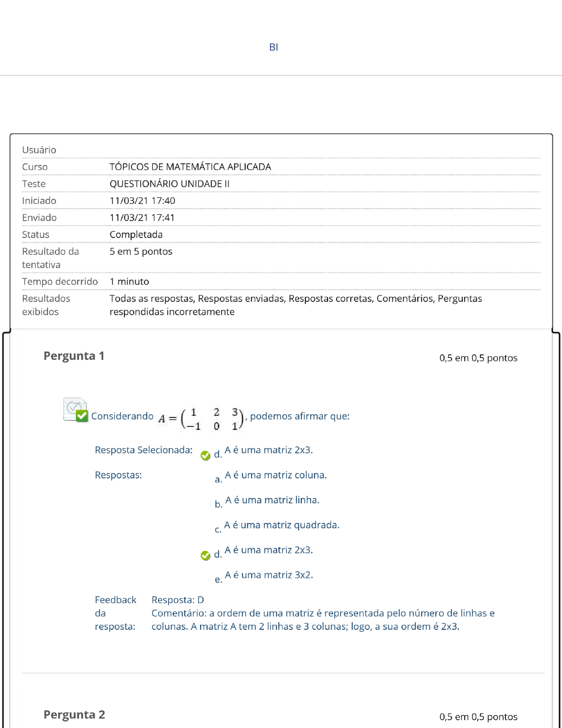 11/03/2021 Revisar envio do teste: QUESTIONÁRIO UNIDADE II – 7700-... https://ava.ead.unip.br/webapps/assessment/review/review.jsp?attempt_id=_57030465_1&course_id=_156426_1&content_id=_2027340_1&return_co… 1/7 TÓPICOS DE MATEMÁTICA APLICADA 7700-30_43701_R_E1_20211 CONTEÚDO Revisar envio do teste: QUESTIONÁRIO UNIDADE II UNIP EA D BIBLIOTECA S MURAL DO ALUN O TUTORIAI S CONTEÚDOS ACADÊMICO S https://ava.ead.unip.br/webapps/blackboard/execute/courseMain?course_id=_156426_1 https://ava.ead.unip.br/webapps/blackboard/execute/courseMain?course_id=_156426_1 https://ava.ead.unip.br/webapps/blackboard/execute/courseMain?course_id=_156426_1 https://ava.ead.unip.br/webapps/blackboard/content/listContent.jsp?course_id=_156426_1&content_id=_2025703_1&mode=reset https://ava.ead.unip.br/webapps/portal/execute/tabs/tabAction?tab_tab_group_id=_10_1 https://ava.ead.unip.br/webapps/portal/execute/tabs/tabAction?tab_tab_group_id=_10_1 https://ava.ead.unip.br/webapps/portal/execute/tabs/tabAction?tab_tab_group_id=_27_1 https://ava.ead.unip.br/webapps/portal/execute/tabs/tabAction?tab_tab_group_id=_27_1 https://ava.ead.unip.br/webapps/portal/execute/tabs/tabAction?tab_tab_group_id=_47_1 https://ava.ead.unip.br/webapps/portal/execute/tabs/tabAction?tab_tab_group_id=_47_1 https://ava.ead.unip.br/webapps/portal/execute/tabs/tabAction?tab_tab_group_id=_29_1 https://ava.ead.unip.br/webapps/portal/execute/tabs/tabAction?tab_tab_group_id=_29_1 https://ava.ead.unip.br/webapps/portal/execute/tabs/tabAction?tab_tab_group_id=_25_1 https://ava.ead.unip.br/webapps/portal/execute/tabs/tabAction?tab_tab_group_id=_25_1 11/03/2021 Revisar envio do teste: QUESTIONÁRIO UNIDADE II – 7700-... https://ava.ead.unip.br/webapps/assessment/review/review.jsp?attempt_id=_57030465_1&course_id=_156426_1&content_id=_2027340_1&return_co… 2/7 Considerando , podemos a rmar que: Resposta Selecionada: e. B é uma matriz 3x2. Respostas: a. B é uma matriz coluna. b. B é uma matriz linha. c. B é uma matriz quadrada. d. B é uma matriz 2x3. e. B é uma matriz 3x2. Feedback Resposta: E da Comentário: a ordem de uma matriz é representada pelo número de linhas e resposta: colunas. A matriz B tem 3 linhas e 2 colunas; logo, a sua ordem é 3x2. Pergunta 3 0,5 em 0,5 pontos Na igualdade , os valores de x, y e z são, respectivamente, iguais a: Resposta Selecionada: b. 1, 0 e 0. Respostas: a. 1, 0 e 1. b. 1, 0 e 0. c. 1, 0 e -1. d. 1, 1 e -1. e. 1, 1 e 1. Feedback Resposta: B da Comentário: duas matrizes de mesma ordem são iguais se os seus elementos resposta: de mesmo índice são iguais. Assim, x = 1, y = 0 e z-1 = -1, ou seja, z = 0. 11/03/2021 Revisar envio do teste: QUESTIONÁRIO UNIDADE II – 7700-... https://ava.ead.unip.br/webapps/assessment/review/review.jsp?attempt_id=_57030465_1&course_id=_156426_1&content_id=_2027340_1&return_co… 3/7 Pergunta 4 0,5 em 0,5 pontos Considerando as matrizes A 2x3 e B 3x2, podemos a rmar que: Resposta Selecionada: c. AB resulta numa matriz quadrada. Respostas: a. AB resulta numa matriz coluna. b. AB resulta numa matriz linha. c. AB resulta numa matriz quadrada. d. AB é uma matriz 2x3. e. AB é uma matriz 3x2. Feedback Resposta: C da Comentário: na multiplicação de duas matrizes A e B é necessário que a resposta: quantidade de colunas da matriz A seja igual à quantidade de linhas da matriz B. A tem 3 colunas e B tem 3 linhas. A matriz resultante tem a mesma quantidade de linhas da matriz A e a mesma quantidade de colunas da matriz B. A tem 2 linhas e B tem 2 colunas; logo, a matriz resultante de AB é uma matriz quadrada de ordem 2x2. Pergunta 5 0,5 em 0,5 pontos Considerando uma matriz B de ordem 30x20, a ordem de uma matriz A, para que o produto AB seja uma matriz quadrada, é, necessariamente, igual a: Resposta Selecionada: d. 20x30. Respostas: a. 20x20. b. 30x30. c. 20x1. d. 20x30. e. 30x20. 11/03/2021 Revisar envio do teste: QUESTIONÁRIO UNIDADE II – 7700-... https://ava.ead.unip.br/webapps/assessment/review/review.jsp?attempt_id=_57030465_1&course_id=_156426_1&content_id=_2027340_1&return_co… 4/7 Feedback da resposta: Resposta: D Comentário: somente podemos fazer a multiplicação de duas matrizes A e B, caso a quantidade de colunas da matriz A seja igual à quantidade de linhas da matriz B. Se essa condição for atendida, o resultado obtido é uma matriz C que tem a mesma quantidade de linhas da matriz A e a mesma quantidade de colunas da matriz B. Como , a ordem de A deve ser 20x30. Pergunta 6 0,5 em 0,5 pontos A soma das matrizes é a matriz: Resposta Selecionada: Respostas: d. e. Feedback Resposta: B da Comentário: somente podemos somar matrizes de mesma ordem, ou seja, resposta: devem possuir o mesmo número de linhas e colunas, podermos somar termo a termo da matriz, isto é, o elemento corresponde a: Pergunta 7 A transposta da matriz Resposta Selecionada: b. c. b. a. c. a. é a matriz: 11/03/2021 Revisar envio do teste: QUESTIONÁRIO UNIDADE II – 7700-... https://ava.ead.unip.br/webapps/assessment/review/review.jsp?attempt_id=_57030465_1&course_id=_1564 26_1&content_id=_2027340_1&return_co… 5/7 Respostas: b. 0,5 em 0,5 pontos d. e. Feedback Resposta: C da Comentário: considere uma matriz J de ordem mxn. A matriz transposta de J, resposta: indicada por J t , é uma matriz de ordem nxm, cujas linhas são formadas pelas colunas de J e cuja colunas são formadas pelas linhas de J, ou seja, a matriz J t resulta da troca ordenada das linhas pelas colunas de J. Pergunta 8 A oposta da matriz Resposta Selecionada: Respostas: c. c. a. a. b. é a matriz: 11/03/2021 Revisar envio do teste: QUESTIONÁRIO UNIDADE II – 7700-... https://ava.ead.unip.br/webapps/assessment/review/review.jsp?attempt_id=_57030465_1&course_id=_156426_1& content_id=_2027340_1&return_co… 6/7 d. e. Feedback Resposta: A 0,5 em 0,5 pontos da Comentário: a matriz oposta de J, indicada por -J, é uma matriz de ordem mxn, resposta: cujos elementos são os opostos dos elementos de J, ou seja, os
