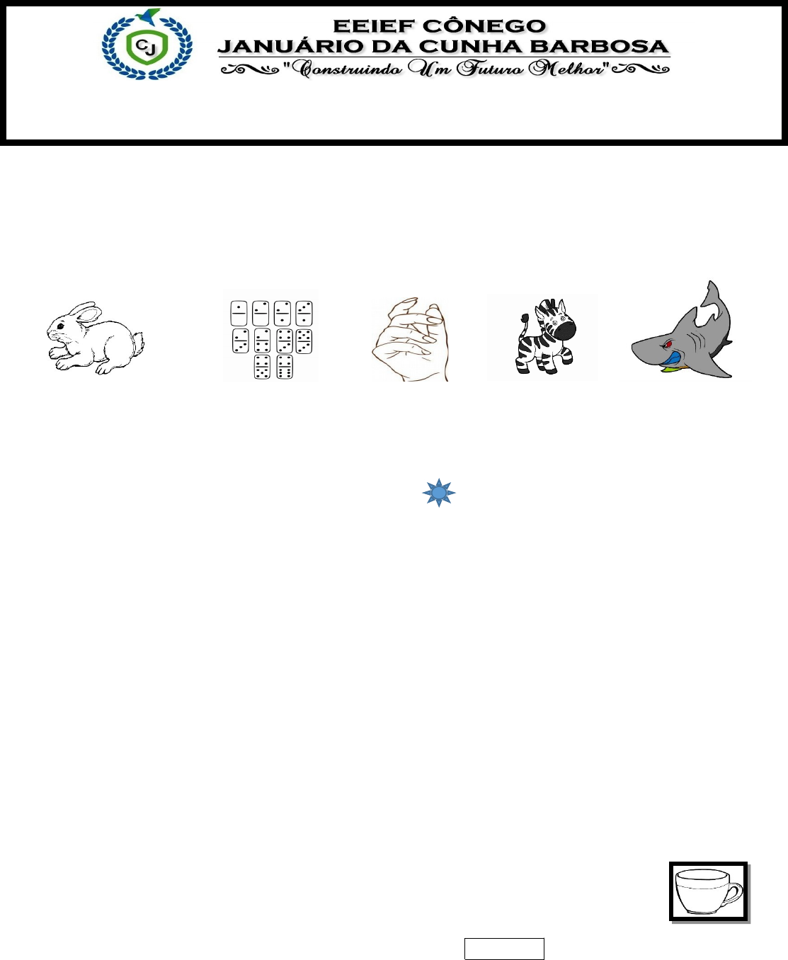 Nome: ______________________________________________________ Professora: ___________________ 2º ano Data: ____/ ____/______ AVALIAÇÃO DE PORTUGUÊS 1 – Escreva a letra inicial de cada desenho. ( ) ( ) ( ) ( ) ( ) 2 – Faça um X onde mostra somente letras. ( ) Vida 1234 ( ) SOS 193 ( ) Sol ( ) t, u, v, w 3. Faça um X na frase que está separada de forma correta. ( ) O sapo subiuno sofá ( ) o saposubiuno sofá ( ) Osaposubiu no sofá ( ) O sapo subiu no sofá 4. Marque um X na palavra que possui três sílabas. ( ) quiabo ( ) tatu ( ) rio ( ) ratazana 5. Faça um X na palavra que inicie com a mesma sílaba ( ou pedacinho) da figura que você vê. ( ) queijo ( ) xerife ( ) karatê ( ) zabumba 6. Qual a sílaba medial (sílaba do meio) da palavra PIRATA ( ) pi ( ) pir ( ) ta ( ) ra 7. Escreva o nomes das figuras de acordo com a numeração. ( 7 ) ( 8 ) ( 6 ) ( 3 ) ( 2 ) ( 5 ) ( 1 ) ( 4 ) 1 ______________________ 2 ______________________ 3 ______________________ 4 ______________________ 5 ______________________ 6 ______________________ 7 ______________________ 8 ______________________ 8. Leia a poesia: Maria é xereta. Subiu na cadeira. Pegou o xarope. Tomou um gole. Jogou tudo fora. Com uma careta. · Marque um X na última palavra do texto. ( ) xereta ( ) careta ( ) xarope ( ) cadeira 9. Escreva as famílias das consoantes abaixo: z ____ ____ ____ ____ ____ x ____ ____ ____ ____ ____ s ____ ____ ____ ____ ____ v ____ ____ ____ ____ ____ t ____ ____ ____ ____ ____ 10. Escreva seu nome completo. ____________________________________________________________________