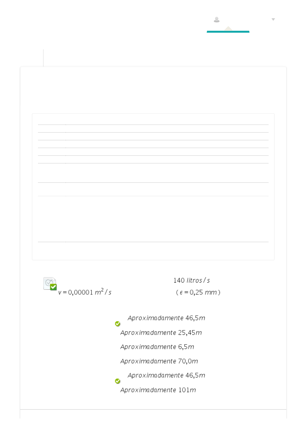 30/03/2018 Revisar envio do teste: Avaliação On-Line 5 (AOL 5) - ... https://sereduc.blackboard.com/webapps/assessment/review/review.jsp?attempt_id=_2060835_1&course_id=_8828_1&content_id=_579195_1&return_content= Unidade 4 Revisar envio do teste: Avaliação On-Line 5 (AOL 5) - QuestionárioH Revisar envio do teste: Avaliação On-Line 5 (AOL 5) -Revisar envio do teste: Avaliação On-Line 5 (AOL 5) - QuestionárioQuestionário Usuário Italo Alencar Leite Curso 4594 . 7 - Mecânica dos Fluídos - 20181.A Teste Avaliação On-Line 5 (AOL 5) - Questionário Iniciado 11/03/18 20:28 Enviado 30/03/18 18:35 Status Completada Resultado da tentativa 10 em 10 pontos Tempo decorrido 454 horas, 7 minutos Instruções Resultados exibidos Todas as respostas, Respostas enviadas, Respostas corretas, Perguntas respondidas incorretamente Atenção! Você terá 1 opção de envio. Você pode salvar e retornar quantas vezes desejar, pois a tentativa só será contabilizada quando você decidir acionar o botão ENVIAR. Após o envio da atividade, você poderá conferir sua nota e o feedback, acessando o menu lateral esquerdo (Notas). IMPORTANTE: verifique suas respostas antes do envio desta atividade. Pergunta 1 Resposta Selecionada: d. Respostas: a. b. c. d. e. Determine a perda de carga para o escoamento de de óleo, , num tubo de ferro fundido de 400 m de comprimento e 200 mm de diâmetro. Disciplinas Cursos 1 em 1 pontos Italo Alencar Leite 85 30/03/2018 Revisar envio do teste: Avaliação On-Line 5 (AOL 5) - ... https://sereduc.blackboard.com/webapps/assessment/review/review.jsp?attempt_id=_2060835_1&course_id=_8828_1&content_id=_579195_1&return_content= Pergunta 2 Resposta Selecionada: e. Respostas: a. b. c. d. e. Um fluido escoa por um trecho de 20 metros de tubulação, de diâmetro igual a 20 mm. Sabe-se que o número de Reynolds nesse escoamento é igual a 1.280, o fluido escoa a , e a aceleração da gravidade local é igual a . Então, a perda de carga, nesse trecho de tubulação, é de: Pergunta 3 Resposta Selecionada: b. Respostas: a. b. c. d. e. Um oleoduto de aço com 20 cm de diâmetro conduz o fluido numa vazão de de óleo combustível pesado a 35°C. Sabendo que a viscosidade cinemática do óleo a essa temperatura é de , pode-se afirmar que a velocidade e o regime de escoamento são, respectivamente: Pergunta 4 Em 1877, o matemático francês Joseph Boussinesq formulou uma expressão baseado no modelo simples de tensões em escoamento turbulento muito parecido com a 1ª Lei de viscosidade de Newton, sua fórmula pode ser apresentada como sendo: 1 em 1 pontos 1 em 1 pontos 1 em 1 pontos 30/03/2018 Revisar envio do teste: Avaliação On-Line 5 (AOL 5) - ... https://sereduc.blackboard.com/webapps/assessment/review/review.jsp?attempt_id=_2060835_1&course_id=_8828_1&content_id=_579195_1&return_content= Resposta Selecionada: a. Respostas: a. b. c. d. e. Pesquise um pouco mais sobre a equação proposta por Boussinesq e considerando ainda a classificação dos escoamentos turbulentos, assinale a opção correta. Mesmo com a hipótese de Boussinesq, o sistema de equações formado pelas equações da continuidade e quantidade de movimento, médias, continua aberto, isto é, tem mais incógnitas do que equações, pois é uma função do escoamento Mesmo com a hipótese de Boussinesq, o sistema de equações formado pelas equações da continuidade e quantidade de movimento, médias, continua aberto, isto é, tem mais incógnitas do que equações, pois é uma função do escoamento A viscosidade turbulenta é uma propriedade do fluido e não depende das condições do escoamento Turbulência estacionária é aquela em que as propriedades dinâmicas do escoamento, como a velocidade e a pressão, independem da posição Em um escoamento turbulento homogêneo e isotrópico, a viscosidade turbulenta é sempre constante Em um escoamento turbulento incompressível, o traço do tensor de tensões de Reynolds é sempre nulo Pergunta 5 Resposta Selecionada: e. Respostas: a. b. c. d. e. Em um trecho de 100 milímetros de diâmetro interno e 100 metros de comprimento de um duto circular escoa água com velocidade de 2 m/s. O regime é turbulento e o coeficiente de atrito foi calculado em 0,02. Considerando a aceleração da gravidade igual a , calcule a perda de carga sofrida pelo fluido nesta tubulação. Pergunta 6 Pelo experimento de Reynolds, definiu-se que, em tubulações, relativo à transição de regime laminar para turbulento seu número vale 2.300. Se um fluido, de viscosidade cinemática de , desloca-se por uma tubulação de 35 mm de diâmetro qual deveria (dentre as 1 em 1 pontos 1 em 1 pontos 30/03/2018 Revisar envio do teste: Avaliação On-Line 5 (AOL 5) - ... https://sereduc.blackboard.com/webapps/assessment/review/review.jsp?attempt_id=_2060835_1&course_id=_8828_1&content_id=_579195_1&return_content= Resposta Selecionada: e. Respostas: a. b. c. d. e. alternativas apresentadas) ser a mínima velocidade que tal fluido deveria escoar para que ele adquirisse o regime turbulento? Pergunta 7 Resposta Selecionada: a. Respostas: a. b. c. d. e. A respeito dos conhecimentos abordados sobre a classificação dos escoamentos e as características que distinguem o escoamento turbulento, assinale dentre as alternativas abaixo aquela que pode ser considerada CORRETA. Não existem flutuações de velocidade em escoamentos laminares, enquanto, nos turbulentos, o campo de velocidade pode ser decomposto em um campo médio e um campo flutuante Não existem flutuações de velocidade em escoamentos laminares, enquanto, nos turbulentos, o campo de velocidade pode ser decomposto em um campo médio e um campo flutuante A conservação da massa é obedecida em escoamentos laminares, enquanto, nos turbulentos, a conservação da massa não acontece Escoamentos laminares podem ser compressíveis, enquanto os turbulentos não admitem compressibilidade A condição de não deslizamento não existe no regime l