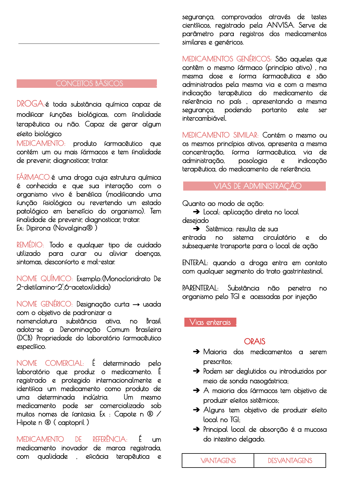 Farmacologia @odontohelpus CONCEITOS BÁSICOS……………………….. DROGA:é toda substância química capaz de modificar funções biológicas, com finalidade terapêutica ou não. Capaz de gerar algum efeito biológico MEDICAMENTO: produto farmacêutico que contém um ou mais fármacos e tem finalidade de prevenir, diagnosticar, tratar. FÁRMACO:é uma droga cuja estrutura química é conhecida e que sua interação com o organismo vivo é benéfica (modificando uma função fisiológica ou revertendo um estado patológico em benefício do organismo). Tem finalidade de prevenir, diagnosticar, tratar. Ex: Dipirona (Novalgina® ) REMÉDIO: Todo e qualquer tipo de cuidado utilizado para curar ou aliviar doenças, sintomas, desconforto e mal-estar. NOME QUÍMICO: Exemplo:(Monocloridrato De 2-dietilamino-2',6-acetoxilidida) NOME GENÉRICO: Designação curta → usada com o objetivo de padronizar a nomenclatura substância ativa, no Brasil adota-se a Denominação Comum Brasileira (DCB) Propriedade do laboratório farmacêutico específico. NOME COMERCIAL: É determinado pelo laboratório que produz o medicamento. É registrado e protegido internacionalmente e identifica um medicamento como produto de uma determinada indústria. Um mesmo medicamento pode ser comercializado sob muitos nomes de fantasia. Ex : Capote n ® / Hipote n ® ( captopril ) MEDICAMENTO DE REFERÊNCIA: É um medicamento inovador de marca registrada, com qualidade , eficácia terapêutica e segurança, comprovados através de testes científicos, registrado pela ANVISA. Serve de parâmetro para registros dos medicamentos similares e genéricos. MEDICAMENTOS GENÉRICOS: São aqueles que contêm o mesmo fármaco (princípio ativo) , na mesma dose e forma farmacêutica e são administrados pela mesma via e com a mesma indicação terapêutica do medicamento de referência no país , apresentando a mesma segurança, podendo portanto este ser intercambiável. MEDICAMENTO SIMILAR: Contém o mesmo ou os mesmos princípios ativos, apresenta a mesma concentração, forma farmacêutica, via de administração, posologia e indicação terapêutica, do medicamento de referência. VIAS DE ADMINISTRAÇÃO………………... Quanto ao modo de ação: ➔ Local: aplicação direta no local desejado ➔ Sistêmica: resulta de sua entrada no sistema circulatório e do subsequente transporte para o local de ação ENTERAL: quando a droga entra em contato com qualquer segmento do trato gastrintestinal. PARENTERAL: Substância não penetra no organismo pelo TGI e acessadas por injeção Vias enterais . ORAIS ➔ Maioria dos medicamentos a serem prescritos; ➔ Podem ser deglutidos ou introduzidos por meio de sonda nasogástrica; ➔ A maioria dos fármacos tem objetivo de produzir efeitos sistêmicos; ➔ Alguns tem objetivo de produzir efeito local no TGI; ➔ Principal local de absorção é a mucosa do intestino delgado. VANTAGENS DESVANTAGENS Alcança níveis de concentração plasmática aos poucos Inativação de fármaco na presença de suco gástrico Comodidade Sabor Segurança Biodisponibilidade Auto administração Interação prejudicial com alimentos Possibilidade do uso de lavagem gástrica, em caso de intoxicação Efeito de primeira passagem hepática e de parede intestinal, levando à inativação de parte da droga, antes mesmo de ela alcançar a circulação sistêmica Facilidade de uso Irritação da mucosa gástrica Metabolismo de primeira passagem . ➔ É quando uma quantidade do fármaco é inativada por enzimas do intestino ou do fígado, antes de chegar à circulação sistêmica e ser distribuída para os seus locais de ação ➔ Alguns fármacos são eliminados com muita eficácia pelo fígado ou parede intestinal. ➔ Quantidade que chega à circulação sistêmica pode ser consideravelmente menor do que a absorvida. ➔ Reduz biodisponibilidade do fármaco mesmo quando ele é bem absorvido no intestino Biodisponibilidade. . Indica a quantidade de drogas que atinge seu local de ação ou um fluido biológico de onde tem acesso ao local de ação. É uma fração da droga que chega à circulação sistêmica e atinge seu local de ação Formas farmacêuticas . Cápsulas: Estrutura de natureza gelatinosa de forma e dimensões variadas, contendo no seu interior pós, líquidos ou pastosas. VANTAGEM DESVANTAGEM Eliminam o odor e sabor desagradáveis Não podem ser fracionados Resistem ao suco gástrico Podem liberar o PA de forma lenta e prolongada Drágeas Comprimido que recebeu um ou mais revestimento externos: ➔ Proteger substância ativa da umidade e luz; ➔ Ocultar características organolépticas indesejáveis; ➔ Facilitar a ingestão ➔ Proteger o princípio ativo da destruição estomacal VANTAGENS DESVANTAGENS Eliminam o odor e sabor desagradáveis Não podem ser fracionados Resistem ao suco gástrico Comprimidos Corresponde ao pó que foi submetido à compreensão, podendo assumir várias formas. ➔ Comprimidos mastigáveis: para pacientes com dificuldade de deglutição. Ex. vitaminas e antiácidos. ➔ Comprimidos de liberação controlada: manutenção de níveis plasmáticos eficazes por mais tempo. Podem ser usados para reduzir a frequência de administração e, assim, aumentar a adesão terapêutica. ➔ Comprimidos bucais: mantidos na cavidade oral VANTAGENS DESVANTAGENS Podem ser fracionados Não eliminam o sabor Fácil administração O princípio ativo pode não resistir ao suco gástrico