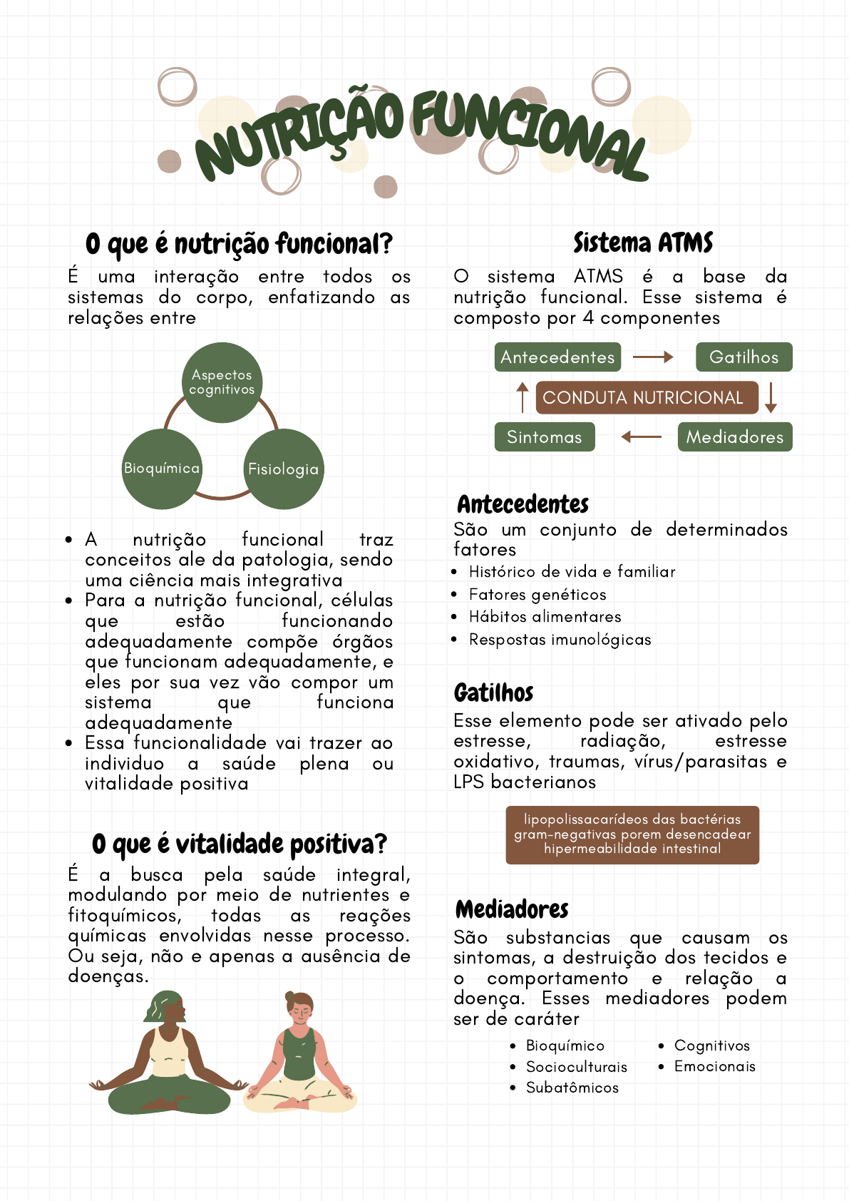 É a busca pela saúde integral, modulando por meio de nutrientes e fitoquímicos, todas as reações químicas envolvidas nesse processo. Ou seja, não e apenas a ausência de doenças. Antecedentes Sintomas Bioquímica Fisiologia Aspectos cognitivos A nutrição funcional traz conceitos ale da patologia, sendo uma ciência mais integrativa Para a nutrição funcional, células que estão funcionando adequadamente compõe órgãos que funcionam adequadamente, e eles por sua vez vão compor um sistema que funciona adequadamente Essa funcionalidade vai trazer ao individuo a saúde plena ou vitalidade positiva É uma interação entre todos os sistemas do corpo, enfatizando as relações entre O sistema ATMS é a base da nutrição funcional. Esse sistema é composto por 4 componentes Esse elemento pode ser ativado pelo estresse, radiação, estresse oxidativo, traumas, vírus/parasitas e LPS bacterianos São substancias que causam os sintomas, a destruição dos tecidos e o comportamento e relação a doença. Esses mediadores podem ser de caráter NUTRI ÇÃOFUNCIONALNUTRI ÇÃOFUNCIONALNUTRI ÇÃOFUNCIONAL Gatilhos Mediadores O que é nutrição funcional? O que é vitalidade positiva? Sistema ATMS CONDUTA NUTRICIONAL Antecedentes São um conjunto de determinados fatores Histórico de vida e familiar Fatores genéticos Hábitos alimentares Respostas imunológicas Gatilhos lipopolissacarídeos das bactérias gram-negativas porem desencadear hipermeabilidade intestinal Mediadores Bioquímico Socioculturais Subatômicos Cognitivos Emocionais Os mediadores vão promover sinalização intracelular por meio de monócitos e macrófagos que podem elevar a produção de citocinas, e essas citocinas vão agir de forma autócrina (dentro da célula) ou parácrina (em células vizinhas), e vão produzir principalmente os fatores inflamatórios NFkB, TNF e IL-6 Hipotálamo: vai haver produção de cortisol, consequentemente isso vai levar a um aumento da adiposidade abdominal Fígado: vai haver uma produção de proteína A-reativa, redução do HDL-c e aumento de triglicerídeos Endotélio: esses mediadores vão levar ao estimulo do VCAM e ICA (proteínas de adesão plaquetária) que são proteínas relacionadas a fisiopatologia da aterosclerose Adipócitos: esses mediadores vão levar ao desequilíbrio das adipocinas, consequentemente desencadeando resistência a insulina A nutrição funcional se monta em uma teia, e essa teia é composta por alguns elementos Desequilíbrios nutricionais Disfunções neuroendócrinas Alterações gastrointestinais Estresse oxidativo Interação corpo-mente Problemas de detoxificação Disfunção imunológica A partir da teia, o nutricionista vai eleger 3 sistemas da teia que estejam em maior desequilíbrio. Depois disso é que o profissional vai tomar a conduta e as prioridades a serem tratadas. Dentro disso, o nutri vai trabalhar com os seguintes pontos Um mesmo fenômeno ou substancia pode agir como antecedente, gatilho ou mediador Mediadores bioquímicos e de inflamação Efeito dos mediadores químicos Teia da nutrição funcional Bloqueando os gatilhos Modulando os mediadores Usando os princípios das DRIs Conexão ATMS Antecedentes, gatilhos ou mediador Sintomas Princípios básicos da nutrição funcional Reestabelecimento orgânico do individuo N U TR I.S TU DI ES FU TUR ANUTRI.STI