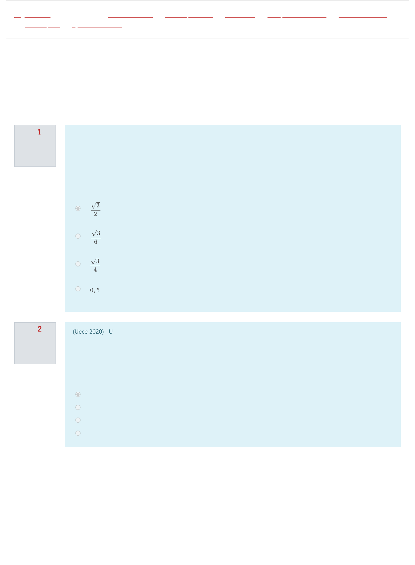 Página inicial / Meus cursos / CURSOS FUNEC / Graduação - EAD / Aluno EAD / JUNÇÕES DE TURMA / Física Mecânica II / AVALIAÇÕES / QUESTIONÁRIO 1 Questão 1 Completo Atingiu 0,00 de 2,00 Questão 2 Completo Atingiu 2,00 de 2,00 Iniciado em Saturday, 13 Mar 2021, 20:46 Estado Finalizada Concluída em Saturday, 13 Mar 2021, 20:50 Tempo empregado 4 minutos 20 segundos Avaliar 10,00 de um máximo de 20,00(50%) (Esc. Naval 2020) Laura está brincando em um escorregador que faz um ângulo de inclinação de 30º com a horizontal. Partindo do repouso no topo do brinquedo, ela escorrega até a base desse escorregador. Sua amiga Ana Clara sugere que será bem mais divertido se elas descerem juntas sobre um tapete. Ao fazerem isso, elas chegam à base do escorregador, partindo do repouso no topo, com o dobro da velocidade com que Laura chegou quando desceu sozinha. Considerando que não existe atrito entre o tapete e a superfície do escorregador, determine o coeficiente de atrito entre Laura e a superfície do escorregador e marque a opção correta. Escolha uma opção: a. b. c. d. 3–√ 2 3–√ 6 3–√ 4 0, 5 (Uece 2020) Uma pessoa, ao realizar um serviço na fachada de uma casa, fica apoiada pelos dois pés no topo de uma escada. Suponha que a escada perde o equilíbrio e tomba para trás, sem deslizar o ponto de apoio com o solo. Suponha também que a escada é indeformável, e que a trajetória do ponto de contato da pessoa com a escada seja um arco de círculo. Considere que a escada exerce sobre o usuário uma força de reação que tem direção radial nesse arco de círculo. Sobre o trabalho realizado pela força de reação da escada sobre os pés do usuário durante a queda, é correto afirmar que Escolha uma opção: a. é nulo pois a força de reação é perpendicular ao deslocamento. b. é dado pelo produto da força peso do usuário pelo comprimento do arco de círculo da trajetória. c. é dado pelo produto da força de reação pelo comprimento do arco de círculo da trajetória. d. é nulo pois a força peso é constante. https://ava.funec.br/ https://ava.funec.br/course/index.php?categoryid=10 https://ava.funec.br/course/index.php?categoryid=17 https://ava.funec.br/course/index.php?categoryid=19 https://ava.funec.br/course/index.php?categoryid=77 https://ava.funec.br/course/view.php?id=625 https://ava.funec.br/course/view.php?id=625#section-6 https://ava.funec.br/mod/quiz/view.php?id=6983 Questão 3 Completo Atingiu 0,00 de 2,00 Questão 4 Completo Atingiu 2,00 de 2,00 (Efomm 2020) Um jogador de futebol cobra uma falta frontal e acerta o canto superior esquerdo da baliza, marcando o gol do título. Suponha que a bola, com massa de 400 g tenha seguido uma trajetória parabólica e levado 1,0 s para atingir a meta. Se a falta foi marcada a 20 m de distância da linha de fundo e a bola atingiu o gol à altura de 2,0 m qual é o vetor força média que o jogador imprimiu à bola durante o chute? Considere que o tempo de interação entre o pé do jogador e a bola foi de 0,1 s e que não há resistência do ar. Considere ainda g = m/s e os vetores unitários ao longo das direções horizontal e vertical, respectivamente. Escolha uma opção: a. b. c. d. 2 eî ĵ 20, 0 N − 7, 0 Nî ĵ 8, 0 N + 2, 8 Nî ĵ 80, 0 N − 12, 0 Nî ĵ 40, 0 N + 14, 0 Nî ĵ (Fgv 2020) A figura mostra o mesmo bloco deslizando sobre duas rampas. A primeira está inclinada de um ângulo em relação à horizontal e a segunda está inclinada de um ângulo também em relação à horizontal, sendo menor que Em ambos os casos, o bloco parte da altura h e desliza até o final das rampas. O coeficiente de atrito entre a superfície do bloco e as superfícies das duas rampas é o mesmo. Considerando os módulos dos trabalhos realizados pela força peso do bloco quando ele desce as rampas 1 e 2, respectivamente, e os módulos dos trabalhos realizados pela força de atrito entre o bloco e a superfície das rampas quando o bloco desce as rampas 1 e 2, respectivamente, pode-se afirmar que Escolha uma opção: a. b. c. d. θ1 θ2 θ1 θ2 eτP1 τP2 eτA1 τA2 = e >τP1 τP2 τA1 τA2 = e <τP1 τP2 τA1 τA2 > e =τP1 τP2 τA1 τA2 = e =τP1 τP2 τA1 τA2 Questão 5 Completo Atingiu 0,00 de 2,00 Questão 6 Completo Atingiu 0,00 de 2,00 Questão 7 Completo Atingiu 0,00 de 2,00 Um elevador, de modo simplificado, pode ser descrito como um sistema composto por duas massas ligadas por uma corda inextensível e suspensas por uma polia de eixo fixo. Uma das massas é um contrapeso e a outra massa é a cabine com seus passageiros. Considerando uma situação em que a cabine executa uma viagem de subida, é correto afirmar que Escolha uma opção: a. a energia potencial da cabine é sempre decrescente nessa viagem. b. o trabalho realizado pela força peso é negativo sobre a cabine e positivo sobre o contrapeso. c. o trabalho total realizado pela força peso sobre o conjunto cabine e contrapeso é sempre nulo. d. a energia cinética do contrapeso tem sempre o mesmo valor da energia cinética da cabine, pois as duas velocidades têm o mesmo módulo. (Unesp 2021) Em uma pista de patinação no gelo, um rapaz e uma garota estão inicialmente em repouso, quando ele começa a empurrá-la, fazendo com que ela percorra cinco metros em linha reta. O gráfico indica a intensidade da resultante das forças aplicadas sobre a garota, em função da distância percorrida por ela. Sabendo que a massa da garota é 60 kg sua velocidade escalar, após ela ter percorrido 3,5 m será Escolha uma opção: a. 0,8 m/s b. 1,0 m/s c. 1,2 m/s d. 0,6 m/s (Espcex (Aman) 2021) Se um corpo descreve um movimento circular uniforme, então: - o módulo da força que age sobre o corpo é ____I____ zero; - o vetor quantidade de movimento ____II____ com o tempo; - o trabalho realizado pela força é ____III____; - a energia cinética é ____IV____. Escolha uma opção: a. I - diferente de II - muda III - diferente de zero IV - variável b. I -