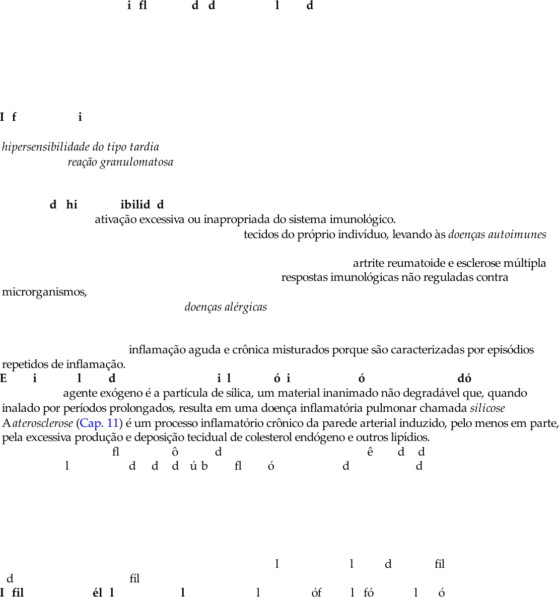 Inflamação Crônica A inflamação crônica é a inflamação de duração prolongada (semanas ou meses) em que a inflamação, a lesão tecidual e as tentativas de reparo coexistem em variadas combinações. Ela sucede a inflamação aguda, conforme descrito anteriormente, ou pode se iniciar insidiosamente, como uma resposta de baixo grau e latente, sem nenhuma manifestação prévia de uma reação aguda. Causas da Inflamação Crônica A inflamação crônica surge nas seguintes situações: • Infecções persistentes por microrganismos que são difíceis de eliminar, tais como micobactérias e certos vírus, fungos e parasitas. Esses organismos frequentemente estimulam uma reação imunológica chamada de hipersensibilidade do tipo tardia (Cap. 6). Algumas vezes, a resposta inflamatória tem um padrão específico chamado de reação granulomatosa (ver adiante). Em outros casos, uma inflamação aguda não resolvida pode progredir para uma inflamação crônica, como ocorre na infecção bacteriana aguda pulmonar, que evolui para um abscesso crônico. • Doenças de hipersensibilidade. A inflamação crônica desempenha papel relevante no grupo de doenças que são causadas pela ativação excessiva ou inapropriada do sistema imunológico. Sob certas circunstâncias, as reações imunológicas se desenvolvem contra os tecidos do próprio indivíduo, levando às doenças autoimunes (Cap. 6). Nessas doenças, os autoantígenos estimulam uma reação imunológica autoperpetuante que resulta em dano tecidual crônico e inflamação; exemplos de tais doenças são artrite reumatoide e esclerose múltipla. Em outros casos, a inflamação crônica é o resultado de respostas imunológicas não reguladas contra microrganismos, como na doença intestinal inflamatória. As respostas imunológicas contra substâncias ambientais comuns são a causa das doenças alérgicas, tais como asma brônquica (Cap. 6). Devido ao fato de as reações autoimunes e alérgicas serem inapropriadamente deflagradas contra os antígenos que normalmente são inofensivos, estas não atendem a propósitos úteis e causam somente doença. Tais doenças podem mostrar padrões morfológicos de inflamação aguda e crônica misturados porque são caracterizadas por episódios repetidos de inflamação. A fibrose pode dominar os estádios tardios. • Exposição prolongada a agentes potencialmente tóxicos, tanto exógenos quanto endógenos. Um exemplo de agente exógeno é a partícula de sílica, um material inanimado não degradável que, quando inalado por períodos prolongados, resulta em uma doença inflamatória pulmonar chamada silicose (Cap. 15). A aterosclerose (Cap. 11) é um processo inflamatório crônico da parede arterial induzido, pelo menos em parte, pela excessiva produção e deposição tecidual de colesterol endógeno e outros lipídios. • Algumas formas de inflamação crônica podem ser importantes na patogênese das doenças que não são convencionalmente consideradas distúrbios inflamatórios. Incluem doenças neurodegenerativas como a doença de Alzheimer, a síndrome metabólica e o diabetes do tipo 2, além de certas neoplasias em que as reações inflamatórias promovem o desenvolvimento de tumores. O papel da inflamação nessas condições é discutido nos capítulos relevantes. Características Morfológicas Ao contrário da inflamação aguda, que é marcada por alterações vasculares, edema e infiltração predominantemente neutrofílica, a inflamação crônica é caracterizada por: • Infiltração com células mononucleares, que incluem macrófagos, linfócitos e plasmócitos (Fig. 3-18). Maria Luiza Realce Maria Luiza Realce Maria Luiza Realce Maria Luiza Realce Maria Luiza Realce Maria Luiza Realce Maria Luiza Realce Maria Luiza Realce Maria Luiza Realce Maria Luiza Realce FIGURA 3-18 A, Inflamação crônica no pulmão, mostrando todas as três alterações histológicas características: (1) coleção de células inflamatórias crônicas (*), (2) destruição do parênquima (os alvéolos normais são substituídos por espaços revestidos pelos epitélios cuboides, cabeças de seta), e (3) substituição por tecido conjuntivo (fibrose, setas). B, Em contraste, na inflamação aguda do pulmão (broncopneumonia aguda), os neutrófilos preenchem os espaços alveolares, e os vasos sanguíneos são congestos. • Destruição tecidual, induzida pelo agente agressor persistente ou pelas células inflamatórias. • Tentativas de reparo pela substituição do tecido danificado por tecido conjuntivo, realizadas pela proliferação de pequenos vasos sanguíneos (angiogênese) e, em particular, fibrose. Como a angiogênese e a fibrose também fazem parte da cura das feridas, serão discutidas mais adiante, no contexto do reparo tecidual. Células e Mediadores da Inflamação Crônica A combinação de infiltração leucocitária, dano tecidual e fibrose, que caracteriza a inflamação crônica, resulta da ativação local de vários tipos celulares e da produção de mediadores. Função dos Macrófagos As células dominantes na maioria das reações inflamatórias crônicas são os macrófagos, que contribuem com a reação ao secretar citocinas e fatores de crescimento que agem em várias células, destruindo invasores estranhos e tecidos, bem como ativando outras células, em especial os linfócitos T. Os macrófagos são fagócitos profissionais que agem como filtros para partículas, microrganismos e células senescentes. Eles também funcionam como células efetoras que eliminam microrganismos nas respostas imunológicas e humorais celulares (Cap. 6). Mas também desempenham muitos outros papéis na inflamação e no reparo. Aqui, revisamos a biologia básica dos macrófagos, incluindo seu desenvolvimento e respostas funcionais. Os macrófagos são células teciduais derivadas de células-tronco hematopoiéticas na medula óssea, bem como de células progenitoras no saco vit