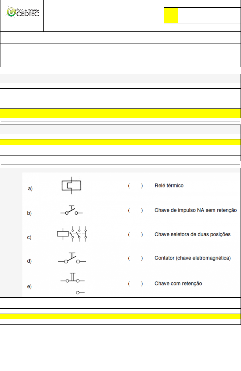 Pincel Atômico - 27/02/2021 23:29:07 1/2 RODRIGO SANTA CLARA DOS SANTOS EXERCíCIO CAMINHO DO CONHECIMENTO - ETAPA 24 (13632) Atividade finalizada em 27/02/2021 23:29:04 (tentativa: 1) LEGENDA Resposta correta na questão # Resposta correta - Questão Anulada X Resposta selecionada pelo Aluno Disciplina: ELETRICIDADE APLICADA [capítulos - 101] - Avaliação com 4 questões, com o peso total de 3,25 pontos Turma: Curso Técnico: Mecânica - Grupo: EAD - SETEMBRO/20 - EADMEC [19357] Aluno(a): 91183820 - RODRIGO SANTA CLARA DOS SANTOS - Respondeu 2 questões corretas, obtendo um total de 1,63 pontos como nota Questão 001 Pode-se falar sobre fusíveis. A) São dispositivos de ligação, utilizados para permitir sobrecorrentes nos circuitos elétricos. B) Tudo afirmado acima sobre fusíveis esta errado ou incompleto. C) São dispositivos de eletrônicos, utilizados para proteção contra sobrecorrente (curto-circuito) e sobrecarga de pouca duração. São constituídos por um condutor de grande seção reta (elo fusível) em relação aos condutores da instalação, montados em uma base de material isolante. D) São dispositivos que permitem o fluxo natural dos elétrons nos circuitos de comando. X E) São dispositivos de proteção, utilizados para proteção contra sobrecorrente (curto-circuito) e sobrecarga de longa duração. São constituídos por um condutor de seção reduzida (elo fusível) em relação aos condutores da instalação, montados em uma base de material isolante. Questão 002 São dispositivos de proteção usados em circuitos de alta potência e conectados por encaixe, com ferramenta própria (punho) para proteção do operador. O texto se refere a que tipo de dispositivo? A) Disjuntores de força X B) Fusível do tipo NH gL/gG de efeito retardado C) Fusíveis do tipo Diazed de efeito rápido D) Relés de sobrecorrente E) Disjuntores de comando Questão 003 Relacione as colunas indicando a simbologia e descrição dos componentes correspondentes. A) A,C,E,B,D B) E,C,A,D,B X C) D,B,A,C,E D) A,B,E,C,D E) A,E,C,B,D Pincel Atômico - 27/02/2021 23:29:07 2/2 Questão 004 Abaixo é mostrado o desenho de um conjunto completo a respeito dos fusíveis diazed. Indique nas respostas dadas, aquela que mostra corretamente as partes desse conjunto. X A) I é a base; III é o anel de proteção; II é o parafuso de ajuste; V é o fusível e IV é a tampa. B) II é a base; IV é o anel de proteção; V é o parafuso de ajuste; I é o fusível e III é a tampa. C) Outros componentes. D) I é a base; II é o anel de proteção; III é o parafuso de ajuste; IV é o fusível e V é a tampa. E) I é a base; I é o anel de proteção; IV é o parafuso de ajuste; IV é o fusível e V é a tampa.