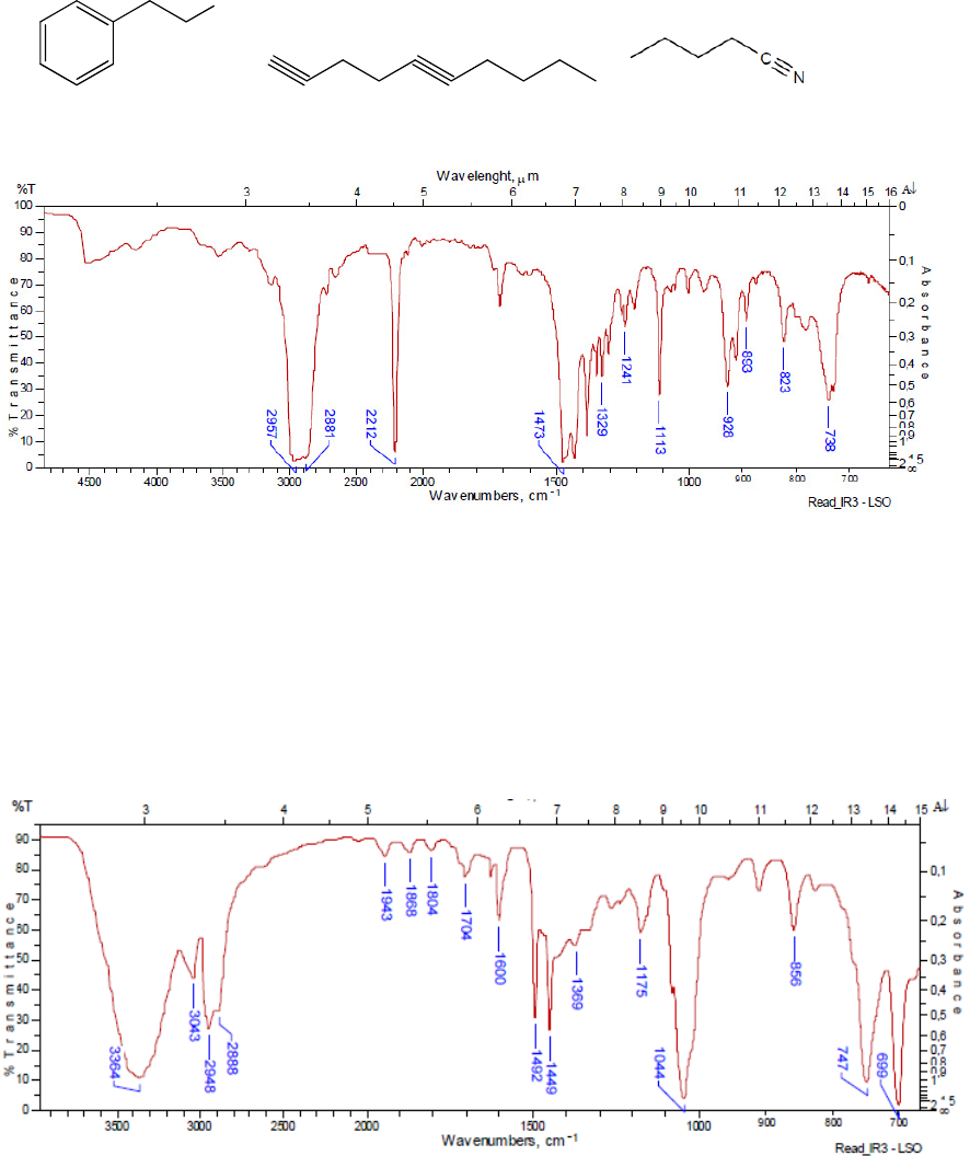 1 1a ATIVIDADE AVALIATIVA (UNIDADE 1-INFRAVERMELHO) −−−− QUI 289 UFOP−−−−1/2020-REMOTO Profa Andréa Mendes do Nascimento Valor: 1 ponto Data: 09/02/21 Nome do(a) aluno(a): ________________________________________________________ 1 −−−− Para os espectros abaixo: Relacione as estruturas com os espectros de 1 a 3. Faça a atribuição detalhada de quatro bandas que você utilizou para a escolha da estrutura (0,6 pontos). OH A B C Espectro 1: Estrutura ______ Banda:_________cm -1 atribuição:________________________________________________ Banda:_________cm -1 atribuição:_________________________________________________ Banda:_________cm -1 atribuição:_________________________________________________ Banda:_________cm -1 atribuição:_________________________________________________ Espectro 2: 2 Estrutura ______ Banda:_________cm -1 atribuição:________________________________________________ Banda:_________cm -1 atribuição:_________________________________________________ Banda:_________cm -1 atribuição:_________________________________________________ Banda:_________cm -1 atribuição:_________________________________________________ Espectro 3: Estrutura ______ Banda:_________cm -1 atribuição:________________________________________________ Banda:_________cm -1 atribuição:_________________________________________________ Banda:_________cm -1 atribuição:_________________________________________________ Banda:_________cm -1 atribuição:_________________________________________________ 2 −−−− Escolha a estrutura que melhor se adapta ao espectro de infravermelho apresentado abaixo. Justifique detalhadamente sua resposta. (0,4 pontos) 2-Metil-1-noneno 1-Deceno A B C D trans-3-Deceno cis-3-Deceno 3