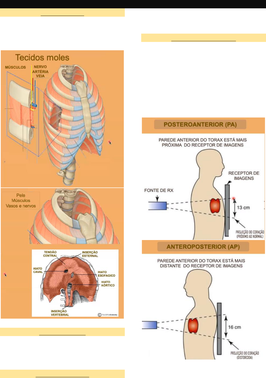 TÍTULO: IMAGEM DO TÓRAX NORMAL I NOME: LUCIANO FEITOSA DATA: 09/02/2021 • ELEMENTOS MOLES: - Músculos - Nervo - Artéria - Veia • ELEMENTOS ÓSSEOS: - Costelas - Esterno - Coluna • RADIOGRAFIA DO TÓRAX: - Tubo de raio-x convencional, com uma diferença: ➢ Não existem mais os chassis, mas sim sensores - Saia de chumbo: protege as gônadas • INCIDÊNCIAS RADIOGRÁFICAS: - São denominadas de acordo com a maneira como o feixe de raio-x atravessa o corpo do paciente - - Polegar: C7 (7ª vértebra cervical) - Dedo mínimo: T7 (7ª vértebra torácica) - Encosta no receptor de imagem o que não quer distorcer - Perfil esquerdo (para não distorcer o coração) e PA (posteroanterior) - Nesse segundo exemplo, o coração pode ser diagnosticado ERRONEAMENTE como cardiomegalia • INCIDÊNCIA PA: - Pulmões e coração ➢ Costelas são melhores observadas em outra incidência - Reduz a magnificação (distorção) do coração • INCIDÊNCIA AP: - As clavículas ficam levantadas ➢ Se dirigem aos ápices pulmonares - As escápulas ficam em cima dos corpos pulmonares ➢ Dificulta a visualização pulmonar - Aumenta a magnificação (distorção) do coração ➢ Cardiomegalia • INCIDÊNCIAS OBLÍQUAS: - Mais usadas por cardiologistas ➢ Muita especificidade - Depende de qual região (Anterior X Posterior e Esquerda X Direita) do corpo está mais próxima do receptor de imagens • COSTELAS: - Articulam-se ao esterno e à coluna - Extremidade anterior cartilaginosa não é visível na radiografia - Técnica especial para estruturas ósseas - AP: ➢ Costelas posteriores ➢ Costelas flutuantes podem ser prejudicadas - PA e Oblíquas: ➢ Porções laterais e anteriores das costelas ➢ Visualização é prejudicada em caso de grandes mamas • CARTILAGENS: - Cartilagem calcificada aparecendo na radiografia ➢ Em decorrência da idade ou de doenças metabólicas - Em crianças: costelas mais horizontalizadas ➢ Não confundir com fratura ➢ NSO (núcleos secundários de ossificação) ➢ Ossificam na puberdade • MAUS TRATOS INFANTIS: - Muito difícil fraturar as faces laterais das colunas ➢ Indício forte de violência infantil ➢ Se agravou com a pandemia ➢ Não se quebra em massagem cardíaca médica • MASTECTOMIA: - Retirada da mama esquerda ➢ Possivelmente câncer de mama - Desalinhamento das clavículas ➢ Articulação esternoclavicular é a referência • COMO IDENTIFICAR A PRIMEIRA COSTELA TORÁCICA: - Através do processo transverso, pois o da sétima vértebra cervical (C7) dirige-se horizontalmente ou para baixo - E o processo transverso da T1 dirige-se para cima • SÍNDROME DO DESFILADEIRO TORÁCICO: - Sintomas: ➢ Costela cervical ou supranumerária (0,5% da população mundial) ➢ Músculos escalenos ➢ Articulação costoclavicular - Podem ser assintomáticos - Pode comprimir a artéria subclávia ou plexo braquial - Quando a pessoa levanta as mãos, uma delas fica pálida - Na TC acima, dá pra ver a costela supranumerária articulando-se com a T1 • ANGIOGRAFIA POR RM: - Na angiografia por RM vemos uma redução no calibre (estenose) da veia subclávia quando eleva o braço esquerdo - Resumindo, se tiver um paciente com suspeita da síndrome do desfiladeiro, temos que ver se há sintomas (se sim) aí faz os exames (RX, ultrassonografia... etc) • ANGIOGRAFIA POR TC: - Em repouso: ok - Braços levantados: não vê os vasos do lado esquerdo (compressão da veia subclávia) • TC DAS COSTELAS: - Paciente deitado e braços para cima - Sempre faz cortes no plano axial ➢ É impossível cortar uma costela inteira, pois elas correm obliquamente - Radiografia digital (localizador) - 10% dos traumas fechados de tórax apresentam fratura ➢ Juntamente com lesão vascular ou visceral • FRATURAS: - Fraturas isoladas em jovens tem bom prognóstico, logo, não justifica fazer uma TC - Idosos tem maior incidência de complicações pulmonares (hipoventilação) - As fraturas isoladas de maior risco são em T1 - Em geral, resolvem em torno de 6 semanas • ESTERNO: - Não é visto nas radiografias frontais ➢ Pouca espessura ➢ Baixa densidade ➢ Superposição de estruturas - Em Oblíqua Anterior Direita tem como ver - A melhor maneira é utilizar a TC - Reformações 2D e 3D • DESENVOLVIMENTO EMBRIONÁRIO DO ESTERNO: - Duas barras de tecido mesenquimal - De cima pra baixo (no sentido caudal) - Após fusão, se divide em 6 segmentos (1 no manúbrio, 4 no corpo e 1 no processo xifoide) - Fusão dos segmentos esternais • ANOMALIAS DE FUSÃO: - Variantes anatômicas (sem prejuízo de função) - Forame esternal - Acupunturistas morrem de medo (caso antigo) - Cuidado nas punções de esterno, pois se afetado, esse forame está na frente do coração, podendo ocasionar um derrame pericárdico, por exemplo • RECESSOS COSTOFRÊNICOS: - É nas radiografias laterais - Observado nos ângulos costofrênicos anterior e posterior ➢ Formados pelas cúpulas frênicas e pela parede torácica • COLUNA TORÁCICA: - Existem 12 vértebras (segmento que é mais longo) - As vértebras articulam-se entre si e com as costelas - De articulação é importante lembrar que a articulação da costela com a vértebra se dá através do corpo da vértebra e do processo transverso - Além de lembrar dos componentes das vértebras, importante para a identificação radiográfica - Os pedículos são “olhinhos” nas extremidades das vértebras - 1) Processo transverso - 2) Pedículo - 3) Espaço intercostal - 4) Processo espinhoso - 5) Disco intervertebral - 6) Porção posterior - 1) Processo transverso - 2) Processo espinhoso - 3) Pedículo - 4) Disco intervertebral - 5) Costela - 1) Costela - 2) Forame neural • TC AXIAL: - 3) Corpo da vértebra - 1) Pedículo: comunica o corpo com o arco posterior - 5) Processo espinhoso - 2) Processo transverso - Asterisco: canal medular (onde tem o saco dural e medula espinhal) - Normalmente, o conteúdo do canal medular tem