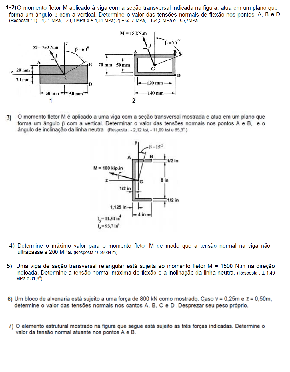 - 3ª LISTA DE RESISTÊNCIA DOS MATERIAIS II– Flexão - Respostas:6) σA=9,9kPa, σB=-49,4kPa, σC=-128kPa, σD=-69.1kPa 7) σA=-21.3psi, σB=-12,2psi 8)Duas barras de latão são unidas firmemente a duas barras de alumínio, formando a seção composta mostrada. Usando os dados abaixo, determinar o maior momento fletor permissível, quando a viga é encurvada em torno de um eixo horizontal. Resposta:M=2,22kNm 9)Uma viga de concreto é reforçada por três barras de aço, colocadas como indicado. Os módulos de elasticidade são de 20GPa para o concreto e de 200GPa para o aço. Usando uma tensão admissível de 10MPa para o concreto e de 150MPa para o aço, determinar o maior momento fletor que pode ser aplicado à viga. Resposta: M=79,1kNm 10) A viga de concreto reforçada, como mostrado, é submetida a um momento fletor de 55kNm. Sabendo-se que os módulos de elasticidade são de 25GPa para o concreto e de 200GPa para o aço, determinar: (a) a tensão no aço; (b) a máxima tensão no concreto. Respostas: (a) 158,8MPa (b)-13,05MPa 11) A viga de concreto armado é feita de duas hastes de reforço de aço. Se a tensão de tração admissível par o aço for (σaço)adm=280MPa e a tensão de compressão admissível para o concreto for (σconc)adm=21MPa, determine o momento máximo M que pode ser aplicado à seção. Considere que o concreto não pode suportar uma tensão de tração. Eaço=200GPa, Econc=26,5GPa. Resposta: 127,98kNm 12) A viga em U de aço é usada para reforçar a viga de madeira. Determine a tensão máxima no aço e na madeira se a a viga for submetida a um momento de M=850lb.ft Eaço=29(10 3)ksi, Emad=1600ksi. Respostas: σaço=-1,4ksi σmad=-77psi