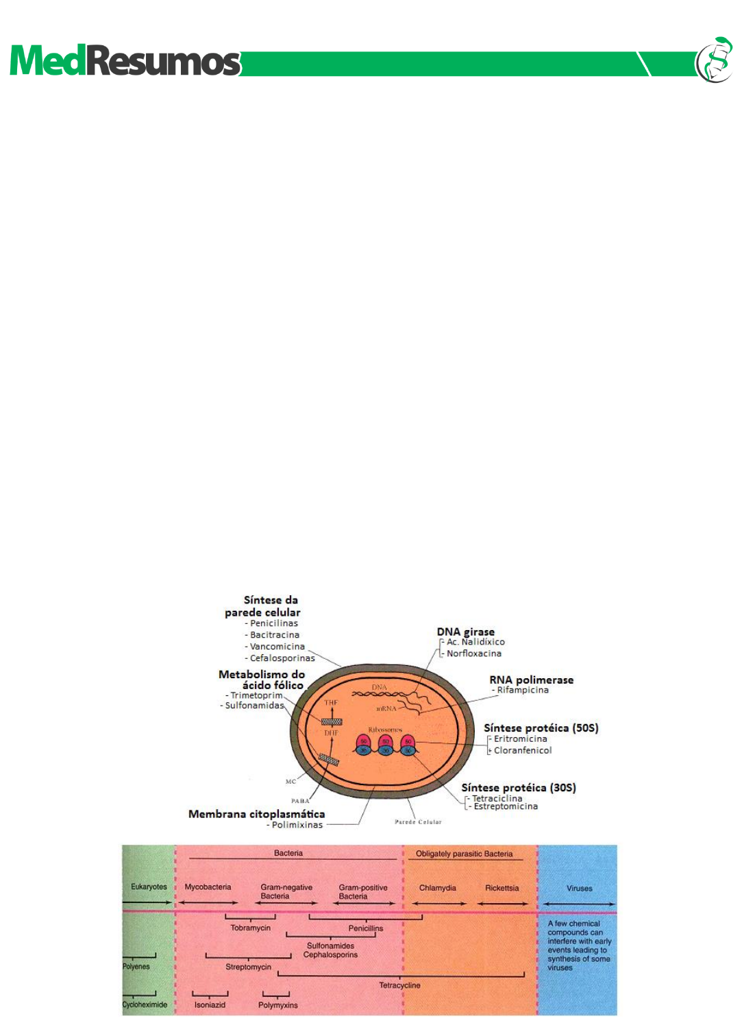 1 www.medresumos.com.br ANTIBIÓTICOS: APLICABILIDADE CLÍNICA Como foi exposto no capítulo anterior, os antibióticos são conceituados como drogas antibacterianas que provém de organismos vivos. Podem ser naturais (quando a molécula da droga é totalmente de origem natural; Ex: penicilina, que é extraída de fungos) ou semissintéticos (quando uma molécula, de origem natural, é alterada em laboratório; Ex: oxacilina). No grupo dos antibióticos, de forma meramente didática, inclui-se também o estudo de alguns antibacterianos quimioterápicos, que são drogas sintetizadas completamente em laboratório, o que as classifica como sintéticas (Ex: sulfas). Neste estudo, esse tipo de antibacterianos será, por critérios meramente didáticos, inserido nos grupos dos antibióticos. Este capítulo, diferentemente do anterior, tem o objetivo de trazer uma abordagem mais voltada para a clínica no que diz respeito ao estudo dos antibióticos, mostrando, na medida do possível, relações que interfiram diretamente nas condutas terapêuticas que envolvam a utilização desta classe de fármacos, tais como mecanismos de ação, mecanismos de resistência, tipos e dosagens dos antibióticos. De uma forma geral, este capítulo estará dividido obedecendo à seguinte ordem classificatória: Antibióticos com ação na parede bacteriana: o Beta-lactâmicos Penicilinas Cefalosporinas Carbapenêmicos e Monobactâmicos o Glicopeptídeos o Polimixina B Antibióticos com ação no citoplasma microbiano o Macrolídeos e lincosamidas o Cloranfenicol o Tetraciclinas o Aminoglicosídeos o Sulfonamidas + Trimetroprim o Fluorquinolonas o Metronidazol Arlindo Ugulino Netto. FARMACOLOGIA 2 www.medresumos.com.br BETA-LACTÂMICOS Os antibióticos beta-lactâmicos são classificados pela semelhança estrutural e pela adição de radicais que fornecem a estabilidade dessas drogas. Os principais representantes são: penicilinas; cefalosporinas; carbapenêmicos monobactâmicos. MECANISMO DE AÇÃO Os beta-lactâmicos são antibióticos caracterizados quimicamente pela presença do anel beta-lactâmico. Por intermédio deste anel, esses antibióticos inibem a síntese da parede bacteriana de germes Gram-positivos e Gram-negativos. Esses antibióticos se ligam a um grupo de proteínas da membrana plasmática, denominadas Proteínas Ligadores de Penicilina (no inglês, PBP), que funcionam como enzimas necessárias à síntese das peptidoglicanas da parede bacteriana. A ligação do antibiótico à PBP inibe a sua função enzimática e, portanto, bloqueia a síntese da parede bacteriana, levando à morte da bactéria (poder bactericida). OBS 1 : A parede bacteriana, como se sabe, é um componente estrutural essencial para a vida das bactérias, ao evitar a sua lise por osmose. Entretanto, sua composição difere entre Gram-positivos e Gram-negativos: A parede das bactérias Gram-positivas (Streptococcus sp.; Staphylococcus sp.; Enterococcus sp.; Peptostreptococcus sp.; Clostridium sp.; etc.) é formada por apenas uma camada de peptidoglicadas, com uma espessura entre 20-80µm. A parede das bactérias Gram-negativas (Haemophilus sp.; Moraxela sp.; família Enterobacteriaceae; Pseudomonas sp.; Bacteroides sp.; etc.) é constituída por uma dupla camada – uma mais interna de peptidoglicanas, com espessura de apenas 1nm, e uma membrana externa, contendo o lipopolissacarídeo (LPS). Entre a membrana externa e a camada de peptidoglicanas, está o espaço periplasmático. OBS 2 : Os beta-lactâmicos alcançam facilmente a PBP dos Gram-positivos, mas precisam atravessar canais proteicos (porinas) na membrana externa dos Gram-negativos para atingir o espaço periplasmático, onde se ligam à PBP, o que limita um pouco o espectro de ação dos beta-lactâmicos com relação às bactérias Gram-negativas. MECANISMO DE RESISTÊNCIA A resistência de uma bactéria a um determinado antibiótico pode ser intrínseco (quando é decorrente da própria natureza do microrganismo, como na ausência de um determinado sítio de ação, por exemplo) ou adquirida (quando surge a partir de uma mutação de um gene bacteriano). Os principais mecanismos de resistência bacteriana aos beta- lactâmicos são: Produção de beta-lactamases: as beta-lactamases são enzimas capazes de inativar um determinado antibiótico beta-lactâmico, por hidrolisar o seu anel principal. Tais enzimas podem clivar predominantemente as penicilinas (penicilinases), as cefalosporinas (cefalosporinases) ou qualquer uma das duas. Um exemplo clássico de penicilinases específicas é a produzida pela maioria das cepas de Staphylococcus aureus responsável pela sua resistência a todas as penicilinas, menos as do grupo da oxacilina (S. aureus oxacilina- sensível). Como esta bactéria não produz nenhuma cefalosporinase, costuma ser sensível à maioria das cefalosporinas, principalmente as de 1ª geração (Cefalexina, Cefalotina). A produção de beta-lactâmases é o principal mecanismo de resistência dos Gram-negativos aos antibióticos beta-lactâmicos. Algumas cepas de Haemophilus influenzae, Moraxella catarrhalis, Escherichia coli, Proteus mirabilis, Salmonella sp. e Shigella sp. Produzem beta-lactamases plasmídio-codificadas, que os torna resistências às penicilinas e cefalosporinas de 1ª geração, mas não às cefalosporinas de 2ª, 3ª e 4ª geração e aos carbapenêmicos. A associação de antibióticos beta-lactâmicos com inibidores de beta-lactamases (Clavulanato, Sulbactam, Tazobactam) tem ampliado significativamente o espectro de ação desses antibióticos, tanto para Gram positivos (como o S. aureus) como para Gram-negativos (como o H. influenzae, Enterobacteriaceae e Bacteroidesfragilis). Infelizmente, já existem cepas de Enterobacteriaceae que produzem beta-lactamases plasmídio-codificadas que resistem à ação desses inibidores. PBP com baixa afinidade pelo antibiótico: este é o mecanismo de resistência do S. aureus MRSA (Methicill