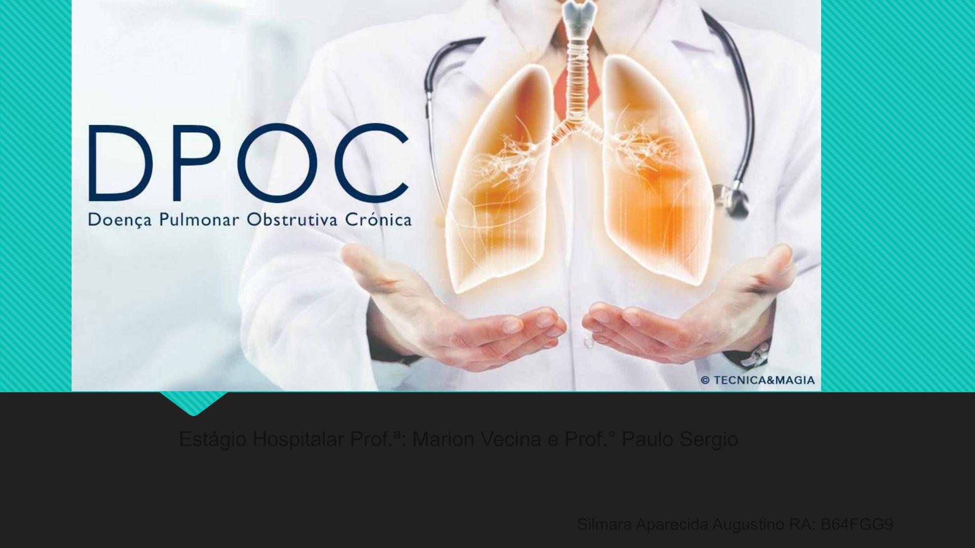 kk Estágio Hospitalar Prof.ª: Marion Vecina e Prof.° Paulo Sergio Silmara Aparecida Augustino RA: B64FGG9 Definição A doença pulmonar obstrutiva crônica (DPOC ) é um estado patológico que pode ser prevenido e tratado, caracterizado por uma limitação do fluxo aéreo, que não é totalmente reversível. Ela envolve tanto o enfisema quanto a bronquite crônica. A limitação do fluxo aéreo geralmente é progressiva e está associada a uma reação inflamatória anormal dos pulmões a partículas ou gases nocivos. Embora a DPOC afete os pulmões, ela também a presenta consequências sistêmicas significativas. Epidemiologia A doença pulmonar obstrutiva crônica (DPOC) é mais comum em idosos, principalmente os que estão acima dos 65 anos de idade. A mortalidade associada a ela mais que dobrou entre as mulheres nos últimos 20 anos e atualmente corresponde à dos homens. O número de casos de DPOC nos EUA aumentou em 41% desde 1982, e a DPOC afeta de 1% a 3% das mulheres brancas e de 4% a 6% dos homens brancos. Atualmente, estima-se que a DPOC será a terceira principal causa de morte no mundo até 2020. Isto se deve à expansão epidêmica do tabagismo, ao envelhecimento da população mundial e à redução da mortalidade decorrente de outras causas de morte, como as doenças cardiovasculares. Uma revisão sistemática e metanálise demonstrou que a prevalência da DPOC em adultos descendentes de pessoas com DPOC é maior que as estimativas de base populacional. Um estudo retrospectivo conduzido no Reino Unido entre 1990 e 1997 estimou a prevalência de DPOC em 2% nos homens e de 1% nas mulheres. Etiologia O tabagismo é o principal fator de risco para doença pulmonar obstrutiva crônica (DPOC). Ele é responsável por 40% a 70% dos casos de DPOC e exerce seus efeitos causando uma reação inflamatória, disfunção ciliar e lesão oxidativa. A poluição do ar e a exposição ocupacional são outras etiologias comuns. O estresse oxidativo e o desequilíbrio das proteinases e antiproteinases também são fatores importantes na patogênese da DPOC, especialmente em pacientes com deficiência de alfa 1-antitripsina, que têm enfisema panacinar, que surge geralmente em idade precoce. Fonte: http://www.luzimarteixeira.com.br/fatores-de-risco-para-dpoc/ Fisiopatologia - Estreitamento e a remodelagem das vias áreas; - Maior número de células caliciformes; - Aumento das glândulas mucossecretoras das vias aéreas centrais; - Alterações no leito vascular causa á hipertensão pulmonar; - Diminuição do fluxo aéreo; - Aumento da resistência de vias aéreas; - Diminuição do recuo elástico; - Hiperinsuflação; - Hipertensão pulmonar. Fatores de Risco - Tabagismo (Causa 40% a 70% dos casos); - Idade avançada (O efeito da idade pode estar relacionado a um período mais longo de tabagismo); - Fatores genéticos (A deficiência de alfa 1-antitripsina é um distúrbio genético); - Exposição à poluição do ar ou exposição ocupacional (A exposição crônica à poeira, à fumaça do escapamento de automóveis e ao dióxido de enxofre) ; - Pulmão com desenvolvimento anormal (nfecções frequentes na infância podem causar cicatrização nos pulmões, diminuição da elasticidade); - Sexo masculino (A DPOC é mais comum em homens, mas isso se deve provavelmente ao fato de a maioria dos fumantes serem homens). Quadro Clínico Tórax em tonel Dispnéia, podendo ser detectado sinais de broncoespasmo Aperto no peito Tosse crônica que produz expectoração. O muco pode ser claro, branco, amarelo ou esverdeado Infecções respiratórias frequentes Falta de energia Perda de peso não intencional (em fases mais avançadas) Alterações do nível de consciência decorrente de hipoxemia e/ou retenção de CO2. Veias jugulares distendidas Cianose. Classificação A classificação é realizada por meio do teste de espirometria que permite identificar a funcionalidade da mecânica pulmonar. Fonte: Adaptação de Global Initiative for Chronic Obstructive Lung Disease. Diagnóstico Anamnese Exame físico Espirometria Eletrocardiograma Raio X Oximetria Gasometria arterial Prevenção Primária Evitar a exposição ao tabaco (medidas ativas e passivas) e fumaças tóxicas é de inestimável importância na prevenção primária da doença pulmonar obstrutiva crônica (DPOC). Deve-se oferecer a todos os fumantes intervenções com o objetivo de promover o abandono do hábito de fumar, incluindo farmacoterapia e aconselhamento. Embora o abandono do hábito de fumar possa estar associado a efeitos adversos menores de curta duração, como ganho de peso e constipação, seus benefícios em longo prazo são inquestionáveis. Para doenças decorrentes da exposição ocupacional, a prevenção primária é obtida pela eliminação ou redução das exposições no local de trabalho. Prevenção Secundária A vacinação contra a gripe viral (influenza) e o Streptococcus pneumoniae é fortemente recomendada para todos os pacientes com doenças cardiopulmonares, inclusive a DPOC. O uso de cálcio e outros medicamentos pode ser necessário para prevenir ou tratar a osteoporose em alguns pacientes, sobretudo em mulheres mais velhas que estejam sob corticoterapia de longo prazo. Os exames de densidade óssea são feitos para avaliar a progressão dessa condição. Há dados conflitantes sobre as antibioticoterapias profiláticas. Pode-se considerar o uso de antibióticos profiláticos como os macrolídeos para a redução do risco de exacerbação aguda. Embora as diretrizes atuais ainda não defendam o uso de antibióticos profiláticos, as evidências do estudo MACRO sugerem que a azitromicina reduz o risco de exacerbações agudas em pacientes com DPOC. No entanto, quando administrada por 1 ano, o efeito colateral mais evidente foi a perda auditiva. Acredita-se que a terapia com azitromicina seja a mais efetiva na prevenção de exacerbação aguda, com grande eficácia em pacientes idosos e em es