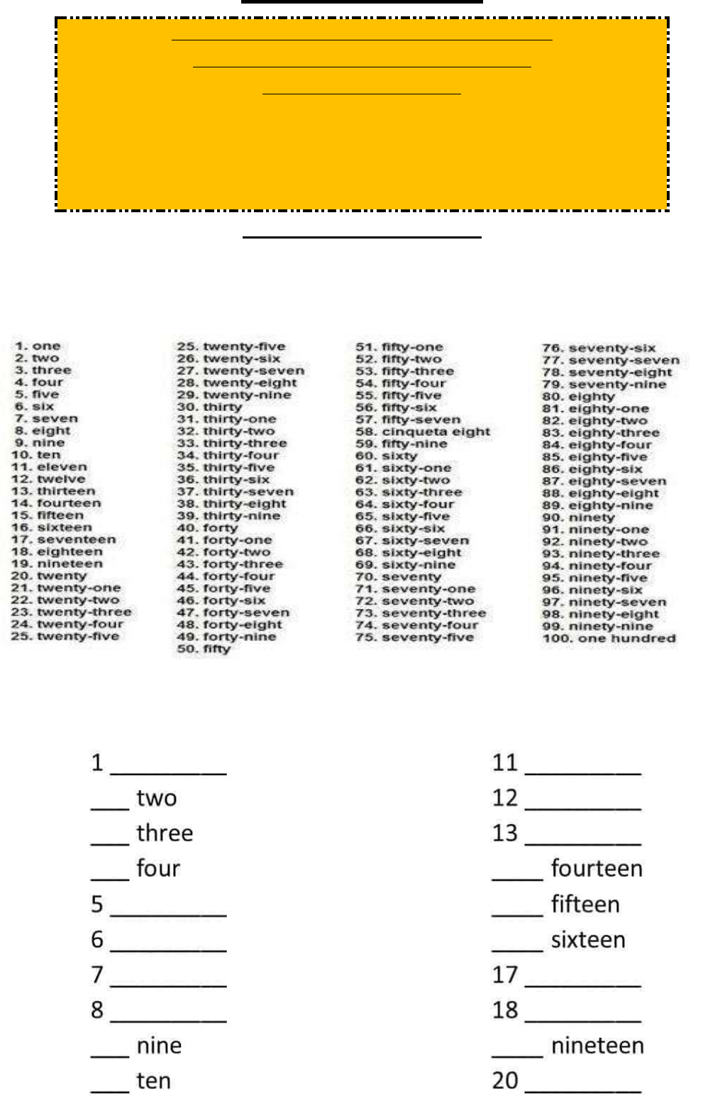 6º ANO (AULA 03) CARDINAL NUMBERS 1. CRIE A DATA EM ENGLISH COMPLETA EM SEU CADERNO: 2. LEIA OS NOMES DOS NUMERAIS ABAIXO E VEJA COMO SE CONSTROI O NOME DE CADA UM DELES,OU SEJA SUAS TERMINAÇÕES E ESCRITAS EM ENGLISH: 3. PREENCHA OS ESPAÇOS ABAIXO, COM OS NOMES DOS NÚMEROS EM ENGLISH: IMPORTANT: DITADO ALFABETH (PROVA ORAL) (NAS PRÓXIMA AULAS, VALENDO 0 A 10) -1ª NOTA DO SEMESTRE- TREINE EM CASA, PEÇA AJUDA PARA OS IRMÃOS E PAIS, SE POSSÍVEL, PARA QUE ELES POSSAM TOMAR DE VOCÊ O ALFABETO EM ENGLISH. A TEACHER IRÁ SORTEAR LETRAS ALEATÓRIAS PARA CADA UM DE VOCÊS, POR ISSO, ESTUDE O ALFABETO INTEIRO. GOOD LUCK!!! 😊 4. ESCREVA OS NOMES E OS ALGARISMOS (NUMERAIS) CORRESPONDENTES EM ENGLISH NOS ESPAÇOS ABAIXO:
