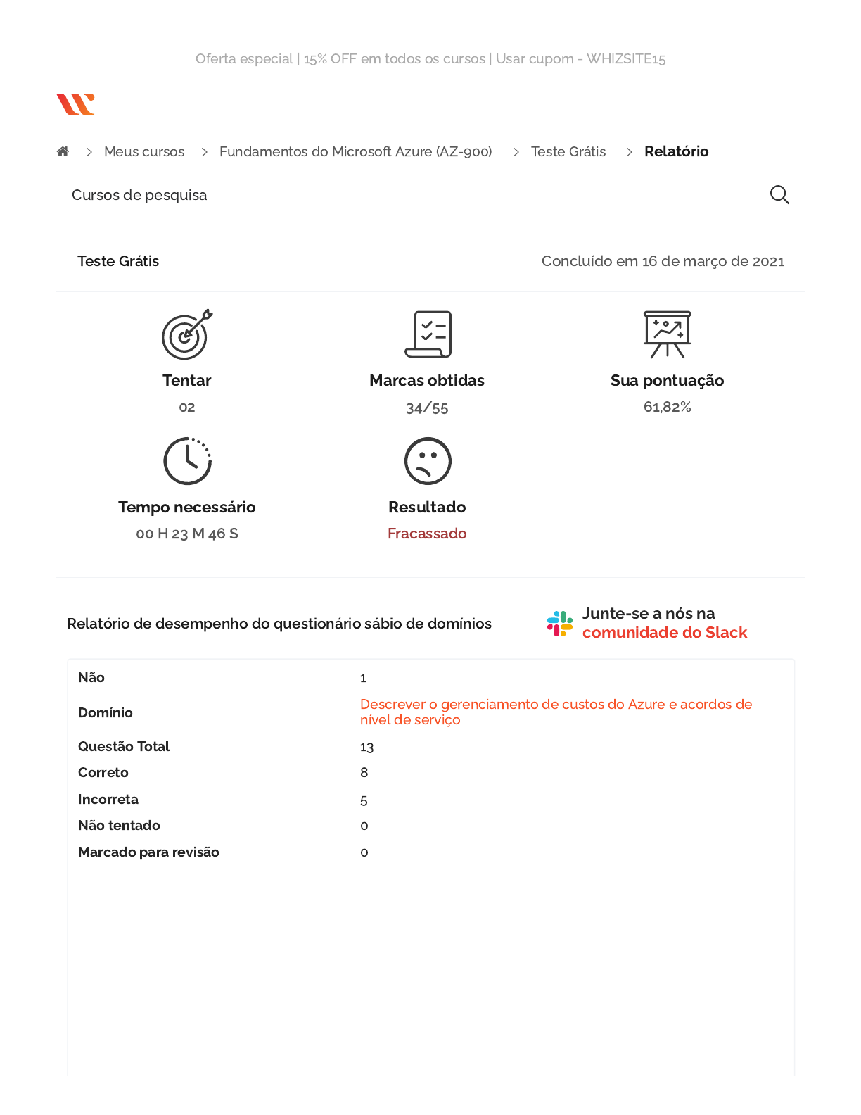 16/03/2021 Cursos de treinamento de certificação online Whizlabs para profissionais (AWS, Java, PMP) https://www.whizlabs.com/learn/course/quiz-result/3275123 1/82 Teste Grátis Concluído em 16 de março de 2021 Relatório de desempenho do questionário sábio de domínios Junte-se a nós na comunidade do Slack Não 1 Domínio Descrever o gerenciamento de custos do Azure e acordos de nível de serviço Questão Total 13 Correto 8 Incorreta 5 Não tentado 0 Marcado para revisão 0 Oferta especial | 15% OFF em todos os cursos | Usar cupom - WHIZSITE15 j Meus cursos j Fundamentos do Microsoft Azure (AZ-900) j Teste Grátis j Relatório Cursos de pesquisa D Tentar 02 Marcas obtidas 34/55 Sua pontuação 61,82% Tempo necessário 00 H 23 M 46 S Resultado Fracassado https://join.slack.com/t/whizlabseducationinc/shared_invite/zt-nghe2wvp-0fdw2sBS4u~M36hvXcWSWw javascript:; https://www.whizlabs.com/ https://www.whizlabs.com/learn https://www.whizlabs.com/learn https://www.whizlabs.com/learn/my-courses https://www.whizlabs.com/learn/course/microsoft-azure-az-900#section-1 https://www.whizlabs.com/learn/course/microsoft-azure-az-900/quiz/19435 16/03/2021 Cursos de treinamento de certificação online Whizlabs para profissionais (AWS, Java, PMP) https://www.whizlabs.com/learn/course/quiz-result/3275123 2/82 Não 2 Domínio Descreva recursos de identidade, governança, privacidade e conformidade Questão Total 5 Correto 1 Incorreta 4 Não tentado 0 Marcado para revisão 0 Não 3 Domínio Descreva a segurança geral e os recursos de segurança da rede Questão Total 5 Correto 3 Incorreta 2 Não tentado 0 Marcado para revisão 0 Não 4 Domínio Descreva os principais serviços do Azure Questão Total 10 Correto 8 Incorreta 2 Não tentado 0 Marcado para revisão 0 javascript:; javascript:; javascript:; 16/03/2021 Cursos de treinamento de certificação online Whizlabs para profissionais (AWS, Java, PMP) https://www.whizlabs.com/learn/course/quiz-result/3275123 3/82 Não 5 Domínio Descreva as principais soluções e ferramentas de gerenciamento no Azure Questão Total 14 Correto 8 Incorreta 6 Não tentado 0 Marcado para revisão 0 Não 6 Domínio Descreva os conceitos de nuvem Questão Total 8 Correto 6 Incorreta 2 Não tentado 0 Marcado para revisão 0 Total Total Todo o Domínio Todo o Domínio Questão Total 55 Correto 34 Incorreta 21 Não tentado 0 Marcado para revisão 0 Reveja as respostas Classi�cando por Todo Questão 1 Correto Domínio: Descrever o gerenciamento de custos do Azure e acordos de nível de serviço Uma empresa acabou de configurar uma conexão virtual privada do Azure entre sua rede local e uma rede virtual do Azure. A empresa precisaria pagar custos adicionais para transferir vários gigabits de dados de sua rede local para o Azure? ] UMA. sim ] B. Nãoz A javascript:; javascript:; javascript:; 16/03/2021 Cursos de treinamento de certificação online Whizlabs para profissionais (AWS, Java, PMP) https://www.whizlabs.com/learn/course/quiz-result/3275123 4/82 Explicação: Resposta - B As transferências de dados para o data center do Azure são gratuitas. A documentação da Microsoft menciona o seguinte. Para obter mais informações sobre preços de largura de banda, visite o URL abaixo- https://azure.microsoft.com/en-us/pricing/details/bandwidth/ Pergunte aos nossos especialistas Avalie esta pergunta? v u Questão 2 Incorreta Domínio: Descrever o gerenciamento de custos do Azure e acordos de nível de serviço Você está planejando configurar uma conta gratuita do Azure. Após 30 dias, alguns produtos do Azure ainda estariam livres para uso? Explicação: Resposta - A Ver consultas open j ] UMA. sim A ] B. Nãoz B https://azure.microsoft.com/en-us/pricing/details/bandwidth/ javascript:; 16/03/2021 Cursos de treinamento de certificação online Whizlabs para profissionais (AWS, Java, PMP) https://www.whizlabs.com/learn/course/quiz-result/3275123 5/82 A conta gratuita do Azure dá acesso a todos os serviços do Azure durante os primeiros 30 dias com um crédito gratuito de $ 200. Após esse período, o usuário teria acesso apenas a um subconjunto de serviços do Azure gratuitamente. Por exemplo, a Proteção contra ameaças do Azure é um serviço que não está disponível com a conta gratuita. O usuário precisa converter para "assinatura pré-paga" se precisar aproveitar todos os serviços do Azure. Para obter mais informações sobre as perguntas mais frequentes sobre a conta gratuita do Azure, visite o URL abaixo- https://azure.microsoft.com/en-us/free/free-account-faq/ Pergunte aos nossos especialistas Avalie esta pergunta? v u Questão 3 Incorreta Domínio: Descrever o gerenciamento de custos do Azure e acordos de nível de serviço Uma empresa planeja atualizar seu plano Azure AD Free atual para o plano Azure AD Premium P1. A Microsoft fornece o mesmo conjunto de recursos para os dois planos? Explicação: Resposta - B Os planos de suporte têm diferentes conjuntos de recursos. A documentação da Microsoft menciona o seguinte. Ver consultas open j ] UMA. simz B ] B. Não A https://azure.microsoft.com/en-us/free/free-account-faq/ javascript:; 16/03/2021 Cursos de treinamento de certificação online Whizlabs para profissionais (AWS, Java, PMP) https://www.whizlabs.com/learn/course/quiz-result/3275123 6/82 The below link provides more information about features supported in different Azure AD plans with their pricing details. Ask our Experts Rate this Question? v u Question 4 Correct Domain :Describe Azure cost management and Service Level Agreements A company is planning to host 2 Virtual Machines in Azure, as shown below. Virtual Machine Name Virtual Machine Size Region demovm B1S East US 2 demovm1 B1S West Central US Would both the Virtual Machines always generate the same monthly costs? https://azure.microsoft.com/en-us/pricing/details/active-directory View Queries open j javascript:; https://azure.microsoft.com/en-us/pricing/details/active-directory 16/03/2021