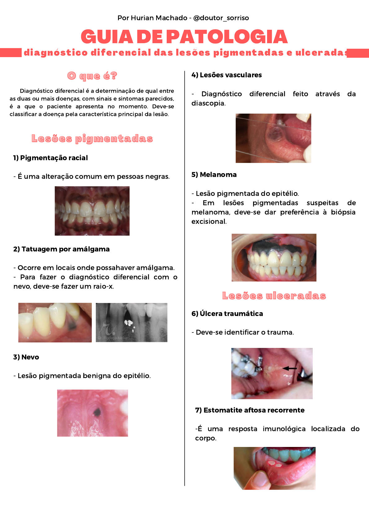 GUIA DE PATOLOGIA O q u e é?O q u e é?O q u e é? Diagnóstico diferencial é a determinação de qual entre as duas ou mais doenças, com sinais e sintomas parecidos, é a que o paciente apresenta no momento. Deve-se classificar a doença pela característica principal da lesão. Por Hurian Machado - @doutor_sorriso d i a g n ó s t i c o d i f e r e n c i a l d a s l e s õ e s p i g m e n t a d a s e u l c e r a d a s L e s õ e s p i g m e n t a d a sL e s õ e s p i g m e n t a d a sL e s õ e s p i g m e n t a d a s 1) Pigmentação racial - É uma alteração comum em pessoas negras. 2) Tatuagem por amálgama - Ocorre em locais onde possahaver amálgama. - Para fazer o diagnóstico diferencial com o nevo, deve-se fazer um raio-x. 3) Nevo - Lesão pigmentada benigna do epitélio. 4) Lesões vasculares - Diagnóstico diferencial feito através da diascopia. 5) Melanoma - Lesão pigmentada do epitélio. - Em lesões pigmentadas suspeitas de melanoma, deve-se dar preferência à biópsia excisional. L e s õ e s u l c e r a d a sL e s õ e s u l c e r a d a sL e s õ e s u l c e r a d a s 6) Úlcera traumática - Deve-se identificar o trauma. 7) Estomatite aftosa recorrente -É uma resposta imunológica localizada do corpo. Oi, aqui é o Hurian! Espero que esse resumo seja útil e te ajude nos estudos. Uma dica: tenha ele no celular, para consultar sempre que quiser e precisar. Esse é um resumo breve e específico de um assunto da disciplina de patologia. Caso você tenha gostado desse material, eu tenho 27 apostilas super completas de diversas disciplinas do curso de Odontologia que podem te ajudar nos estudos. Essas apostilas são ideias para acadêmicos que estão na graduação e para cirurgiões-dentistas que buscam aprovação em concurso público. Quer saber mais sobre como adquirir o material completo? Me manda uma mensagem lá no Instagram (@doutor_sorriso) ;) R e f e r ê n c i a s :R e f e r ê n c i a s :R e f e r ê n c i a s : NEVILLE, Brad. Patologia oral e maxilofacial. Elsevier Brasil, 2011. Por Hurian Machado - @doutor_sorriso 9) Úlcera por câncer - Ferida na boca que não cicatriza em mais de 3 semanas. - O diagnóstico é feito através da biópsia excisional. 8) Úlcera por infecção - Causada pela sífilis. - Deve-se fazer o exame VDRL para obter o diagnóstico.