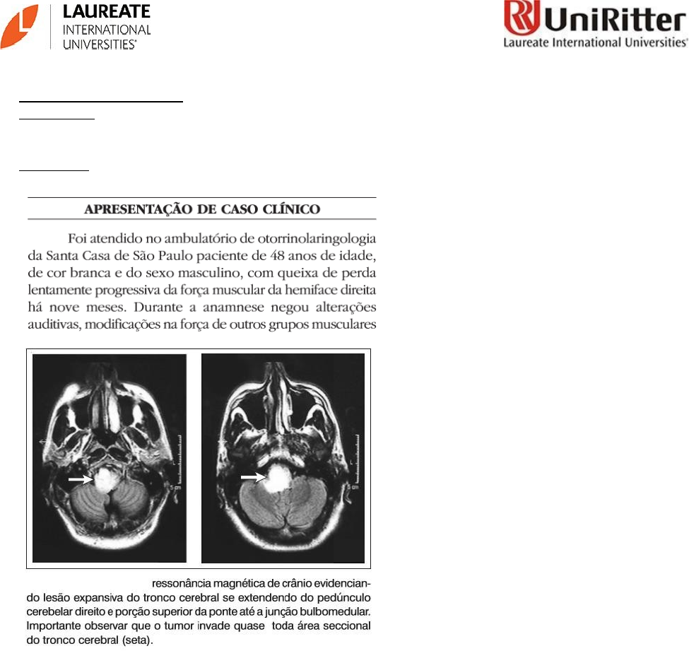 Nome:Priscila Fogça Fiorese Enfermagem Caso Clínico fonte: http://www.scielo.br/scielo.php?script=sci_arttext&pid=S0034-72992002000100024 Após a leitura do caso clínico, o aluno deverá cumprir, as etapas a seguir: 1) Pesquisar o tema nas seguintes bibliografias indicadas: GUYTON, Arthur C.; HALL, John E. Tratado de Fisiologia Médica. 13. ed. Rio de Janeiro, RJ: Elsevier 2017. ISBN 9788595151567. Disponível em: https://integrada.minhabiblioteca.com.br/#/books/9788595151567/. Acesso em: 28 Jul 2020. TORTORA, G. J.; GRABOWSKI, S. R. Corpo Humano: fundamentos de anatomia e fisiologia. 10.ed. Porto alegre, RS: Artmed, 2016. JUNQUEIRA, Luiz Uchoa, CARNEIRO, José. Histologia Básica, 12ª edição. Guanabara Koogan, 2013. [Minha Biblioteca]. Capítulo: Tecido nervoso DÂNGELO José Geraldo, FATTINI Carlo Américo. Anatomia humana sistêmica e segmentar. 3 ed. São Paulo: Atheneu, 2007. Capítulo: Sistema Nervoso MOORE, Keith; DALLEY, Arthur F; AGUR, Anne M.R. Anatomia orientada para a clínica. 7. ed. Rio deJaneiro: Guanabara Koogan, 2014 [Minha Biblioteca]. 2) Responder questões referentes ao tema abordado a. 1.Conforme o caso, o indivíduo realizou uma ressonância magnética, para avaliação do tumor. Defina os planos de secções (cortes) utilizados para estudo neste tipo de exame. 3) Os planos utilizados na Ressonância magnética são os Planos Axial, Coronal e Sagital. a. 2. Analise o exame do caso clínico e cite a secção presente na imagem, da ressonância magnética. 4) O plano presente na imagem do caso clínico é o plano Axial ou transverso. a. O exame de imagem evidenciou um comprometimento do tronco encefálico. Faça um mapa conceitual da divisão do Sistema Nervoso, detalhando ainda, as partes do tronco encefálico. Quais as células que constituem o tecido nervoso? O tecido nervoso é composto por células nervosas (Neurônios), unidades funcionais responsáveis pela coordenação das atividades, e pelas células da Glia, no qual tem atividades relacionadas com os neurônios, onde são os Astrócitos, Oligodendrócitos, Células de Shawann, Micróglias e Células Ependimárias. b. O paciente apresenta paralisia do nervo facial. Explique do ponto de vista histológico, o que é um nervo. Nervos são estruturas anatômicas do corpo humano distribuídas em filamentos por todo corpo, formado a partir do prolongamento de múltiplos axônios e detritos neurais, responsáveis por distribuir no corpo todos impulsos elétricos nervosos, assim garantindo a comunicação entre o sistema nervoso central e órgãos efetores e de sensibilidade. c. Analise os sintomas do caso clínico e explique a relação com o tumor no tronco encefálico. Esse tipo de tumor apresenta crescimento anormal de células dentro do crânio que leva a compressão e destruição de células saudáveis do cérebro. As características da doença são dor, falta de coordenação, fraqueza e rigidez muscular, convulsão, agitação motora entre outros. Ele pode ser caracterizado como primário, onde o tumor está localizado no próprio crânio, e tumor metastático ou secundário, quando o tumor tem origem em outro órgão e se espalha por outros órgãos do corpo. d. Para que uma informação seja passada de um neurônio para outro, a transmissão de impulso nervoso, envolve um mecanismo denominado potencial de ação. Explique a fase de despolarização e repolarização da membrana celular. R: A fase de despolarização da membrana é quando um neurônio recebe um impulso elétrico do tipo limiar ou supralimear, sua d.d.p de repouso é elevada ate é limitar de despolarização, os canais de sódio (Na+) são abertos na membrana, com isso uma grande quantidade de sódio entra na célula tornando seu interior mais positivo e seu exterior mais negativo. Já na fase de Repolarização os canais de sódio são estimulados a serem fechados pela grande quantidade de sódio já presente na célula, assim abrindo os canais de Potássio (K+) e fazendo sua liberação. A bomba de sódio e potássio funciona transportando três moléculas de Na+ para o exterior e recolocando duas moléculas de K+ no interior da célula, transformando seu interior agora mais negativo e seu exterior positivo. Há gasto de energia e aumento da atividade metabólica celular para obtenção de suprimento energético, a ATP é quebrada, liberando fosfato (Pi), ADP e energia necessária para o transporte de íons e. A comunicação rápida e precisa entre neurônios é possível devido a dois mecanismos: condução axonal e transmissão sináptica. As sinapses são estruturas especializadas que permitem comunicação elétrica entre células excitáveis. Elas se subdividem em sinapse elétrica e sinapse química. Diferencie-as e correlacione com o seu papel na transmissão da informação. Na Sinapse elétrica correntes elétricas passam pelas junções comunicantes até chegarem em outras células através de canais que interligam as mesmas, com um retorno nulo na transmissão, atuando em atividade sincronizada de vários neurônios, células musculares lisas ou cardíacas. Já nas sinapses químicas a transmissão ocorre através de Neurotransmissores. As vesículas contendo neurotransmissores são liberadas na fenda sináptica e reconhecidas por receptores químicos (proteínas especificas) na membrana na célula pós-sináptica, assim se fundindo e liberando seu conteúdo. Este grupo de atividades práticas supervisionadas totalizam 22h, que deverão ser desenvolvidas ao longo do semestre.