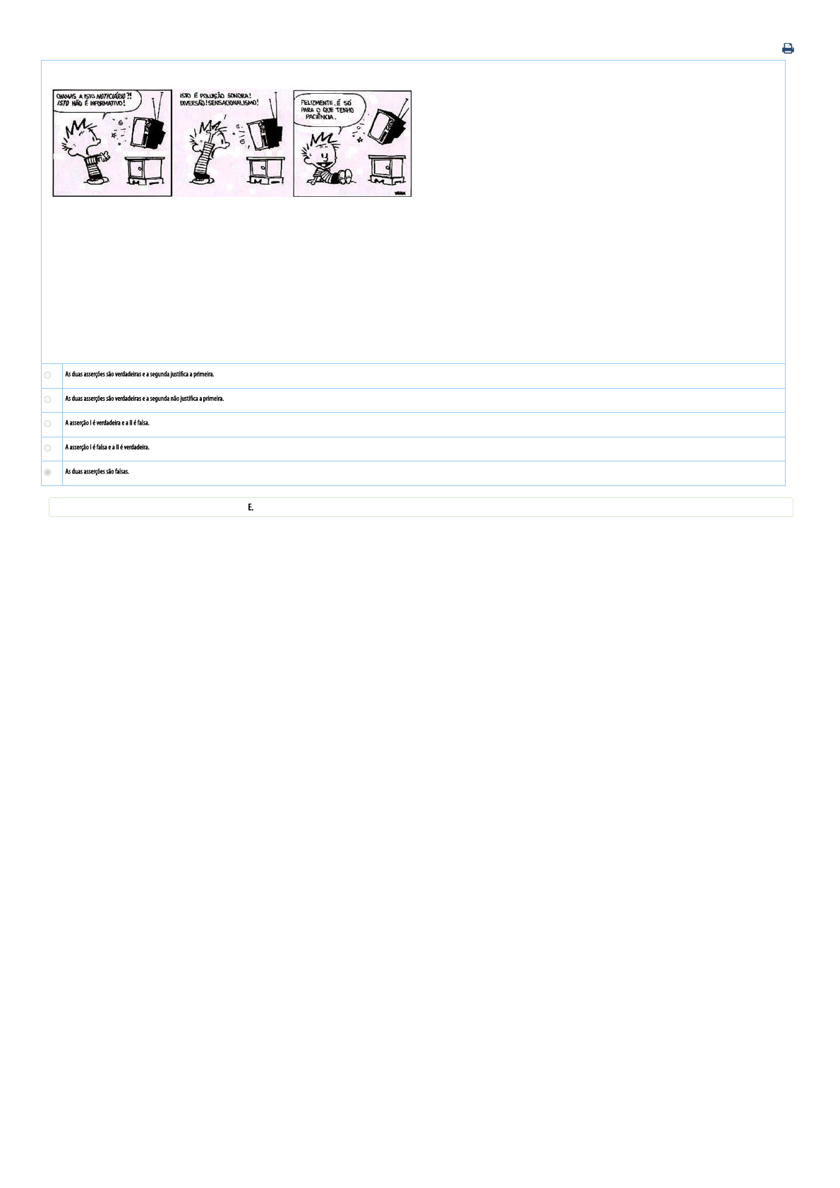 20/09/2020 Universidade Paulista - UNIP : Disciplina On-line. https://unip.br/presencial/central/Interna.aspx 1/1 Leia os quadrinhos e o trecho a seguir, que expõe o pensamento do professor e jornalista Ciro Marcondes Filho. Disponível em: <http://sites.uai.com.br/app/noticia/saudeplena/noticias/2014/03/10/noticia_saudeplena,147743/pesquisa-usa-personagens-de-tirinhas-para-explicar-funcao-de-estereoti.shtml>. Acesso em: 8 nov. 2014. Marcondes Filho (1986) descreve a prática sensacionalista como nutriente psíquico, desviante ideológico e descarga de pulsões instintivas. Caracteriza sensacionalismo como “o grau mais radical da mercantilização da informação: tudo o que se vende é aparência e, na verdade, vende-se aquilo que a informação interna não irá desenvolver melhor do que a manchete. Esta está carregada de apelos às carências psíquicas das pessoas e explora-as de forma sádica, caluniadora e ridicularizadora. (...) No jornalismo sensacionalista, as notícias funcionam como pseudoalimentos às carências do espírito. (...) O jornalismo sensacionalista extrai do fato, da notícia, a sua carga emotiva e apelativa e a enaltece. Fabrica uma nova notícia que a partir daí passa a se vender por si mesma”. Disponível em: <http://www.wejconsultoria.com.br/site/wp-content/uploads/2013/04/Danilo-Angrimani-Sobrinho-Espreme-que-sai-sangue>. Acesso em: 8 nov. 2014. Com base na leitura e nos seus conhecimentos, analise as asserções e assinale a alternativa correta I A reação do personagem diante da televisão revela uma visão antagônica àquela apresentada por Marcondes Filho sobre o sensacionalismo. PORQUE II De acordo com Marcondes Filho, as notícias sensacionalistas suprem as carências de informação dos receptores, uma vez que são comprometidas com os elementos factuais essenciais. A As duas asserções são verdadeiras e a segunda justi�ca a primeira. B As duas asserções são verdadeiras e a segunda não justi�ca a primeira. C A asserção I é verdadeira e a II é falsa. D A asserção I é falsa e a II é verdadeira. E As duas asserções são falsas. Você já respondeu e acertou esse exercício. A resposta correta é: E.