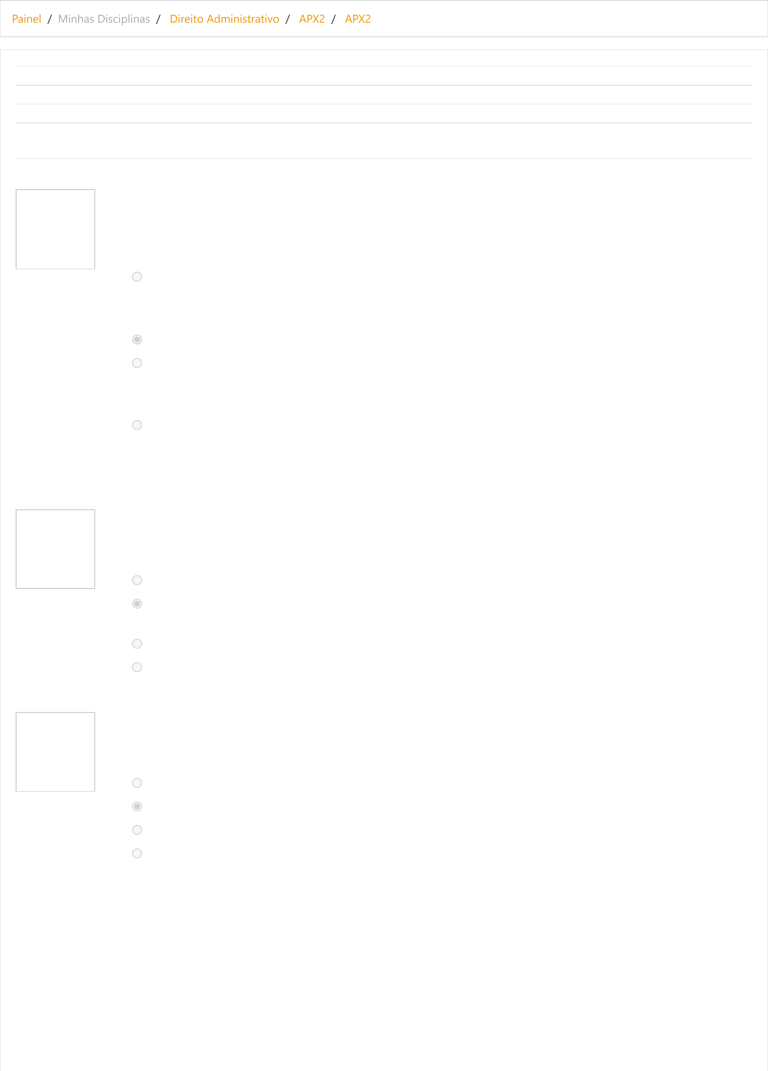 Painel / Minhas Disciplinas / Direito Administrativo / APX2 / APX2 Questão 1 Correto Atingiu 0,50 de 0,50 Questão 2 Correto Atingiu 0,50 de 0,50 Questão 3 Correto Atingiu 0,50 de 0,50 Iniciado em sábado, 5 dez 2020, 17:22 Estado Finalizada Concluída em sábado, 5 dez 2020, 17:48 Tempo empregado 25 minutos 45 segundos Avaliar 9,50 de um máximo de 10,00(95%) Aquele que a lei confere à Administração Pública para a prática de ato de sua competência, determinando os elementos e requisitos necessários a sua formalização é chamado poder: Escolha uma opção: a. disciplinar. b. vinculado. c. discricionário. d. hierárquico. Como órgãos públicos, as Secretarias de Estado, dentro de suas regras de atuação: Escolha uma opção: a. possuem personalidade jurídica própria, razão pela qual podem exercer direitos e contrair obrigações b. expressam apenas a vontade da entidade estatal a que pertencem, po rém executam com total autonomia as suas funções específicas c. são dotadas de vontade própria e capazes de contrair obrigações e exer cer direitos d. são órgãos independentes e exercem precipuamente funções políticas O estágio probatório para fins de aquisição de estabilidade terá duração de: Escolha uma opção: a. 1 ano. b. 3 anos. c. 4 anos. d. 2 anos. https://graduacao.cederj.edu.br/ava/my/ https://graduacao.cederj.edu.br/ava/course/view.php?id=1529 https://graduacao.cederj.edu.br/ava/course/view.php?id=1529§ion=11 https://graduacao.cederj.edu.br/ava/mod/quiz/view.php?id=325919 Questão 4 Completo Não avaliada Questão 5 Correto Atingiu 0,50 de 0,50 Questão 6 Incorreto Atingiu 0,00 de 0,50 Questão 7 Correto Atingiu 0,50 de 0,50 Questão 8 Correto Atingiu 0,50 de 0,50 Assumo o compromisso de confidencialidade e de sigilo escrito, fotográfico e verbal sobre as questões do exame ou avaliação pessoais que me serão apresentadas, durante o curso desta disciplina. Comprometo-me a não revelar, reproduzir, utilizar ou dar conhecimento, em hipótese alguma, a terceiros e a não utilizar tais informações para gerar benefício próprio ou de terceiros. Reitero minha ciência de que não poderei fazer cópia manuscrita, registro fotográfico, filmar ou mesmo gravar os enunciados que me são apresentados. Declaro, ainda, estar ciente de que o não cumprimento de tais normas caracterizará infração ética podendo acarretar punição nas esferas penal, civil e administrativa de acordo com a legislação vigente. Dê seu ciente aqui: Ciente O servidor público efetivo poderá se aposentar voluntariamente, com proventos proporcionais ao tempo de contribuição, quando tiver o tempo mínimo de dez anos de efetivo exercício no serviço público, 5 anos no cargo efetivo em que se dará a aposentadoria e a seguinte idade: Escolha uma opção: a. Setenta e cinco anos, independentemente do sexo. b. Sessenta anos, se homem, ou cinquenta e cinco anos, se mulher. c. Sessenta anos, se professor, ou cinquenta e cinco anos, se professora. d. Sessenta e cinco anos, se homem, ou sessenta anos, se mulher. O servidor efetivo poderá se aposentar voluntariamente quando tiver o tempo mínimo de dez anos de efetivo exercício no serviço público e 5 anos no cargo efetivo em que se dará a aposentadoria. Além disso, para ter proventos calculados com base na média dos salários de contribuição, deverá ter: Escolha uma opção: a. Sessenta anos de idade, se homem, ou cinquenta e cinco anos, se mulher. b. Setenta e cinco anos de idade, independentemente do sexo. c. Sessenta anos de idade, se professor, ou cinquenta e cinco anos, se professora. d. Sessenta e cinco anos de idade, se homem, ou sessenta anos, se mulher. Ato adequado aos que venham a se vincular ao Poder Público ocupando cargo efetivo: Escolha uma opção: a. Contratação. b. Nomeação. c. Diplomação. d. Designação. É o elemento exteriorizador do Ato Administrativo, o modo pelo qual ele se apresenta: Escolha uma opção: a. Recurso. b. Finalidade. c. Forma. d. Competência. Questão 9 Correto Atingiu 0,50 de 0,50 Questão 10 Correto Atingiu 0,50 de 0,50 Questão 11 Correto Atingiu 0,50 de 0,50 Questão 12 Correto Atingiu 0,50 de 0,50 Questão 13 Correto Atingiu 0,50 de 0,50 A aposentadoria será com proventos integrais, no caso de invalidez permanente, quando: Escolha uma opção: a. Decorrente de acidente em serviço, moléstia profissional ou doença gra ve, contagiosa ou incurável, especificada em lei. b. O servidor for portador de deficiência física adquirida após o ingresso no serviço público. c. O servidor tiver ingressado no serviço mediante concurso público. d. Decorrente de doença profissional, grave, contagiosa e incurável, nos ter mos das conclusões da medicina especializada. A que corresponde a Rescisão Unilateral do Contrato Administrativo (arts. 58, inciso II, e 80, I e II, da lei 8.666/93)? Escolha uma opção: a. À supremacia do interesse público, sendo exigida sempre a motivação por parte do administrador público. b. À aplicação de uma penalidade, imposta pela Constituição Federal / 1988, em razão de descumprimento do contrato pelo contratado. c. À modificação externa da sociedade. d. À inadimplência do contratante. São Princípios da Administração Pública Brasileira, dentre outros: Escolha uma opção: a. Princípio da Liberdade das Formas e Princípio do Ufanismo. b. Princípio do Procedimento Formal e Princípio da Árvore dos Frutos venenosos. c. Princípio da Morosidade e Princípio da Vinculação ao Instrumento Convocatório. d. Princípio da Vinculação ao Instrumento Convocatório e Princípio do Julgamento Objetivo. O ato pelo qual a Administração Pública concretiza o seu interesse em investir alguém no exercício de um cargo, emprego ou função pública é denominado: Escolha uma opção: a. Aproveitamento. b. Emolumento. c. Desprovimento. d. Provimento A chamada Administração indireta, na área federal, em face do Decreto‑Lei n° 20