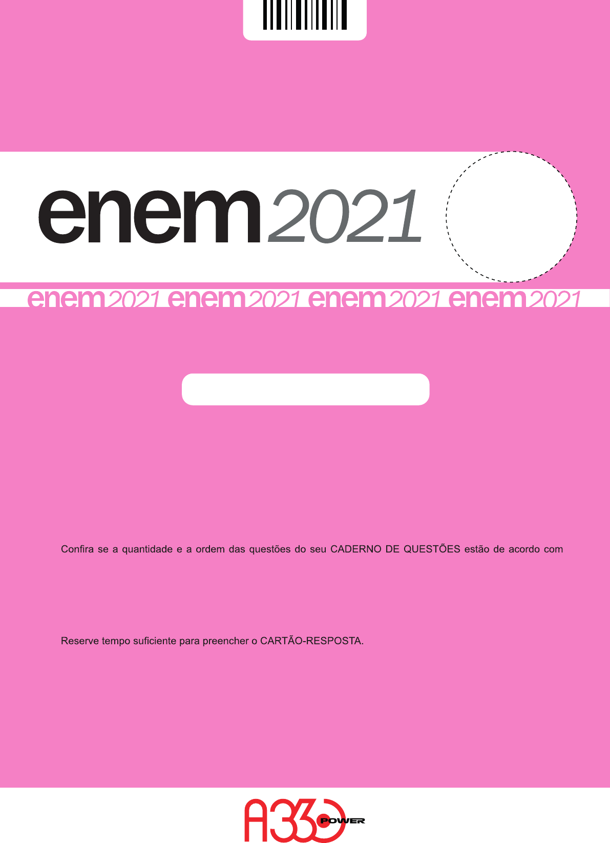 A DOR PASSA. A APROVAÇÃO FICA! 13 DE FEVEREIRO DE 2021 2 ROSA 2º DIA CADERNO SIMULADO EXAME NACIONAL DO ENSINO MÉDIO PROVA DE CIÊNCIAS DA NATUREZA E SUAS TECNOLOGIAS PROVA DE MATEMÁTICA E SUAS TECNOLOGIAS LEIA ATENTAMENTE AS INSTRUÇÕES SEGUINTES: 1. Este CADERNO DE QUESTÕES contém 90 questões numeradas de 91 a 180 e uma FOLHA DE RASCUNHO, dispostas da seguinte maneira: a) questões de número 91 a 135, relativas à área de Ciências da Natureza e suas Tecnologias; b) questões de número 136 a 180, relativas à área de Matemática e suas Tecnologias; c) FOLHA DE RASCUNHO. 2. as instruções anteriores. Caso o caderno esteja incompleto, tenha defeito ou apresente qualquer divergência, comunique ao aplicador da sala para que ele tome as providências cabíveis. 3. Para cada uma das questões objetivas, são apresentadas 5 opções. Apenas uma responde corretamente à questão. 4. O tempo disponível para estas provas é de cinco horas. 5. 6. Os rascunhos e as marcações assinaladas no CADERNO DE QUESTÕES e na FOLHA DE RASCUNHO não serão considerados na avaliação. 7. ,SEÕTSEUQ ED ONREDAC etse eugertne e rodacilpa o ramahc arap eneca ,savorp sa ranimret odnauQ o CARTÃO-RESPOSTA e a FOLHA DE RASCUNHO. 8. Você poderá deixar o local de prova somente após decorridas duas horas do início da aplicação e poderá levar seu CADERNO DE QUESTÕES ao deixar em definitivo a sala de prova nos 30 minutos que antecedem o término das provas. .................................................................................................................................................................................................. .................................................................................................................................................................................................. CIÊNCIAS DA NATUREZA E SUAS TECNOLOGIAS Questões de 91 a 135 ................................................................................... Questão 91 Em um jogo de futebol, o goleiro, para aproveitar um contra-ataque, arremessa a bola no sentido do campo adversário. Ela percorre, então, uma traje- tória parabólica, conforme representado na fi- gura, em 4 segundos. Desprezando a resistência do ar e com base nas in- formações apresentadas, podemos concluir que os módulos da velocidade ,V de lançamento, e da velocidade ,HV na altura máxima, são, em metros por segundos, iguais a, respectivamente, Dados: sen 0,8; cos 0,6. a) 15 e 25. b) 15 e 50. c) 25 e 15. d) 25 e 25. e) 25 e 50. Questão 92 Muitos smartphones e tablets não precisam mais de teclas, uma vez que todos os comandos podem ser dados ao se pressionar a própria tela. Inicial- mente essa tecnologia foi proporcionada por meio das telas resistivas, formadas basicamente por duas camadas de material condutor transparente que não se encostam até que alguém as pressione, modificando a resistência total do circuito de acordo com o ponto onde ocorre o toque. A ima- gem é uma simplificação do circuito formado pelas placas, em que A e B representam pontos onde o circuito pode ser fechado por meio do toque. Qual é a resistência equivalente no circuito provo- cada por um toque que fecha o circuito no ponto ?A a) 1,3 k b) 4,0 k c) 6,0 k d) 6,7 k e) 12,0 k .................................................................................................................................................................................. Questão 93 Considere, em um fragmento ambiental, uma árvore matriz com frutos ( )M e outras cinco que produziram flores e são apenas doadoras de pólen ( 1, 2, 3, 4DP DP DP DP e 5).DP Foi excluída a capacidade de autopolini- zação das árvores. Os genótipos da matriz, da semente ( 1)S e das prováveis fontes de pólen foram obtidos pela análise de dois locos (loco A e loco B) de marcadores de DNA, conforme a figura. .................................................................................................................................................................................................. .................................................................................................................................................................................................. A progênie 1S recebeu o pólen de qual doadora? a) 1DP b) 2DP c) 3DP d) 4DP e) 5DP .................................................................................................................................................................................. Questão 94 Em 2011, uma falha no processo de perfuração realizado por uma empresa petrolífera ocasionou derrama- mento de petróleo na bacia hidrográfica de Campos, no Rio de Janeiro. Os impactos decorrentes desse derramamento ocorrem porque os componentes do petróleo a) reagem com a água do mar e sofrem degradação, gerando compostos com elevada toxicidade. b) acidificam o meio, promovendo o desgaste das conchas calcárias de moluscos e a morte de corais. c) dissolvem-se na água, causando a mortandade dos seres marinhos por ingestão da água contaminada. d) têm caráter hidrofóbico e baixa densidade, impedindo as trocas gasosas entre o meio aquático e a atmos- fera. e) têm cadeia pequena e elevada volatilidade, contaminando a atmosfera local e regional em função dos ventos nas orlas marítimas. .................................................................................................................................................................................. .................................................................................................................................................................................................. .................................................................................................................................................................................................. Questão 95 Pesquisadores coletar